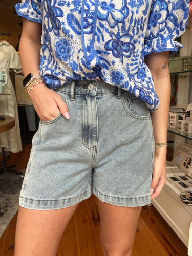 Denim high waist shorts. Classic button and zipper closure at front. Classic denim pockets at front and back. Unlined. Woven. Non-sheer. Lightweight.