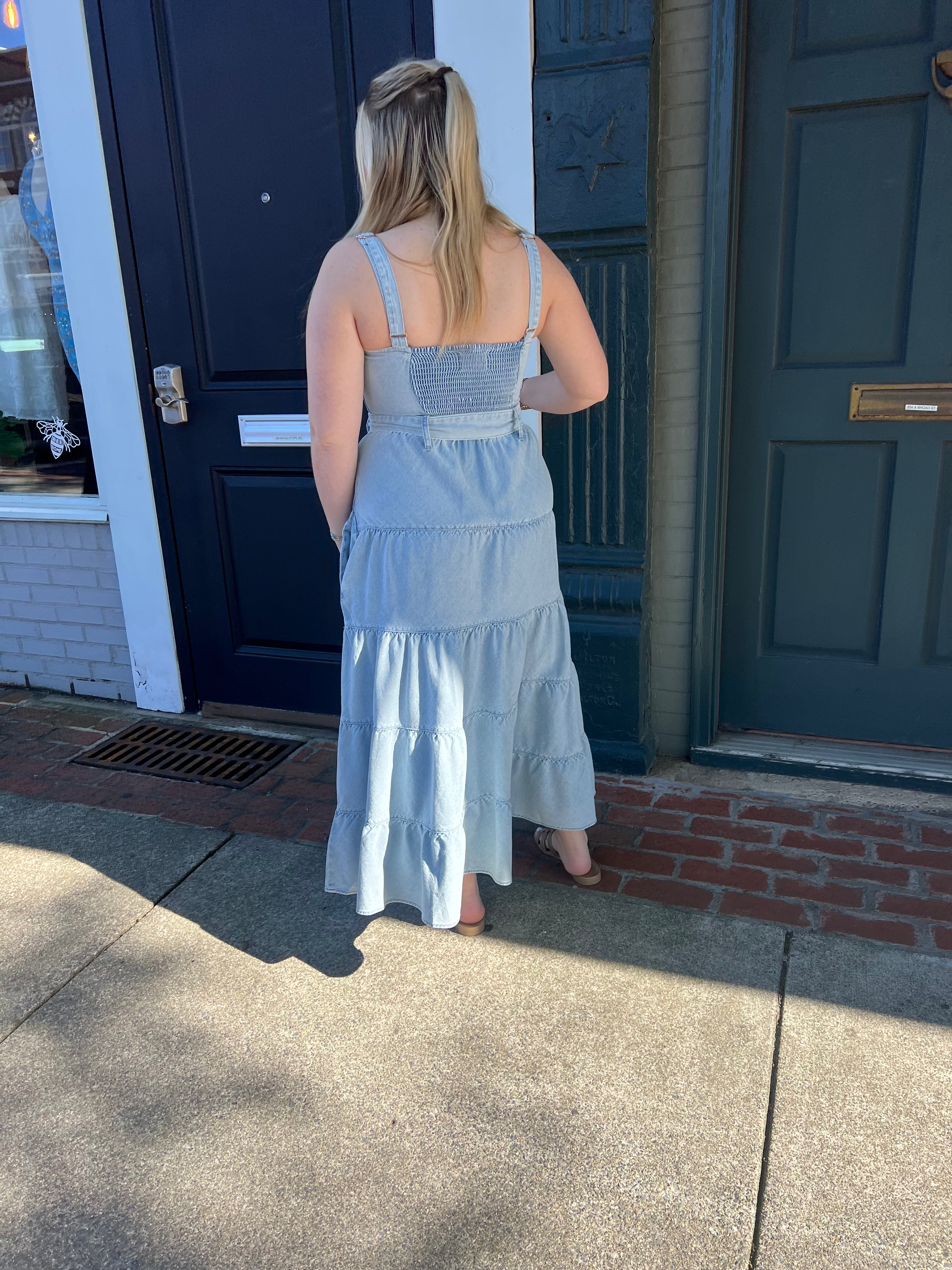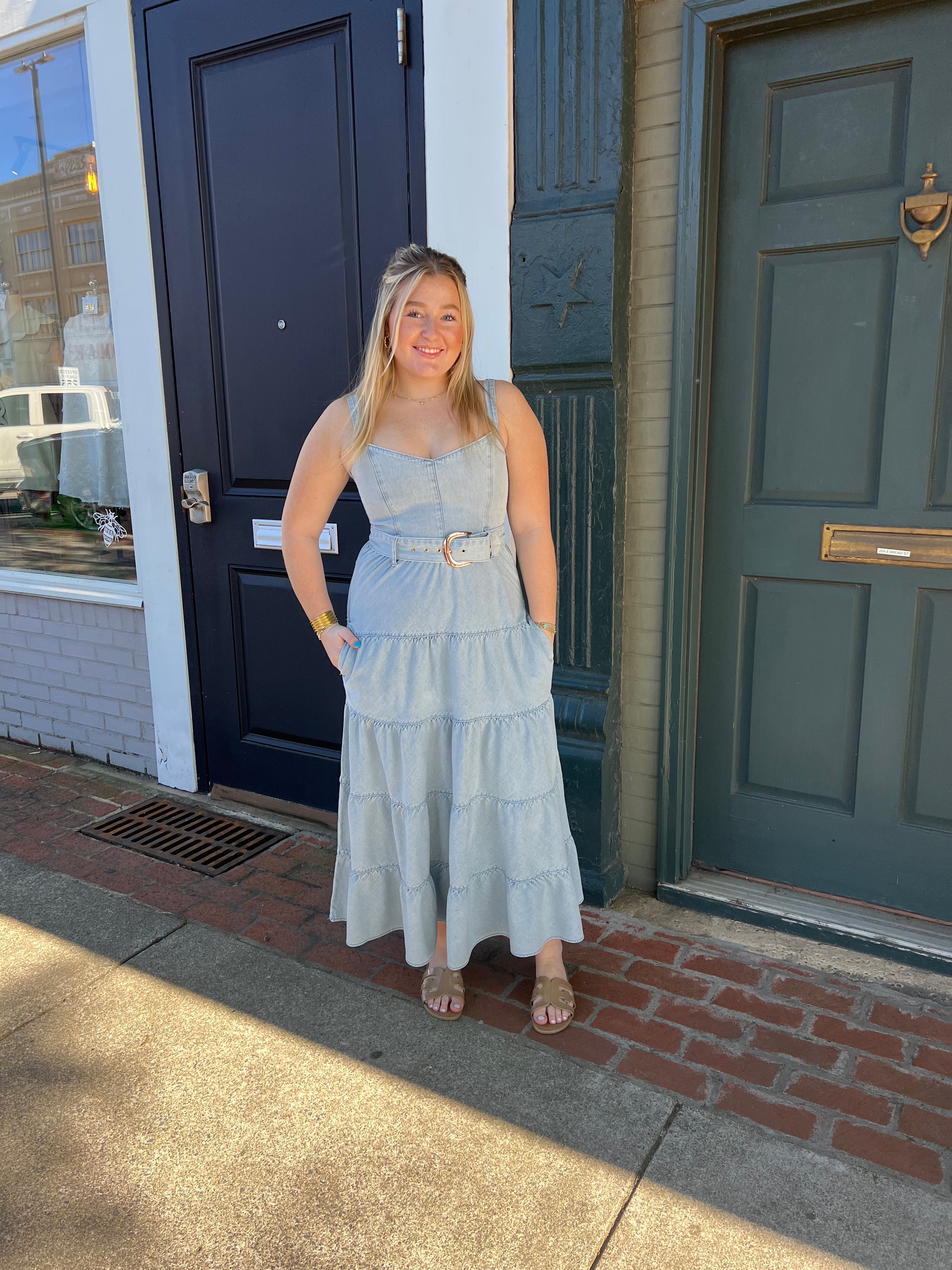 This light wash denim midi is every western babe’s dream! With a sweetheart neckline and an adjustable waist belt for the perfect flattering fit, it’s made to steal the show. Easily styled with your favorite cowgirl booties or heels.