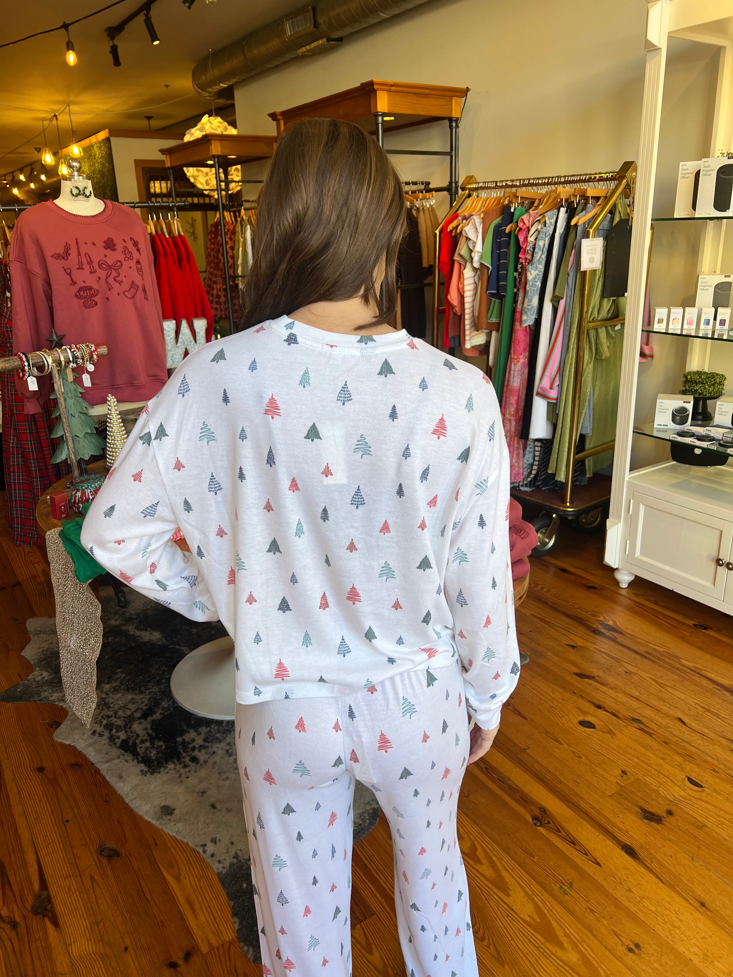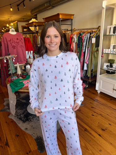 This brushed sweater knit brings a cozy feel with a touch of winter charm. Featuring a whimsical alpine tree print, this long-sleeve crewneck is ready for fireside lounging or festive weekends.