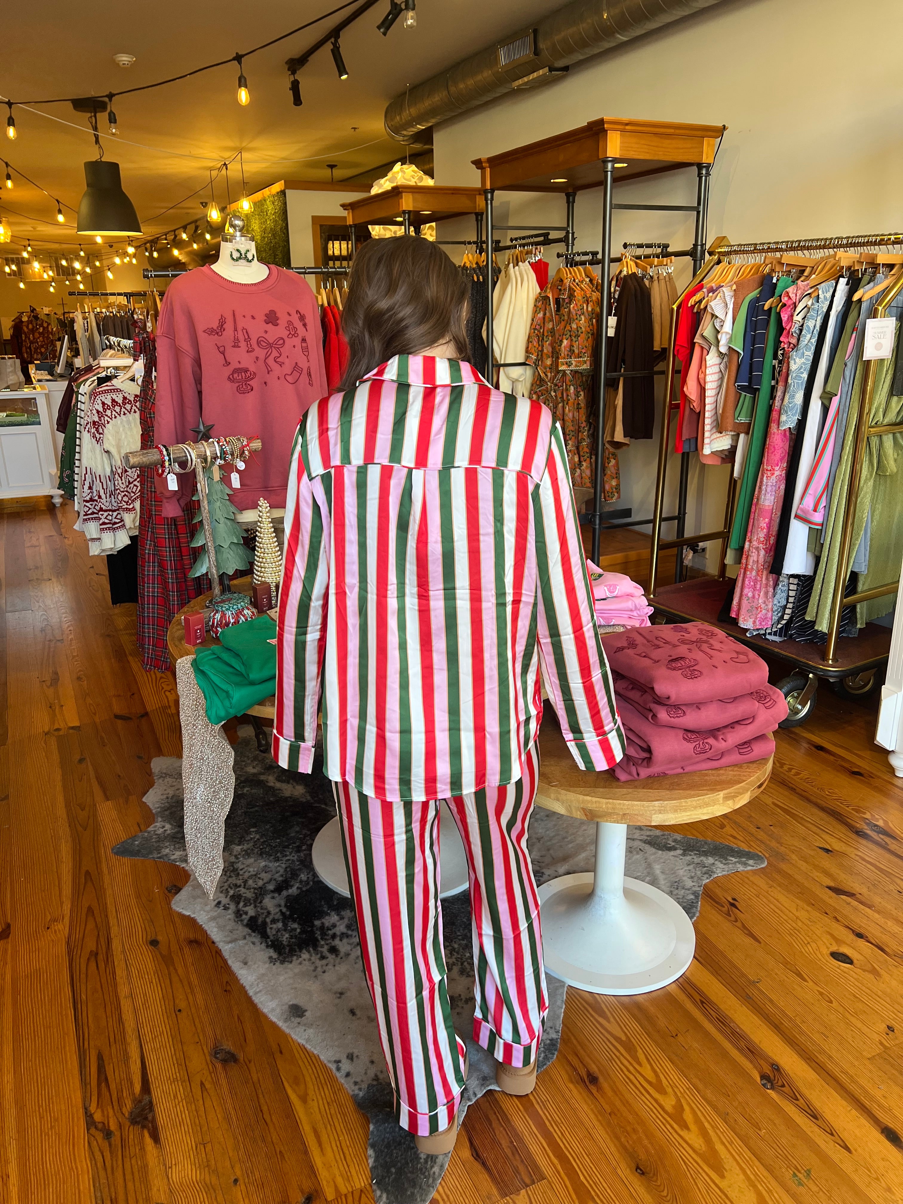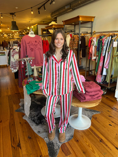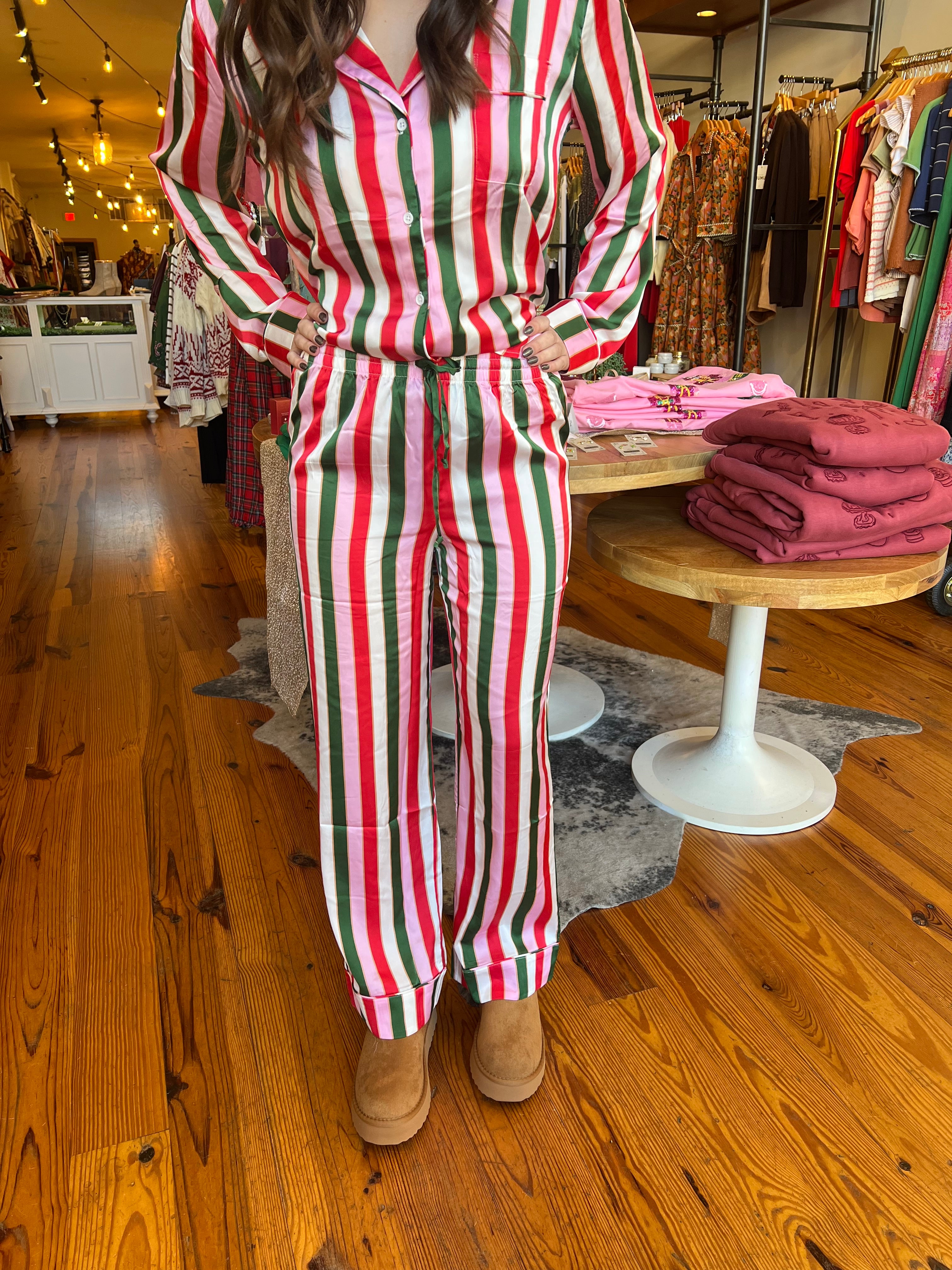 Sleep tight in these super silky button down pajamas! Sold as a set, these jolly stripe pjs have a drawstring and elastic waist.