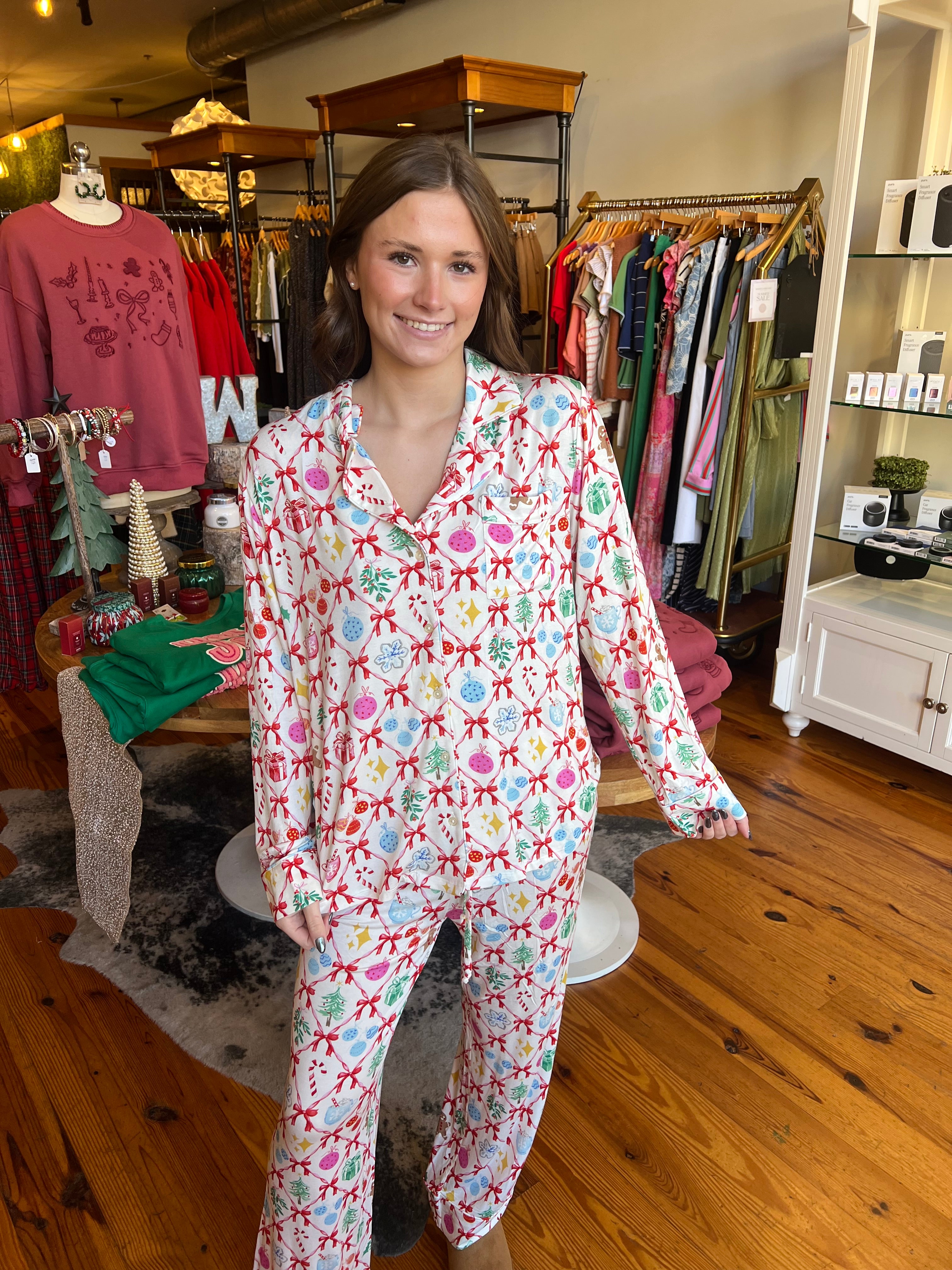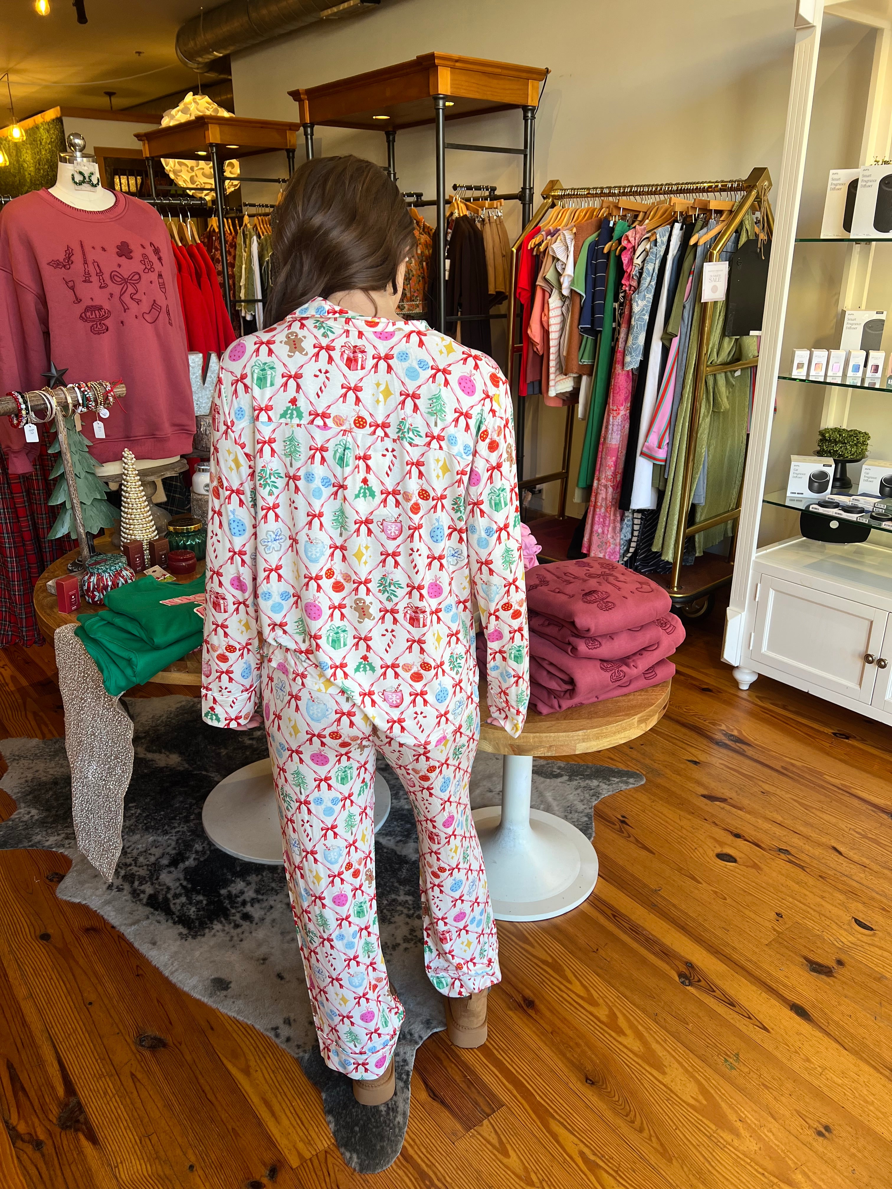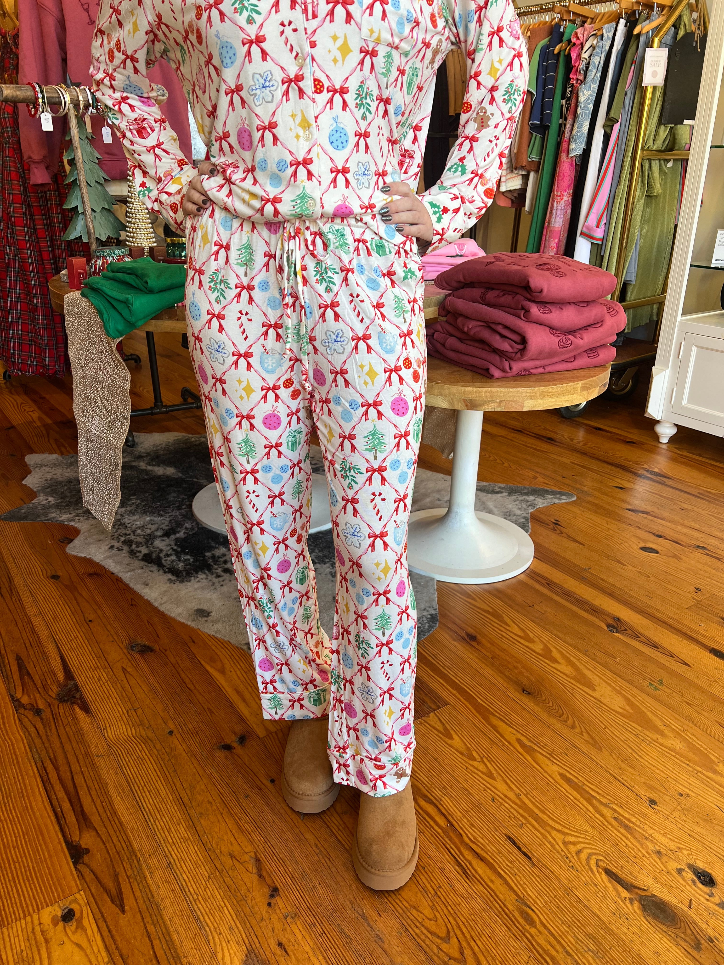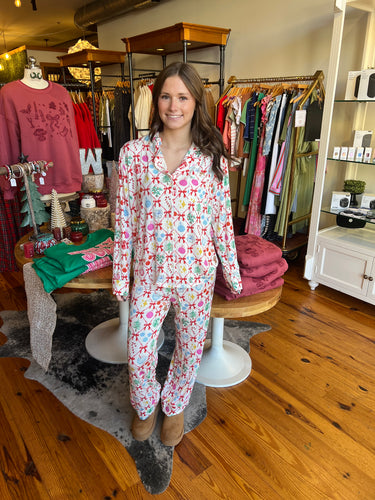 Sleep tight in these super soft button down pajamas! Sold as a set, these holiday ready pjs have a drawstring and elastic waist.