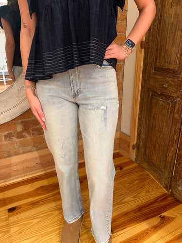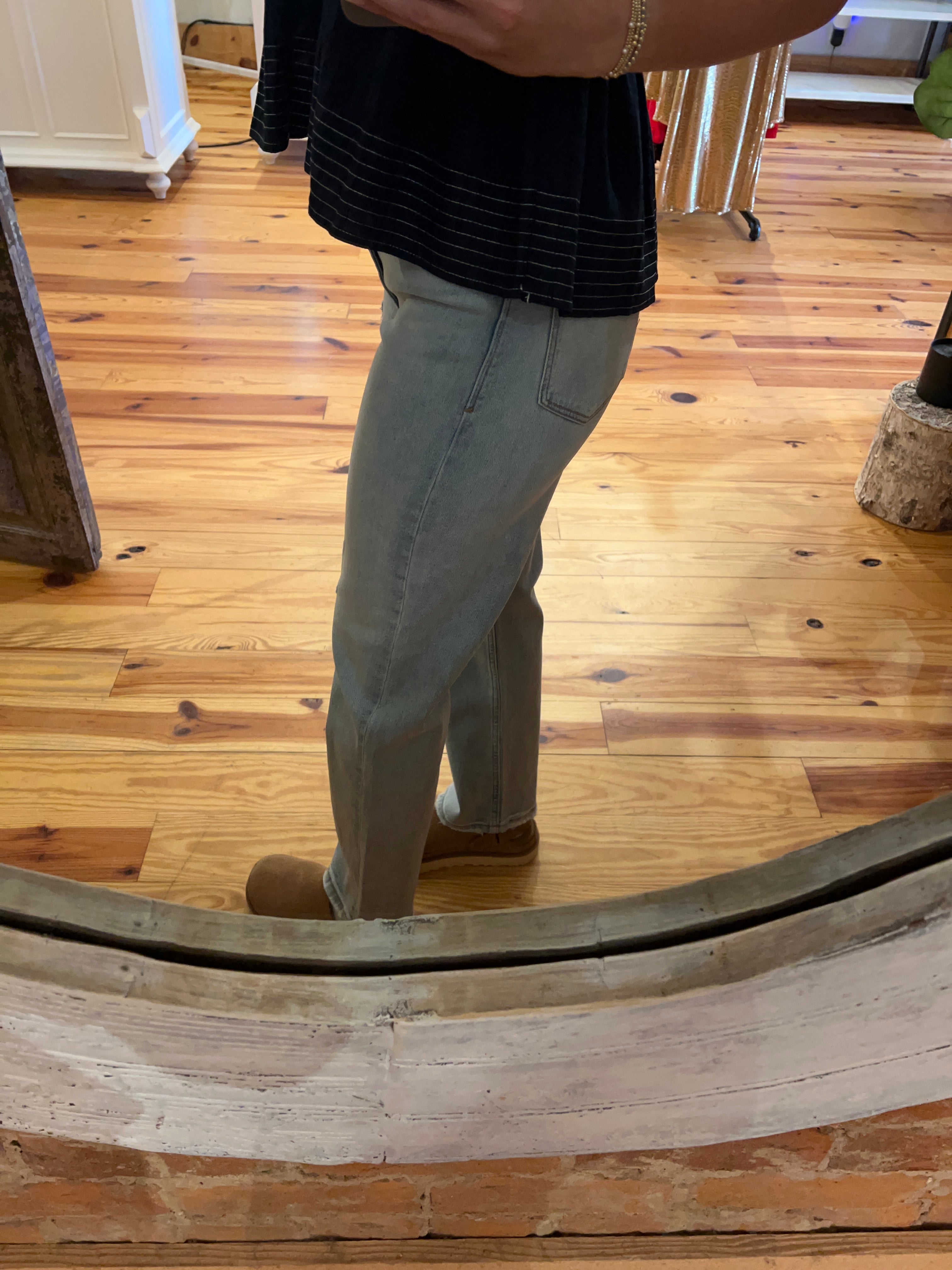 Ultra high rise ankle straight jeans. It's the genuine fit that sits at the true waist and easy fitting from the hip to mid thigh. Ankle inseam on comfort stretch denim accented with handsand whiskering at hip with light chevron, designer tearing along panel, easy grinding along pocket & hem.