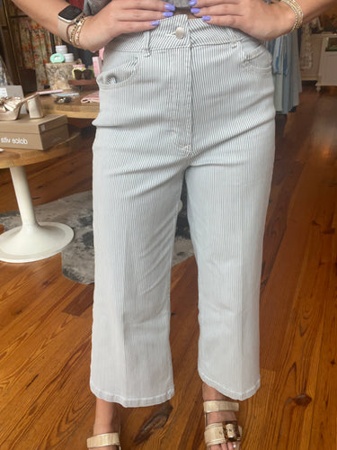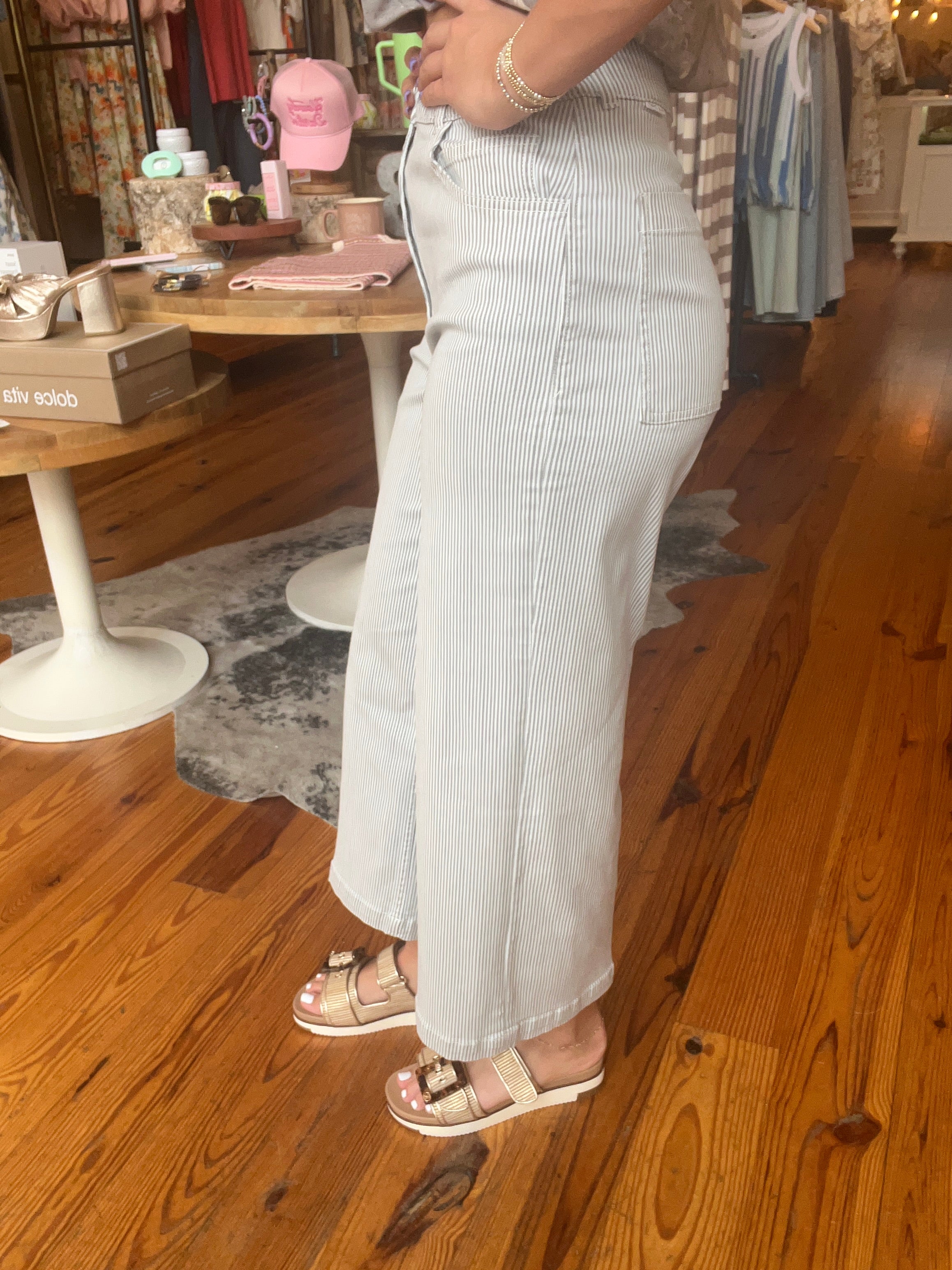 Audrey wide leg jeans in railroad stripes sophistication. High rise with clean hem, designed for both style and comfort. Crafted from a blend stretch denim for versatility & utility, ensuring a chic silhouette for any occasion offering a tailored look, making them a staple in comfortable clothing while experiencing both elegance and ease.