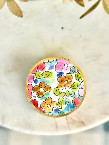 A wood and enamel trinket tray-measuring 5"-features floral artwork by Rachel Walker. Hand wash only. Mango wood.