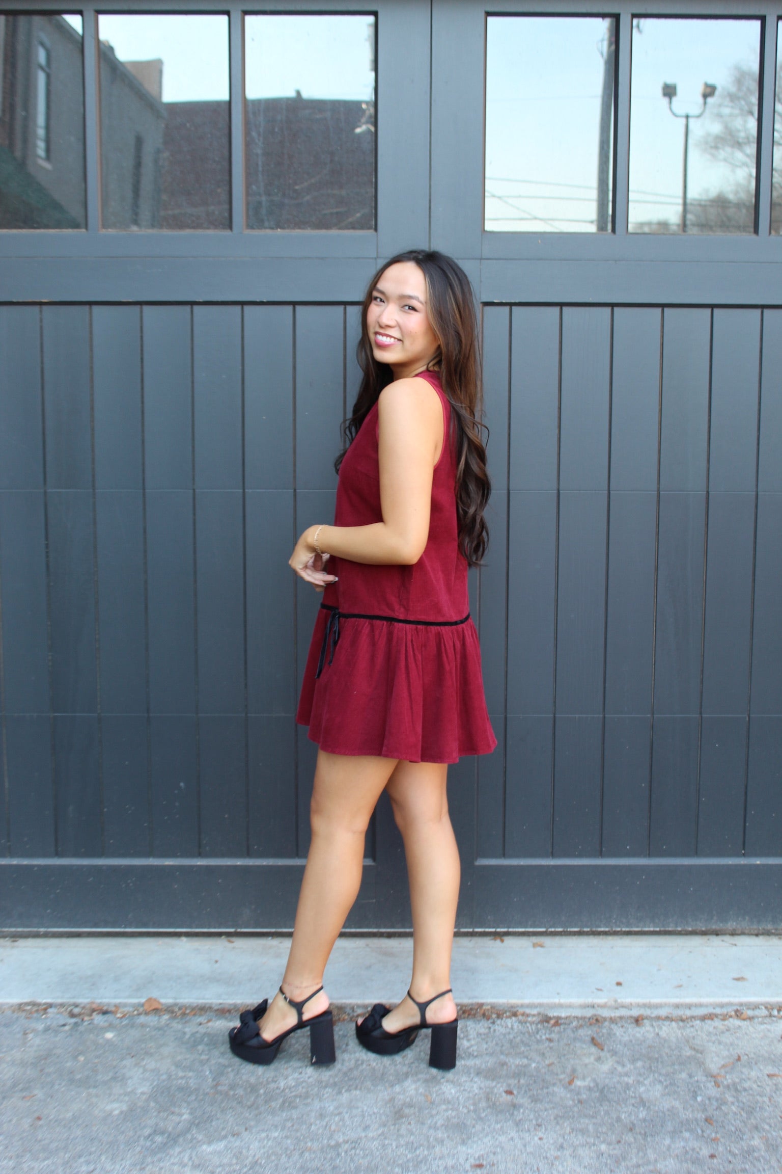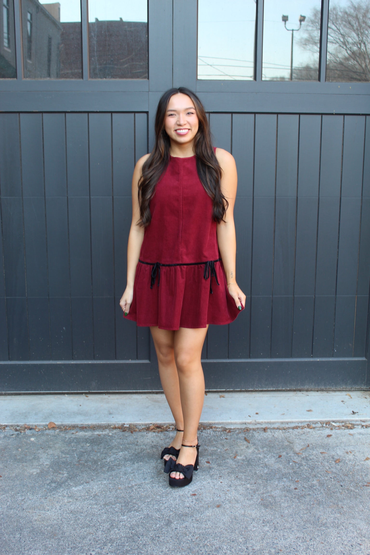 Corduroy mini dress with round neck, sleeveless cut, and drop waist flared hem. Finished with velvet taping and bow detail. Preppy and girly, yet easy to style with boots for a western look.