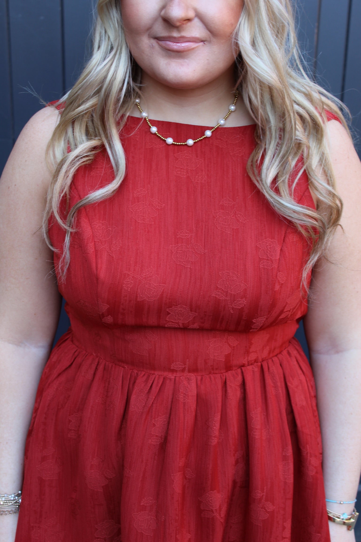 - Features a tonal floral jacquard fabric in red for subtle texture