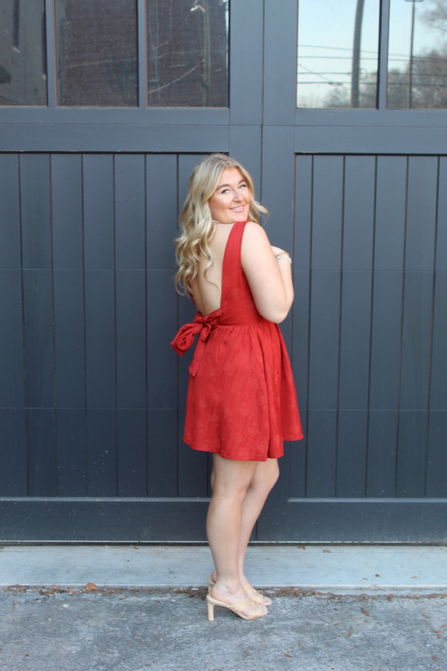 - Styled with a dramatic low scoop back and oversized self-tie bow detail