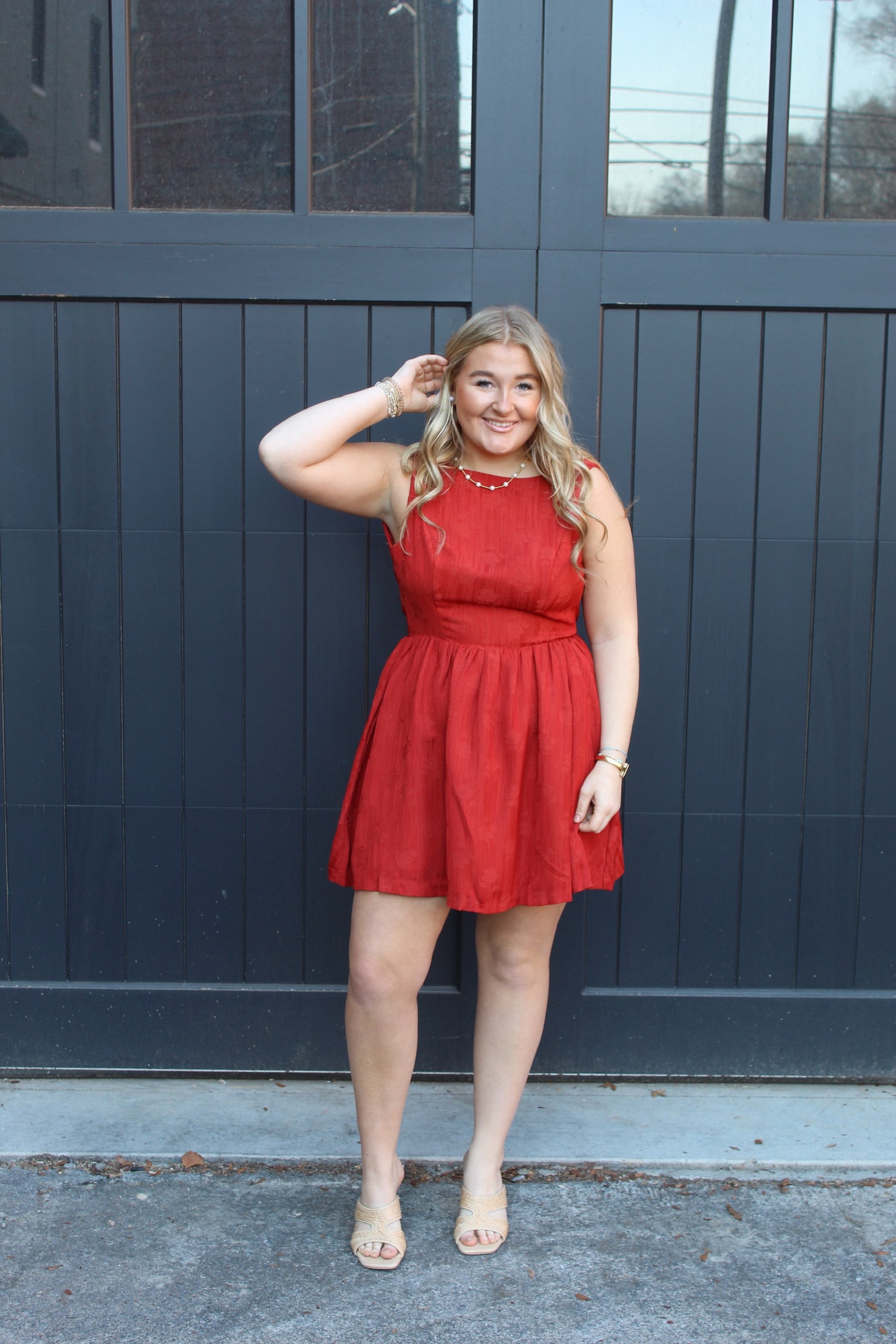 Fit-and-flare silhouette with a softly gathered skirt
