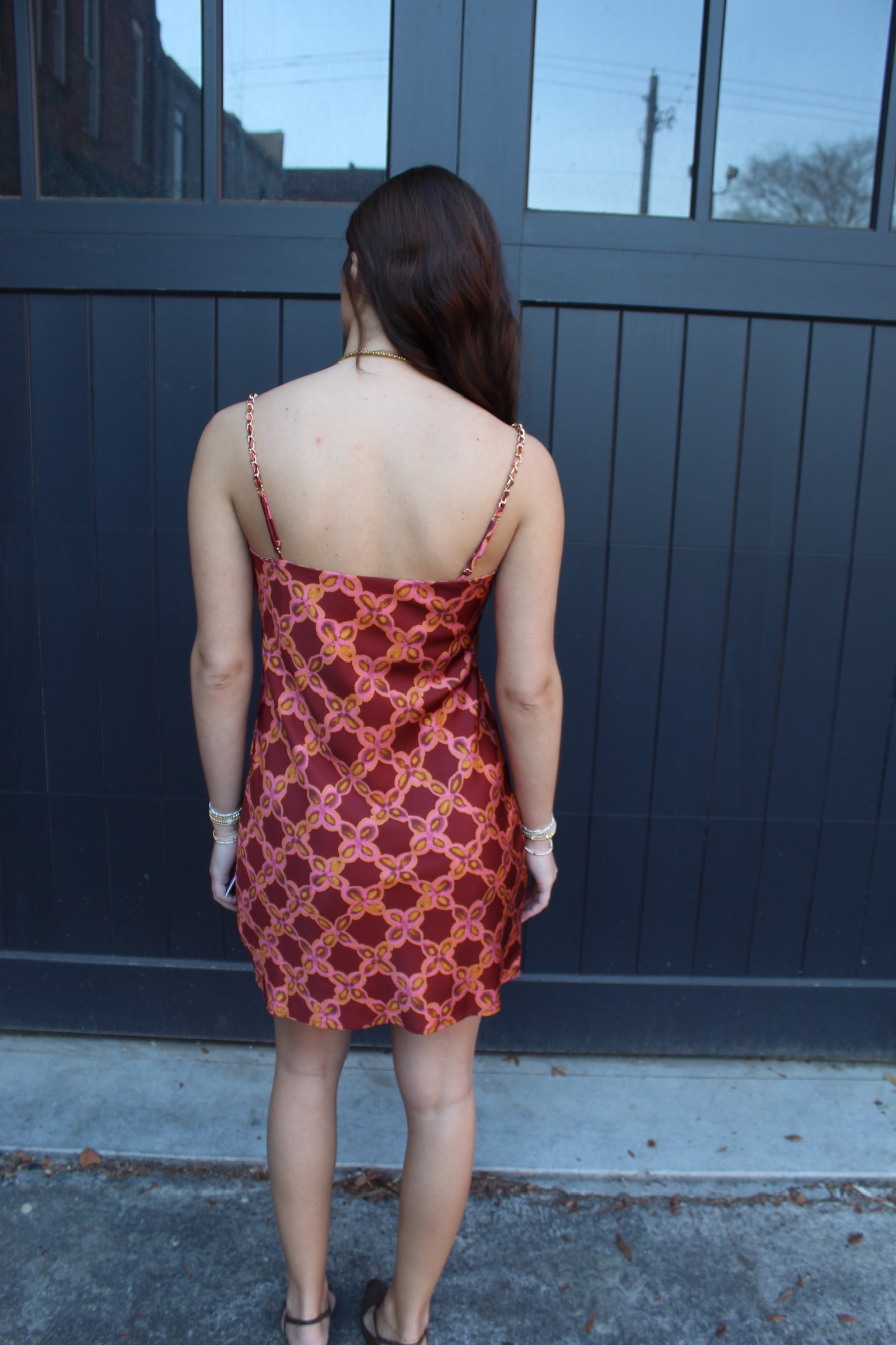 Chain strap cowl neck mini dress in an exclusive flower chain link checkered print on satin fabric This sleeveless mini slip dress features a cowl neck, adjustable strap with gold chain detail, and lining.