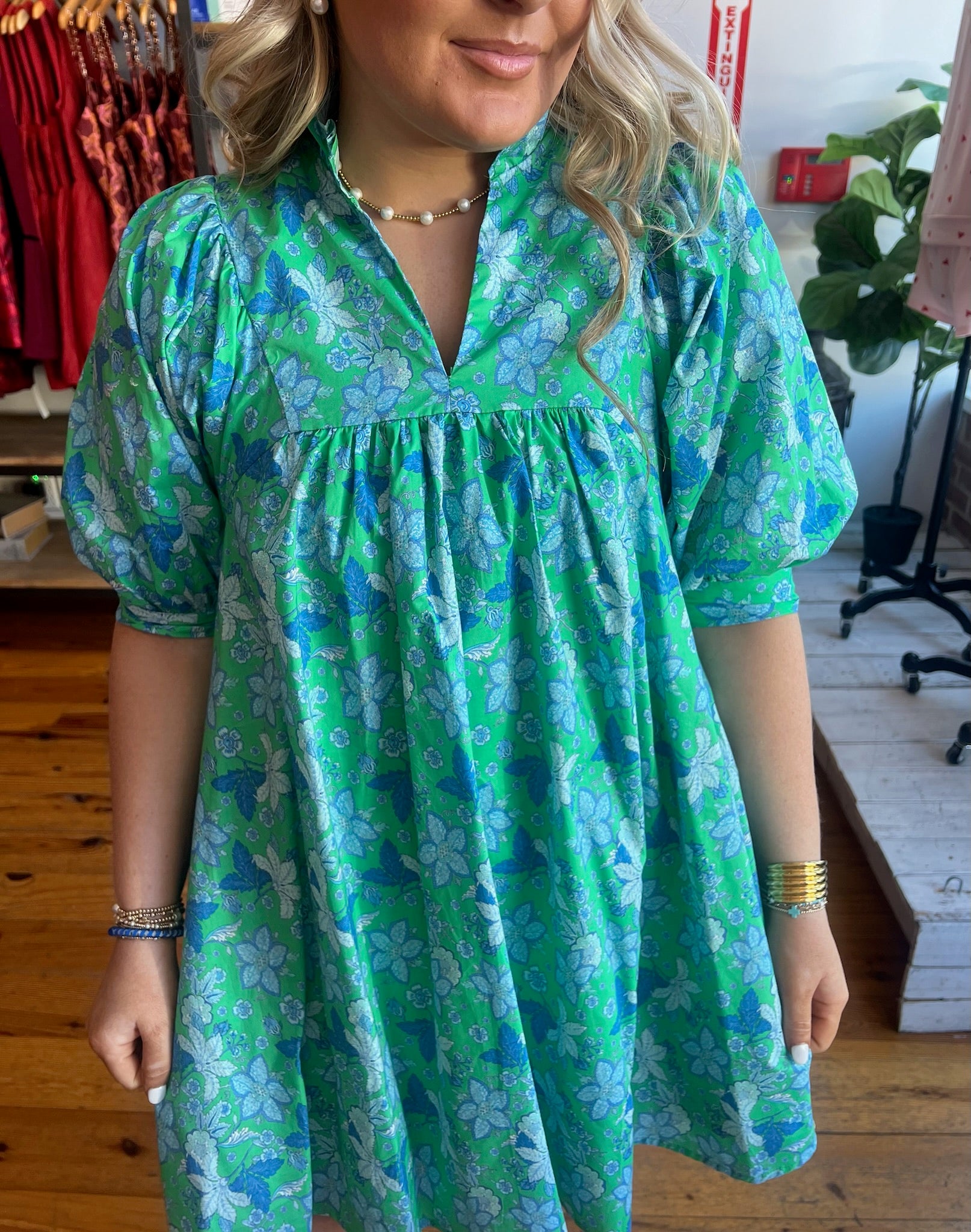 Floral print puff half sleeve mini dress featuring ruffled stand collar and gathered yoke detail. Side pockets. Lined. Woven. Non-sheer. Lightweight.