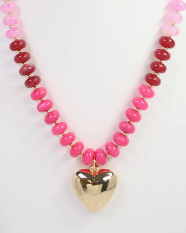 The Belmont Stone Beaded Heart Necklace in pink features beautiful stone beads accented by a charming heart pendant. This fashionable necklace adds a touch of elegance and playful romance, making it a perfect accent to elevate any look with vibrant color and style.