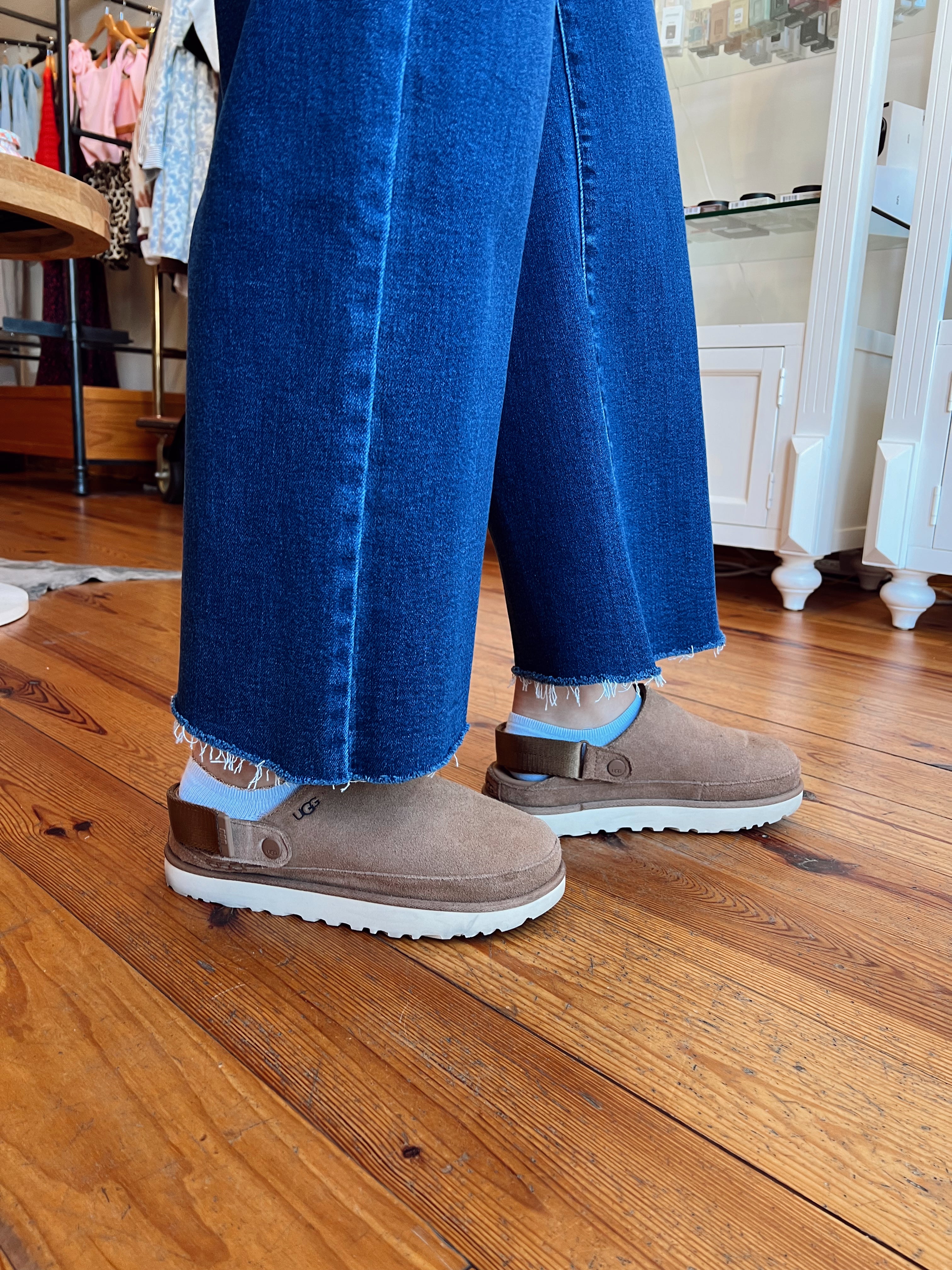 This almost cropped wide leg is hitting the streets early. Don't wait for spring to start wearing your light wash denim. Featuring our versatile, soft fabric this pair holds your waist with the perfect amount of stretch - right at the belly button.