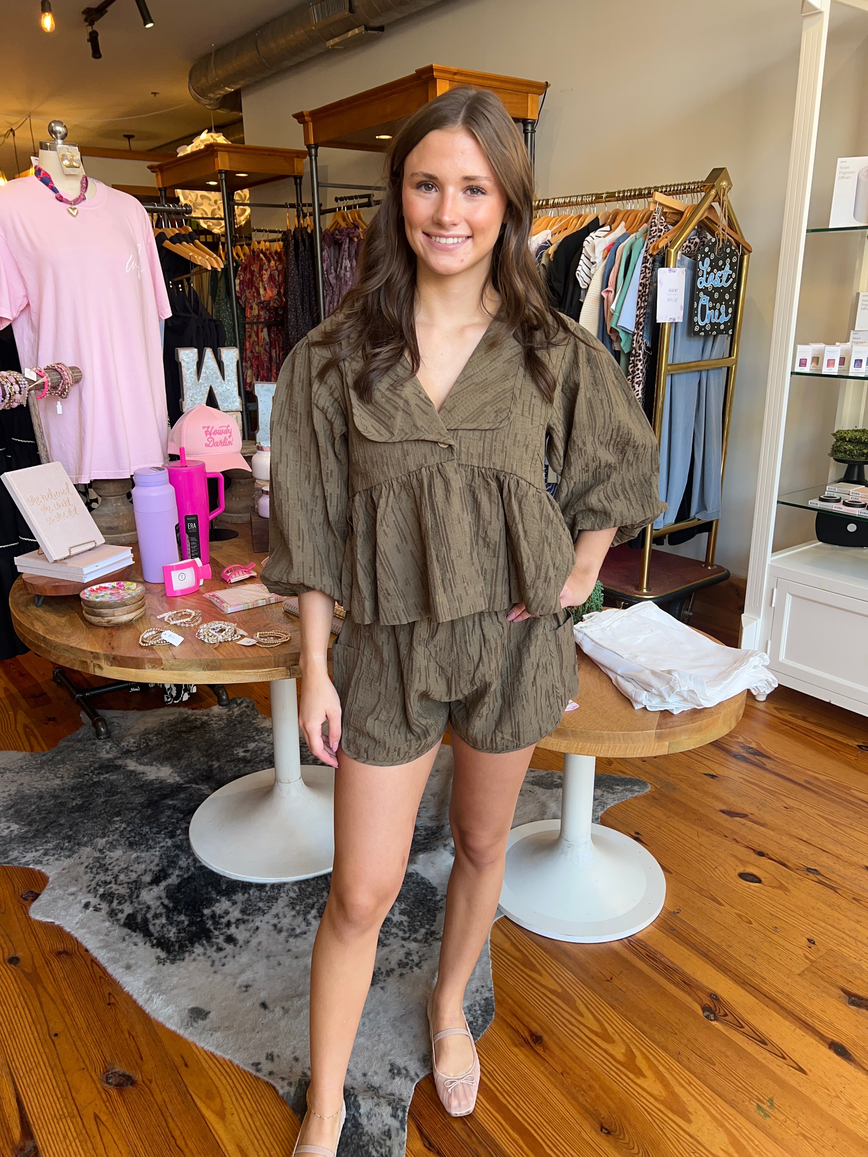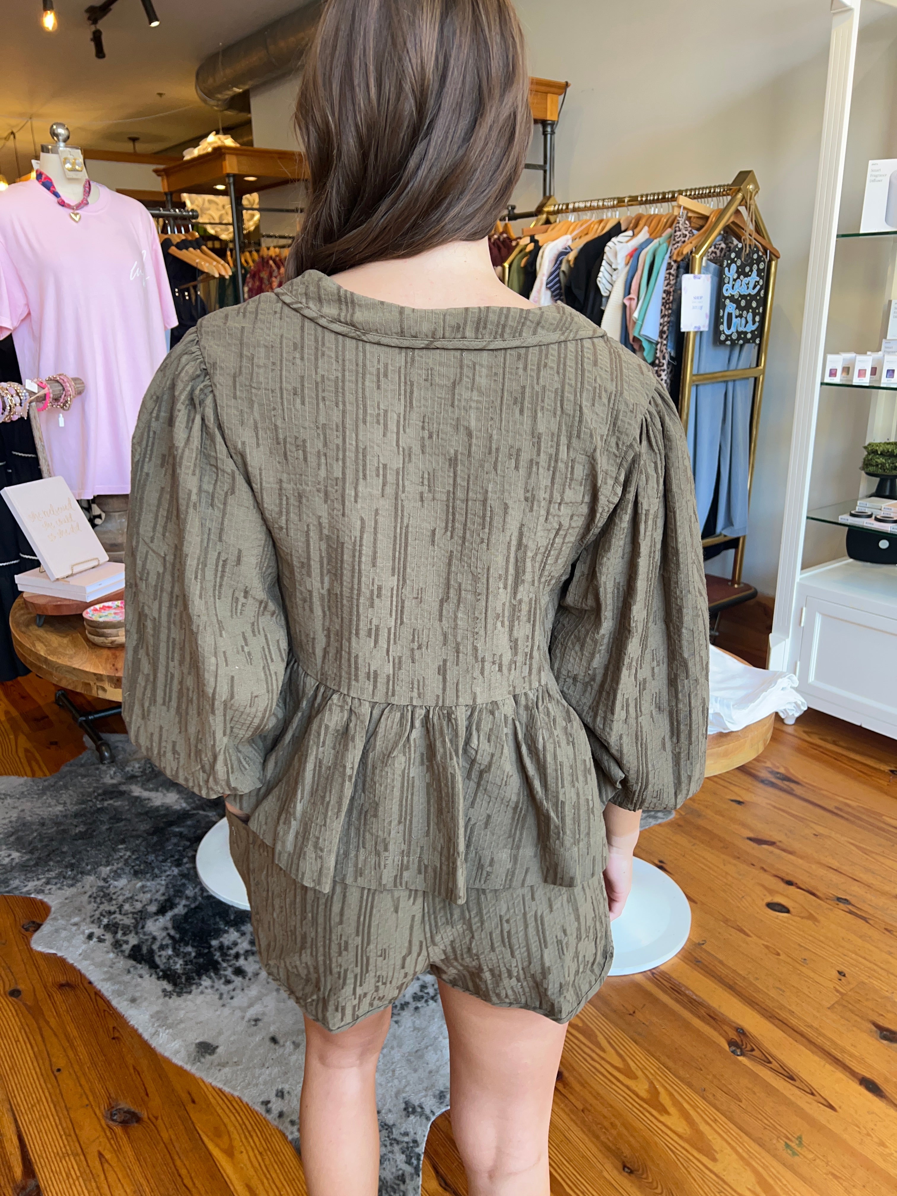 Textured fabric blouse with a deep V-neckline, oversized collar, and gathered peplum hem. Voluminous sleeves add a soft.