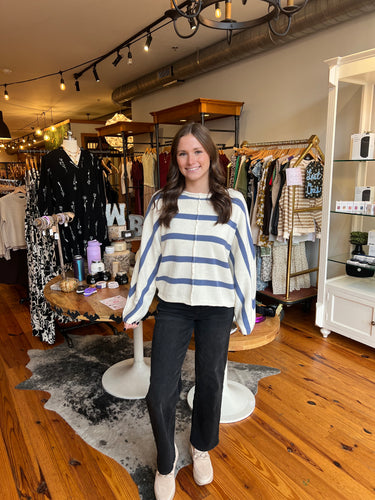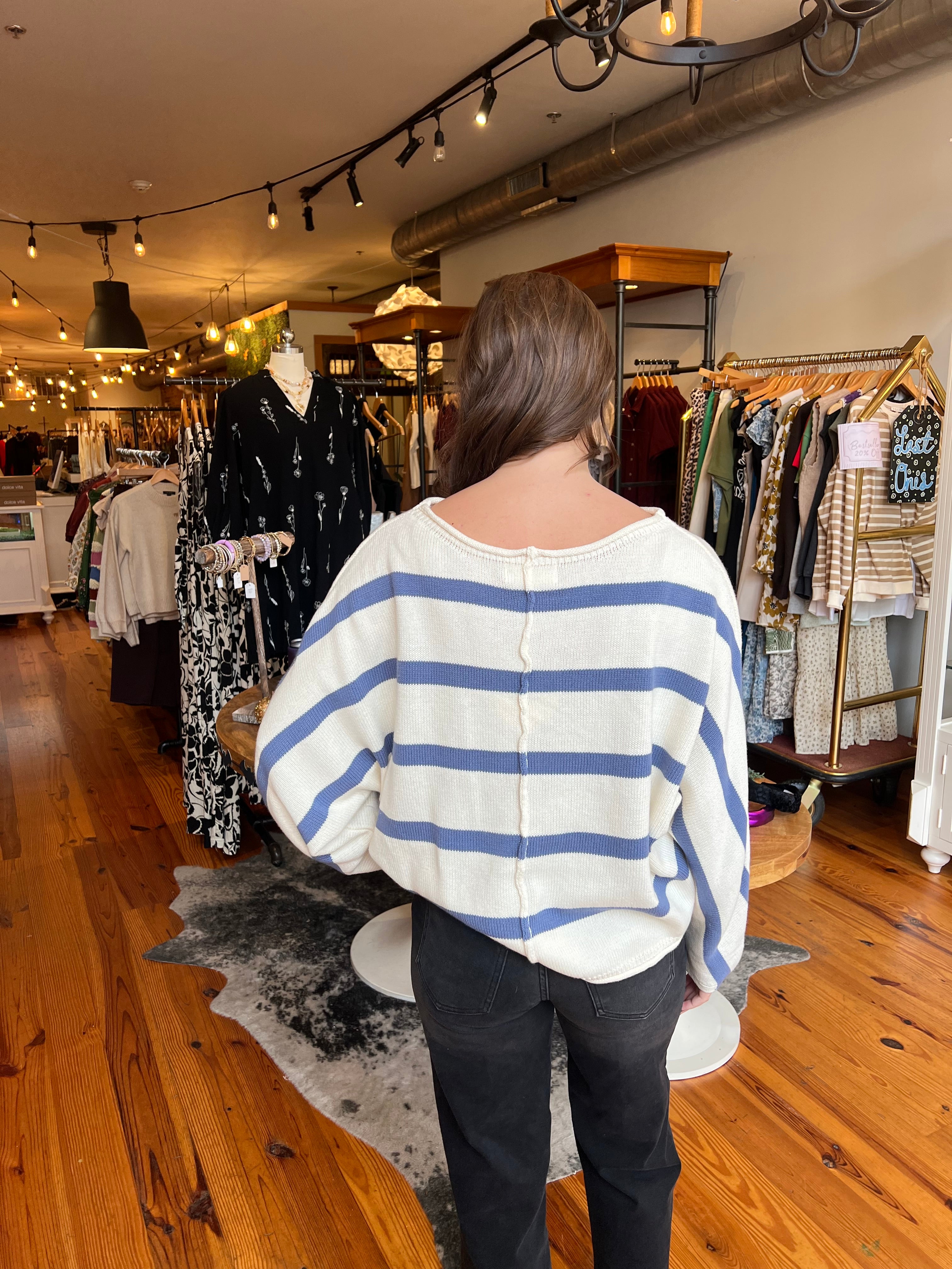 Cotton striped sweater top with oversized fit and dolman sleeves. Features exposed seam detail. Easy to style for work, weekend, or casual everyday wear.
