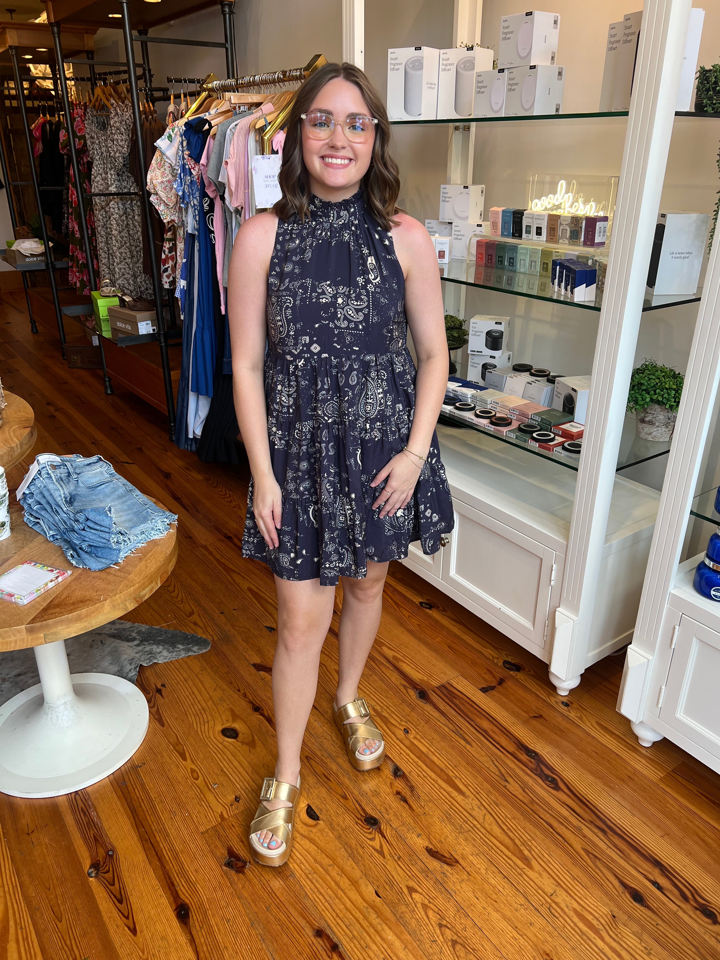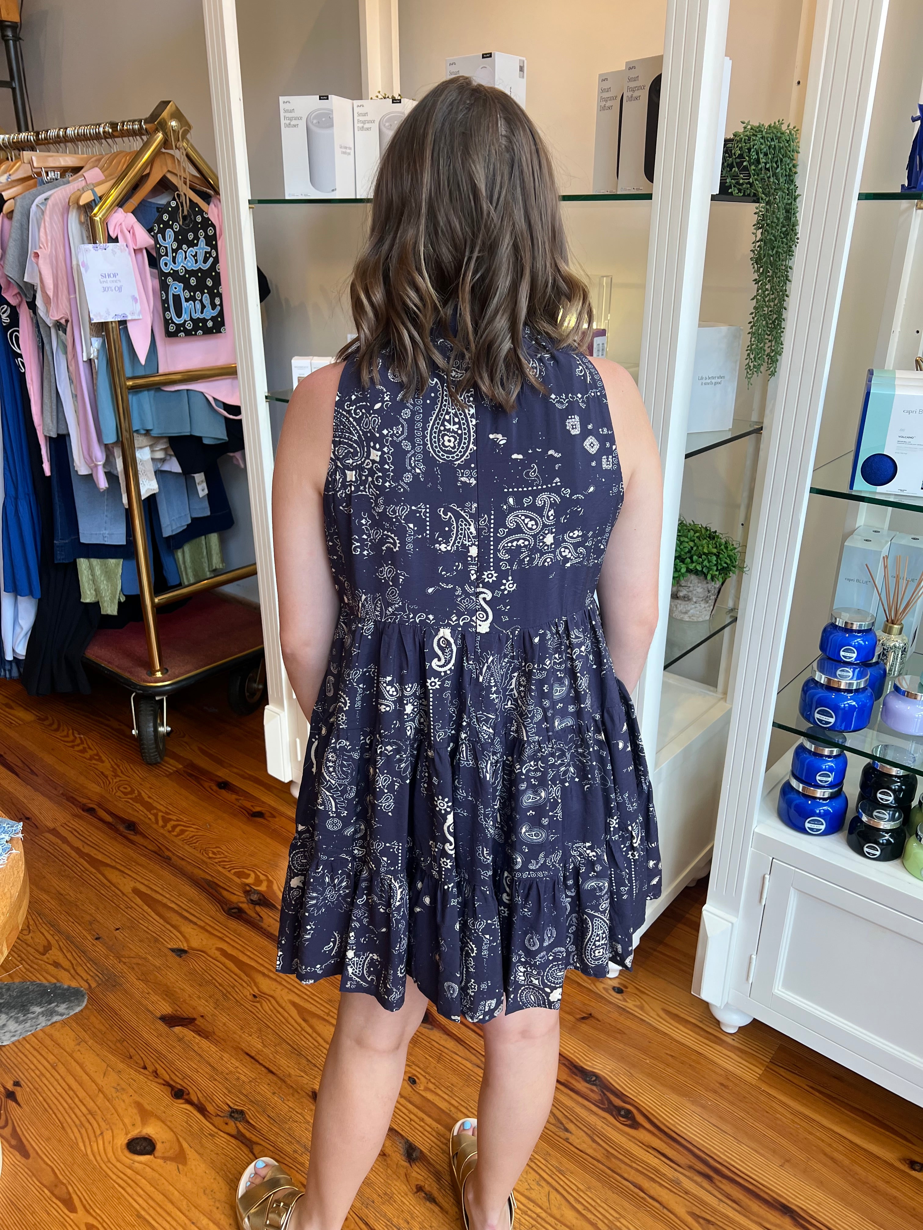 Sleeveless mini dress featuring a paisley print, ruffled mock neckline, tiered silhouette, and hidden side pockets.