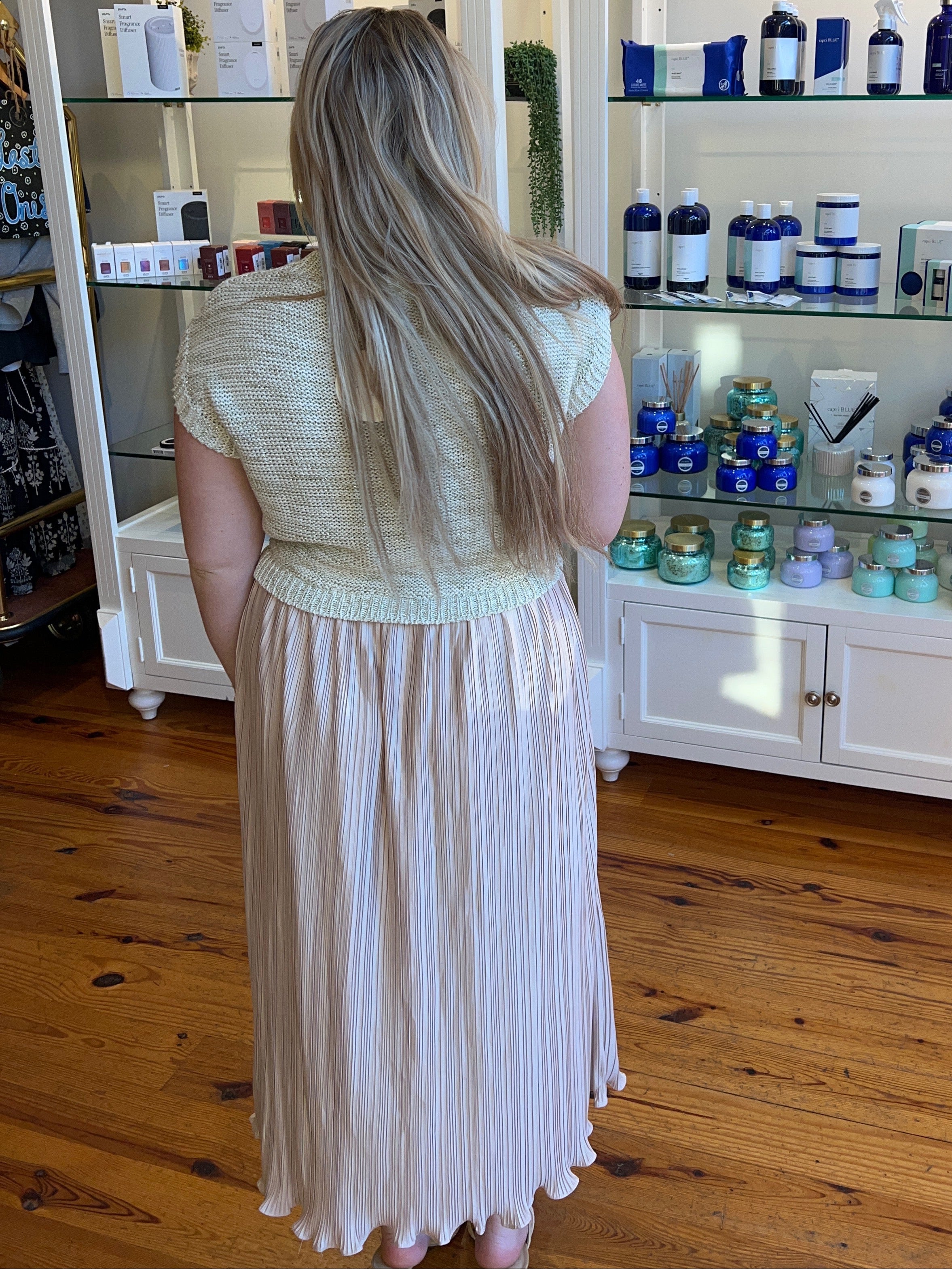 Twofer midi dress with metallic sweater knit top and pleated skirt. Features round neck and sleeveless cut. Lined. Ideal for holiday brunch or office styling.