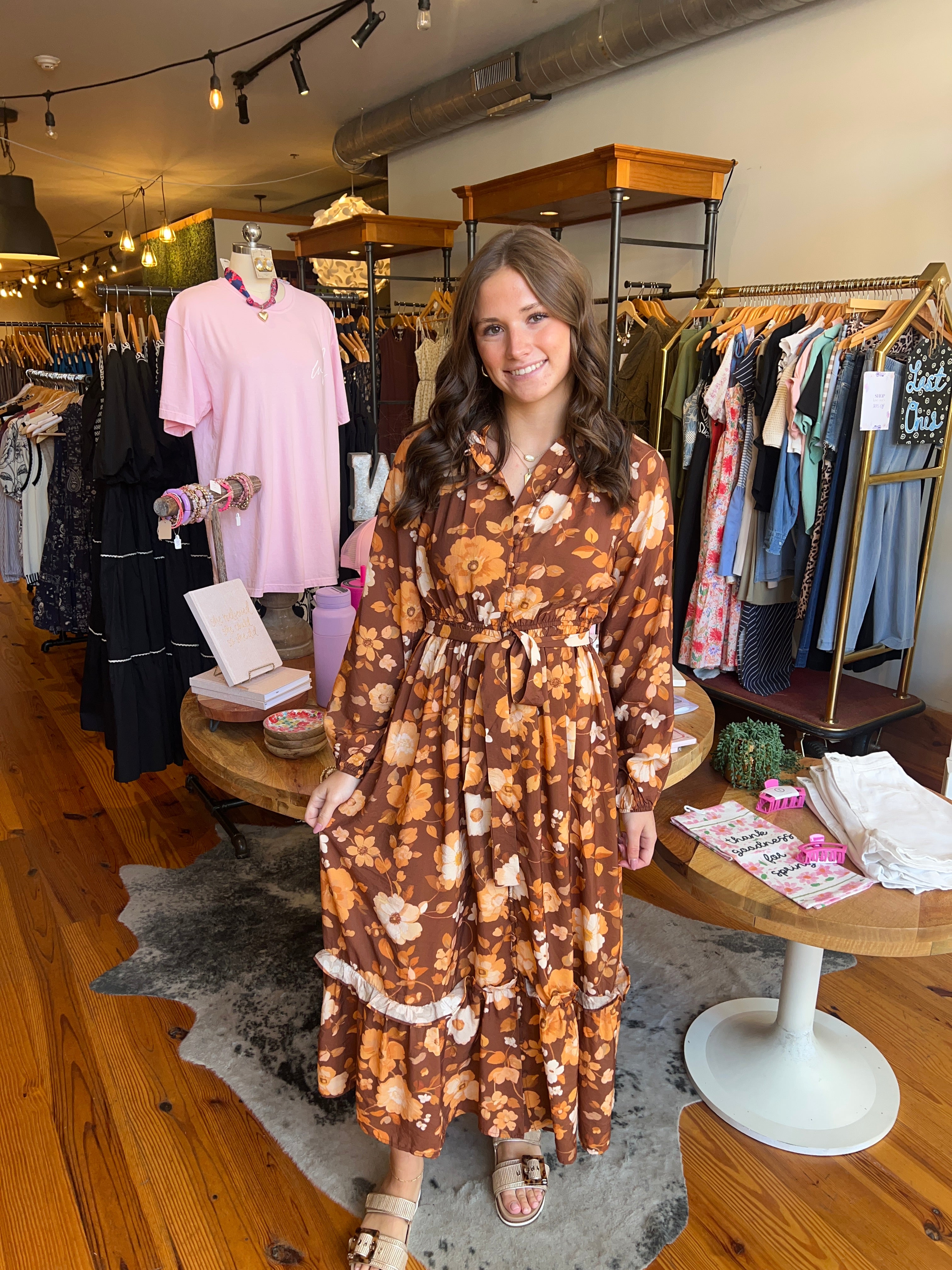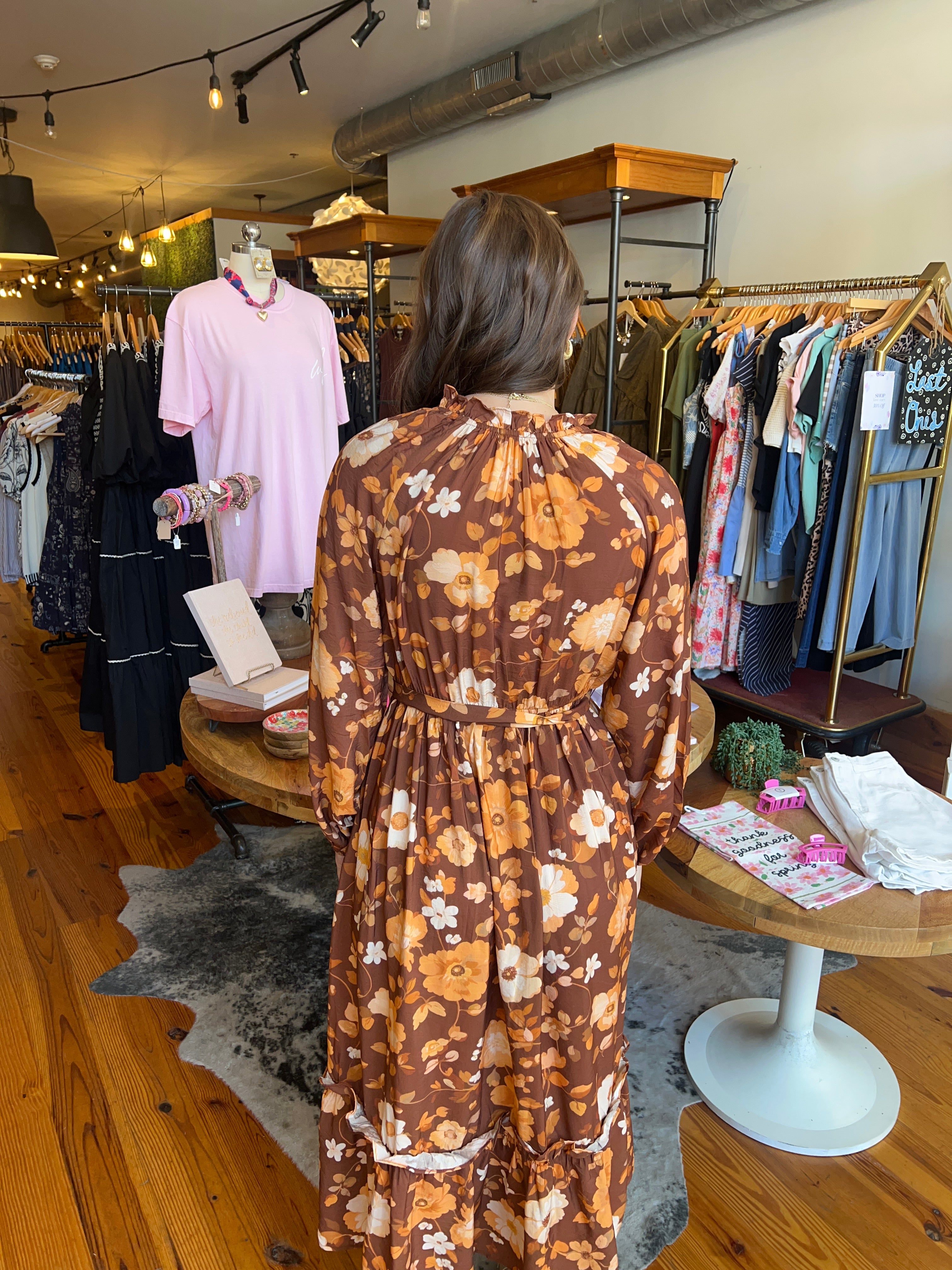 A flowy midi dress in a floral print, featuring a gathered high neckline, long sleeves with elastic cuffs, and a ruffled hem. Comes with a matching tie belt and soft pleating for added movement.
