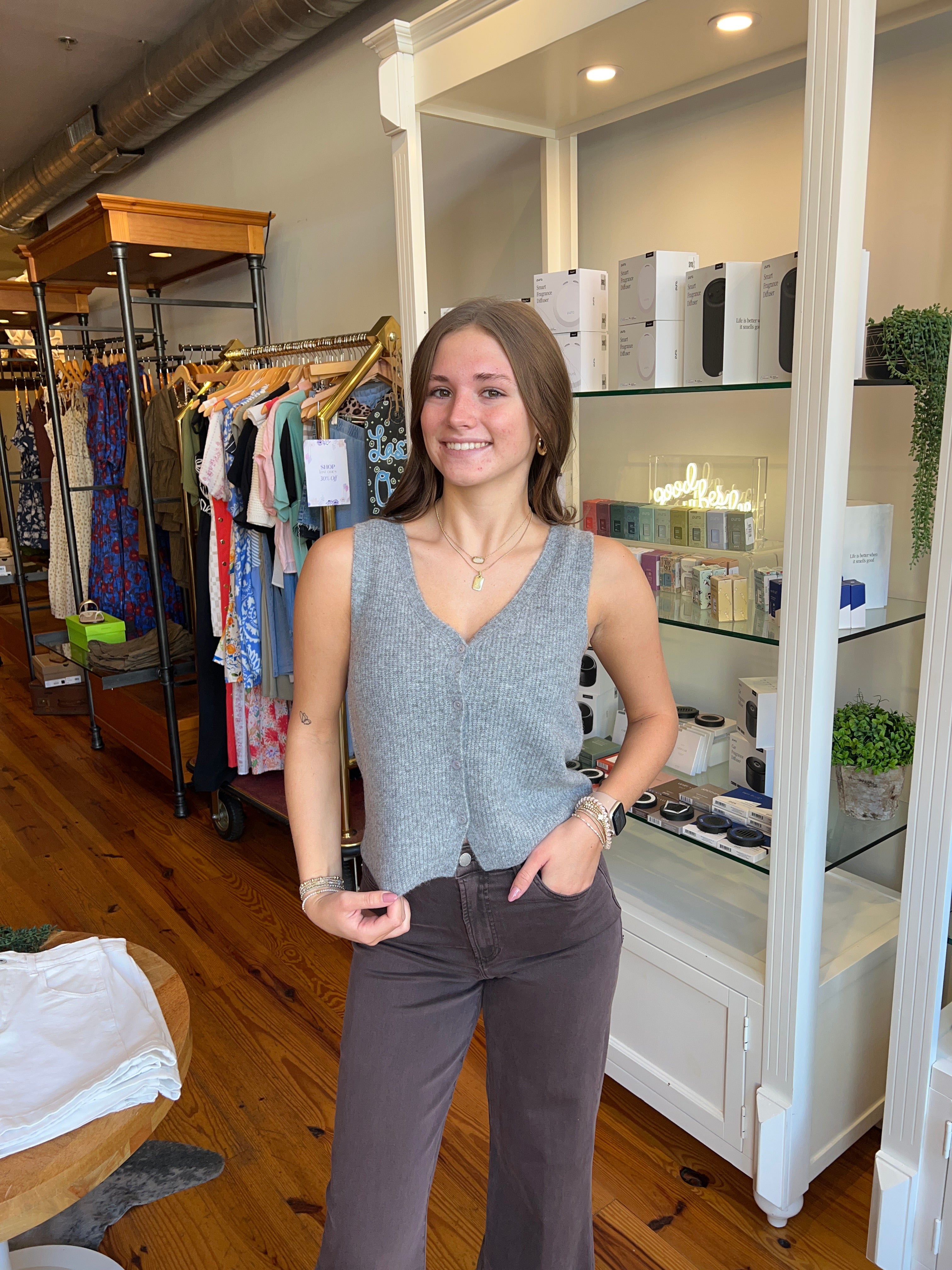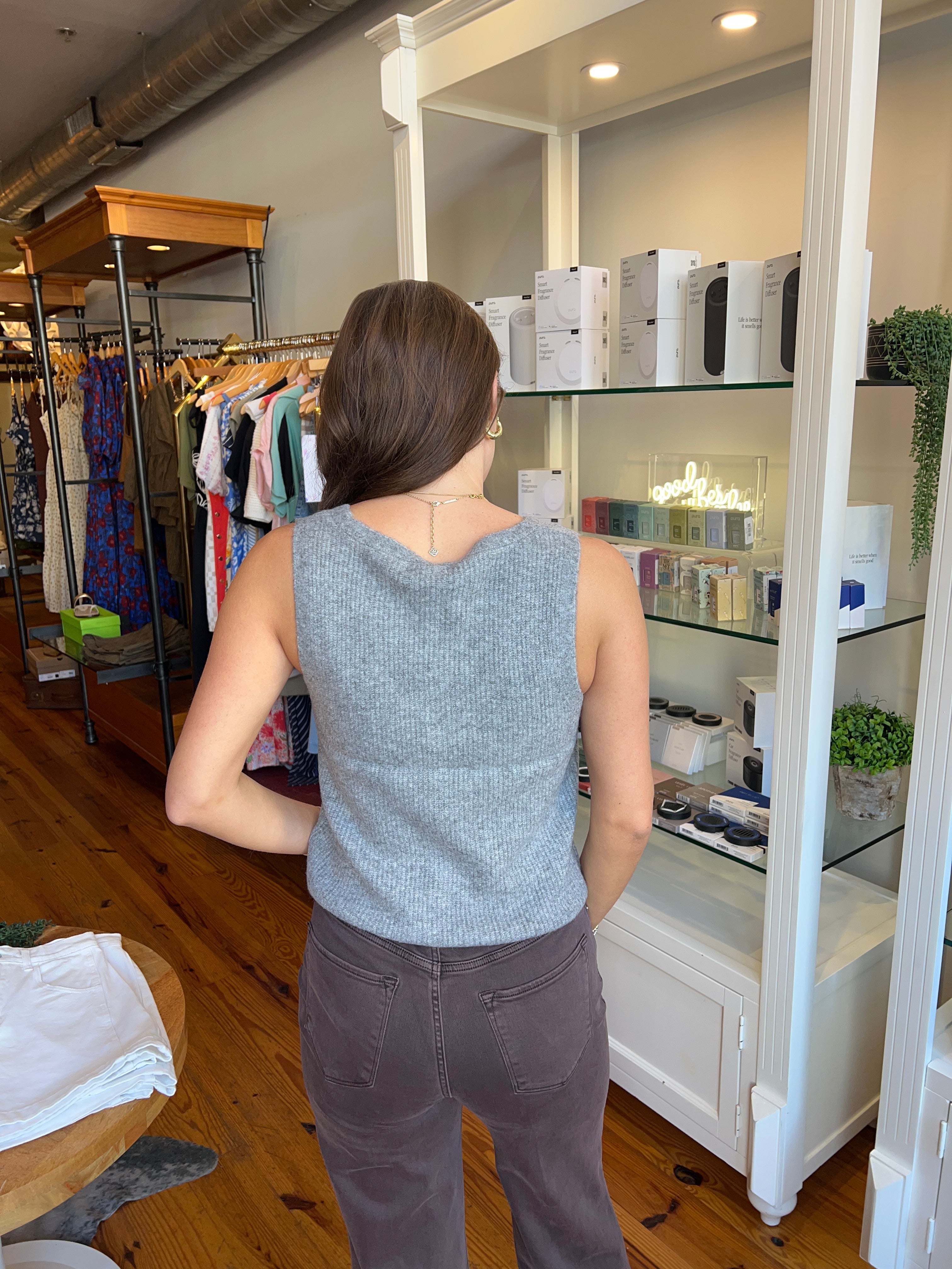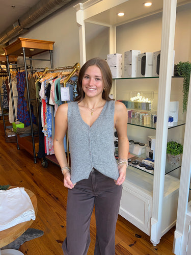 Designed in our soft Cozy Summer yarns, this sleeveless v-neck brings an airy weight and textured rib detailing. A standout piece that works solo in warm weather or layered as temps cool.