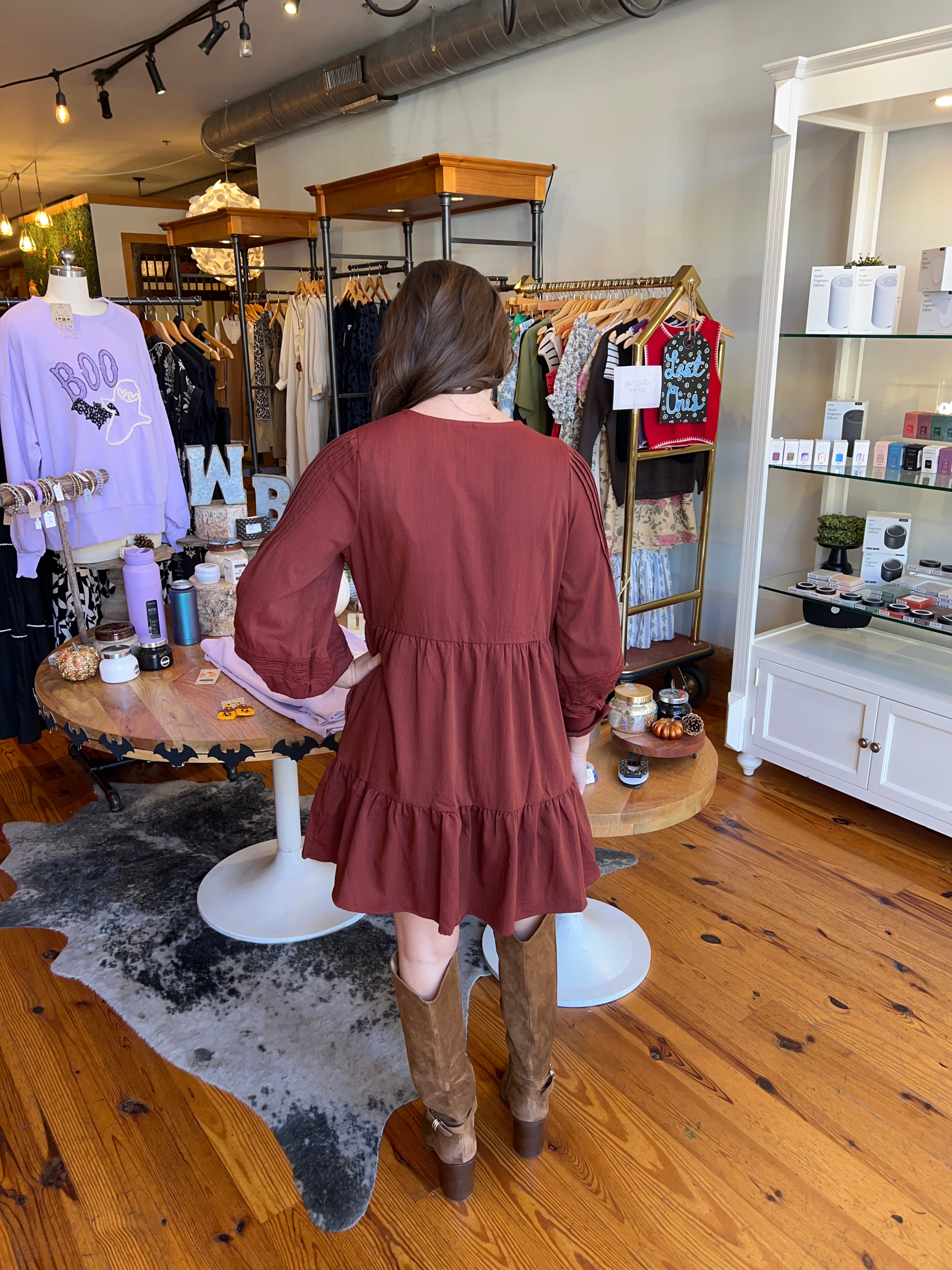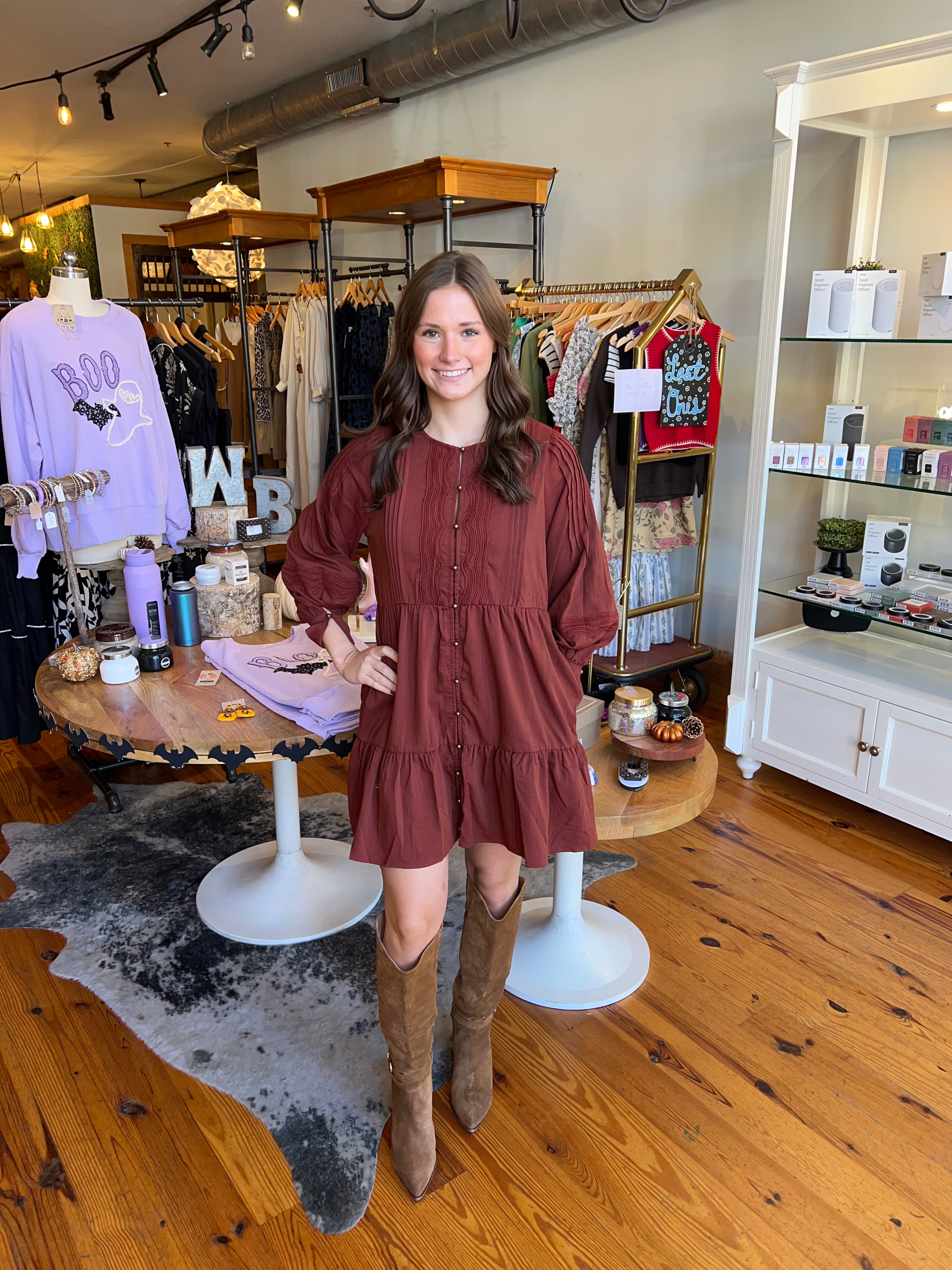 Solid long sleeve mini dress featuring lace insert and pintuck detail at front. Button closure at front. Button closure at sleeve. Side pockets. Ruffle hem. Lined. Woven. Non-sheer. Lightweight.