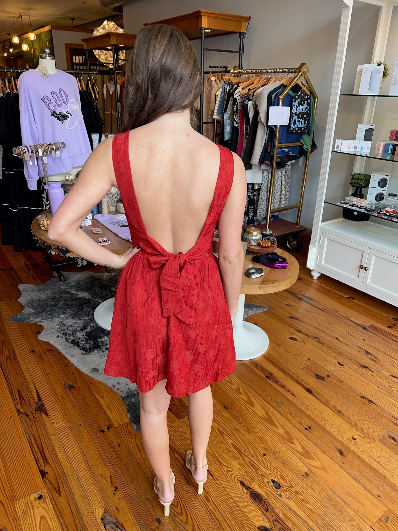 - Styled with a dramatic low scoop back and oversized self-tie bow detail