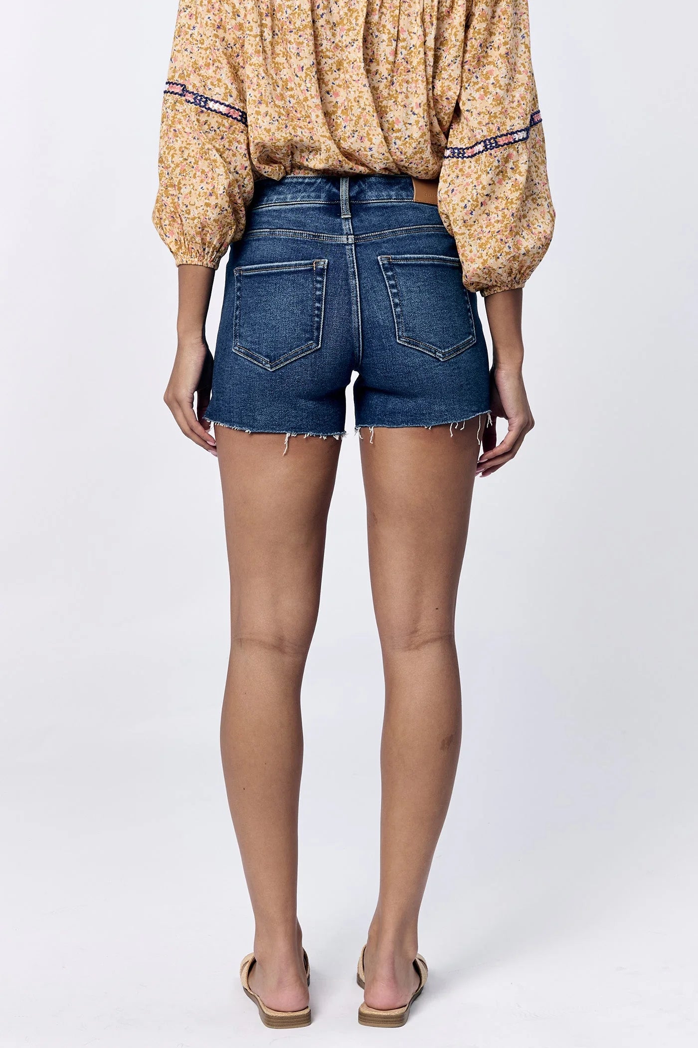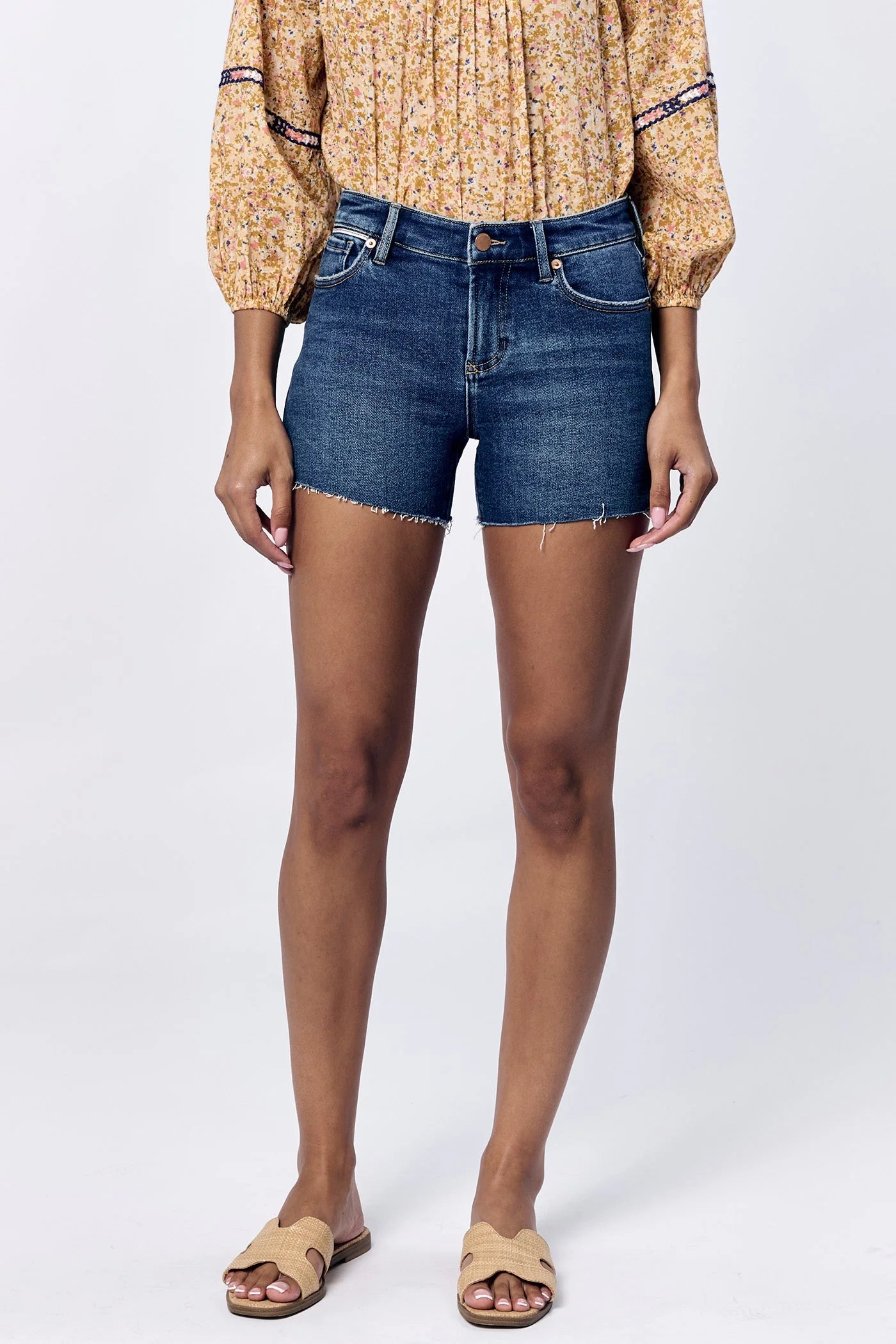 Gigi denim shorts in dark wash is the perfect blend of style and comfort. These versatile outfits are crafted from a durable yet soft fabric blend of cotton, polyester, and spandex, offering a relaxed fit to provide the ideal silhouettefor comfortable clothing. Featuring raw cut hem adds a trendy edge, in dark indigo denim making them a must-have addition to any wardrobe.