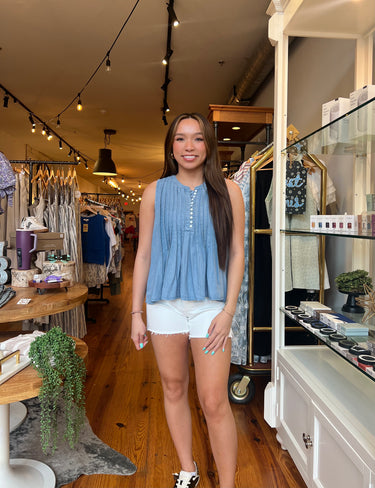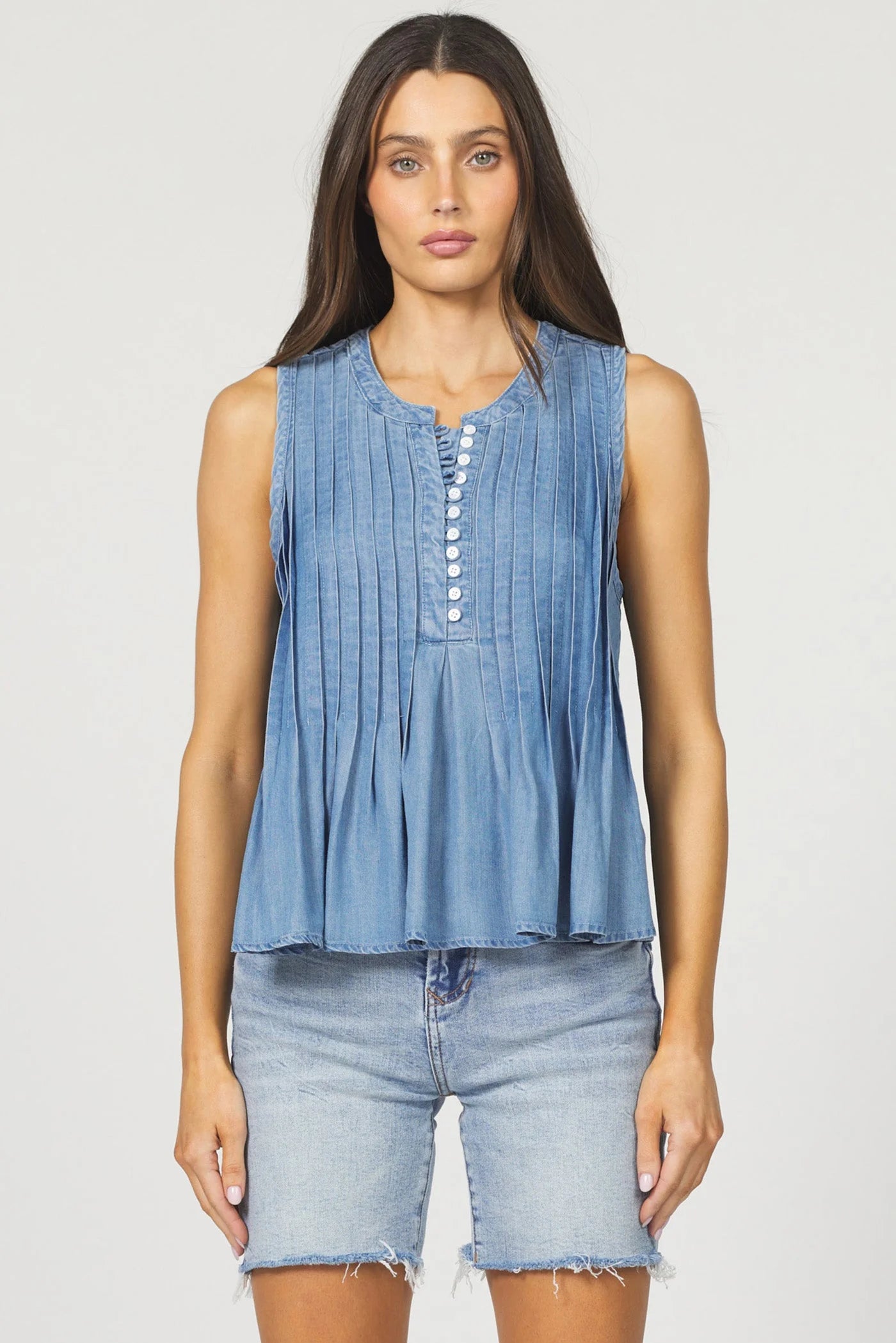 Embrace the effortless MYRON pleated top in seasonal colors, featuring a button-up henley, sleeveless design that perfectly balances relaxed elegance with comfort.