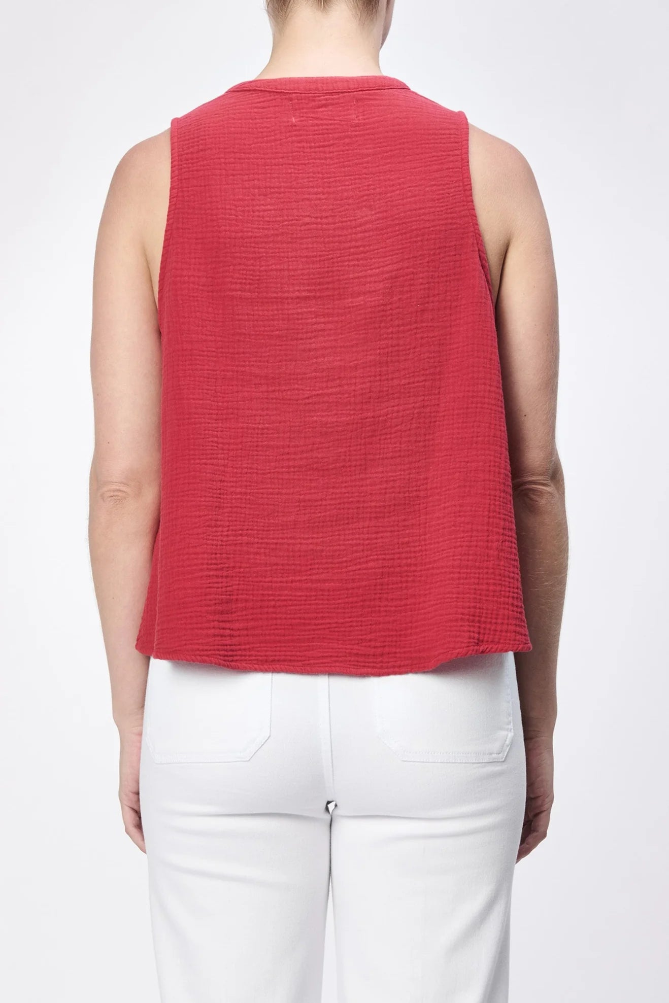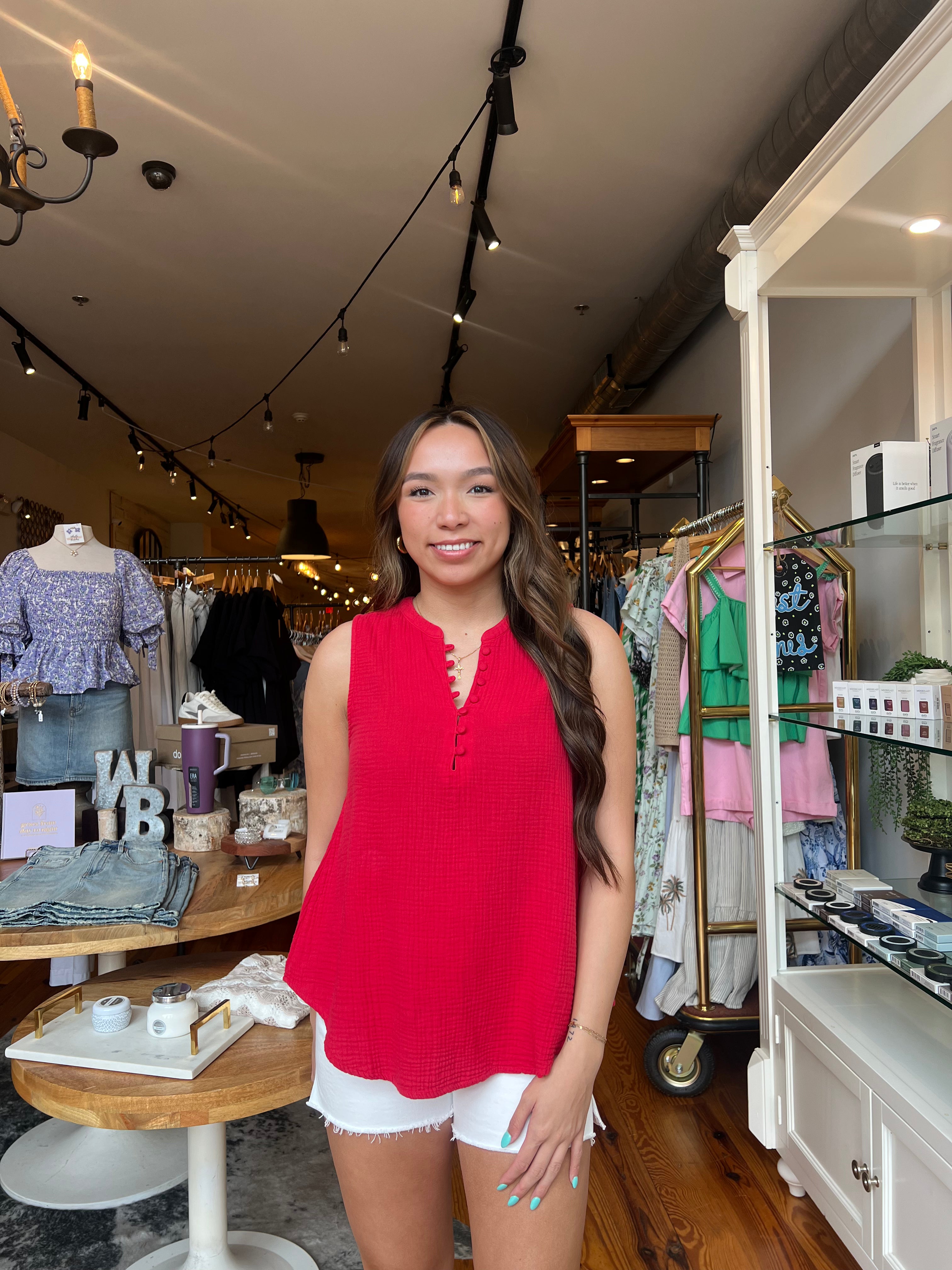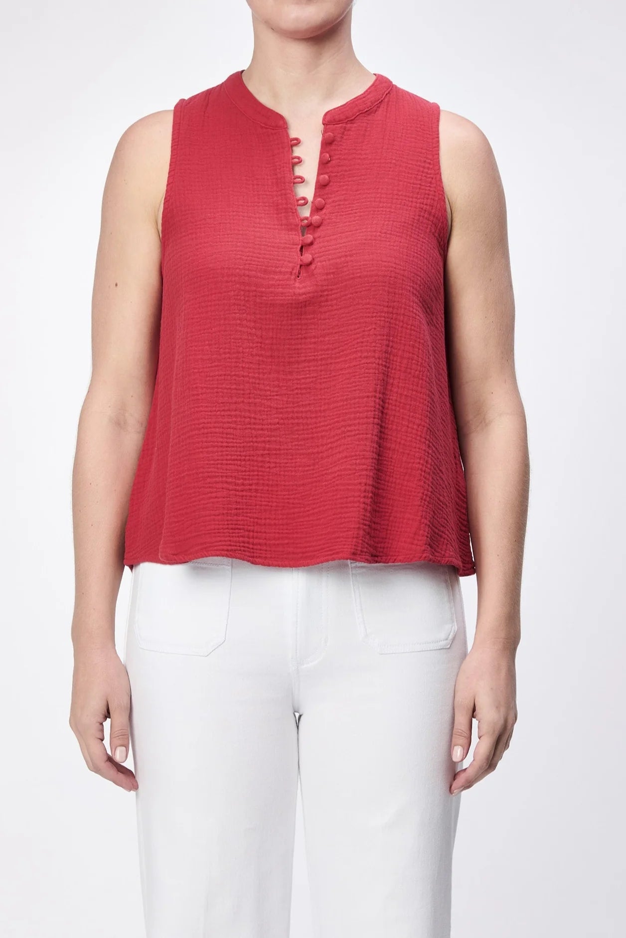 Elegance and comfort with the Raja woven top, a sleeveless with button-up henley design that offers a relaxed fit while embracing effortless fashion.