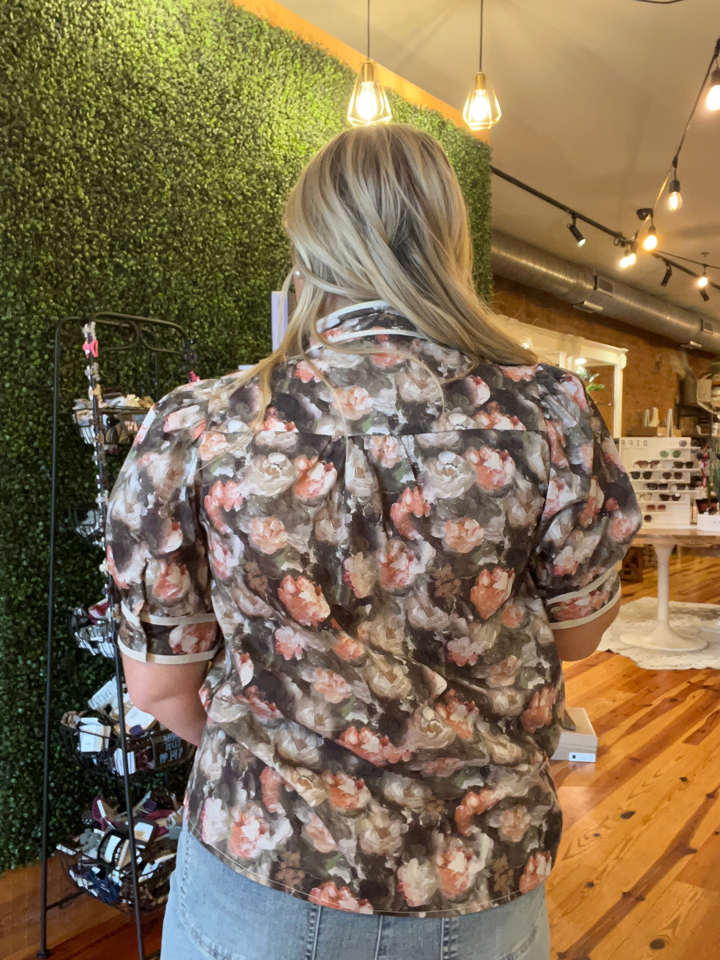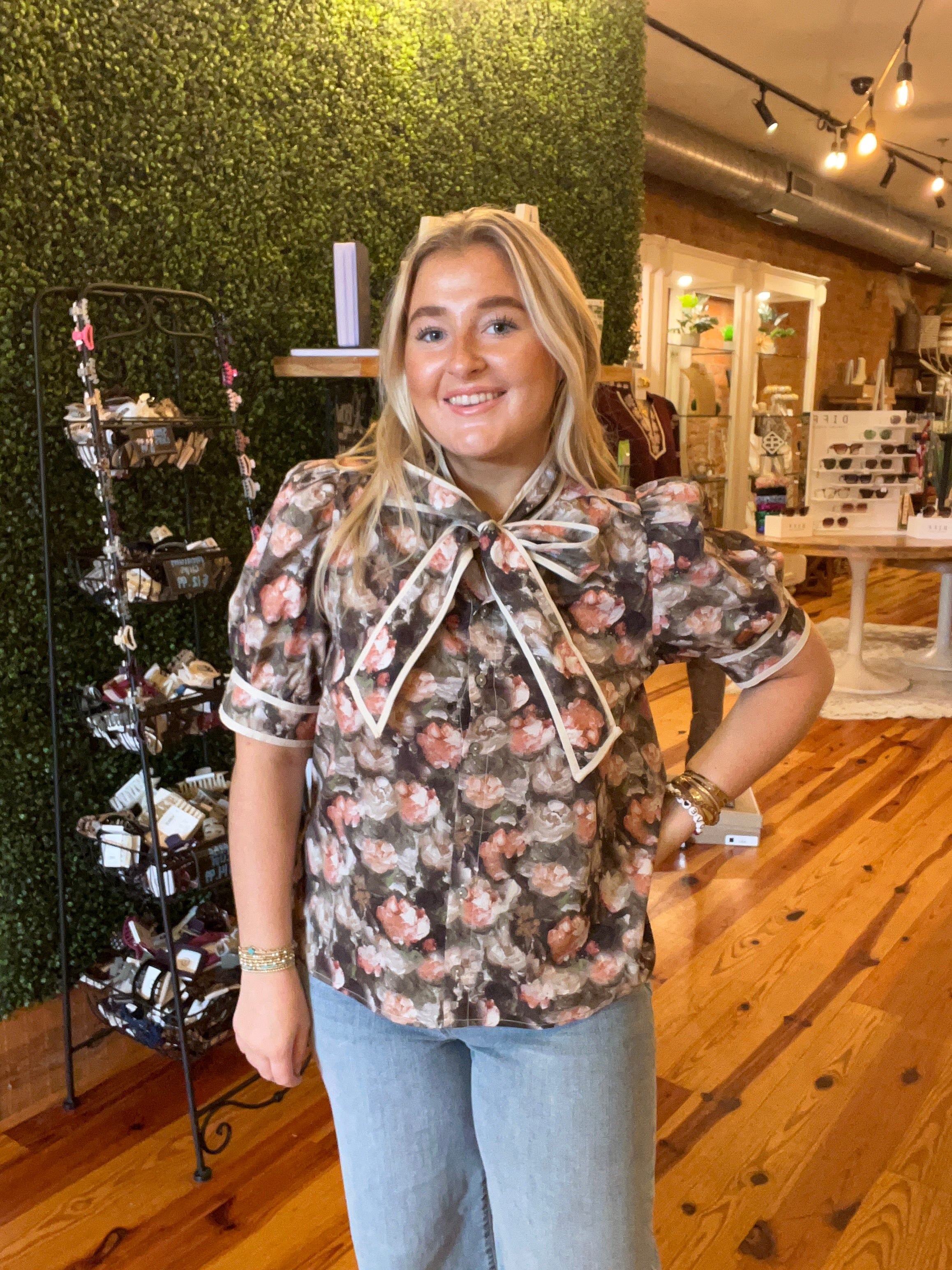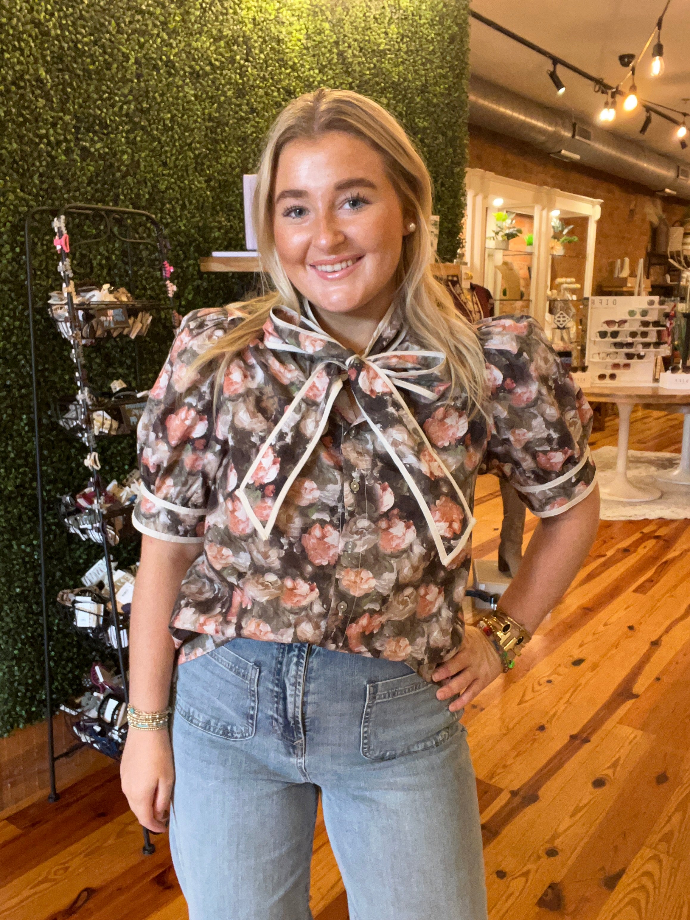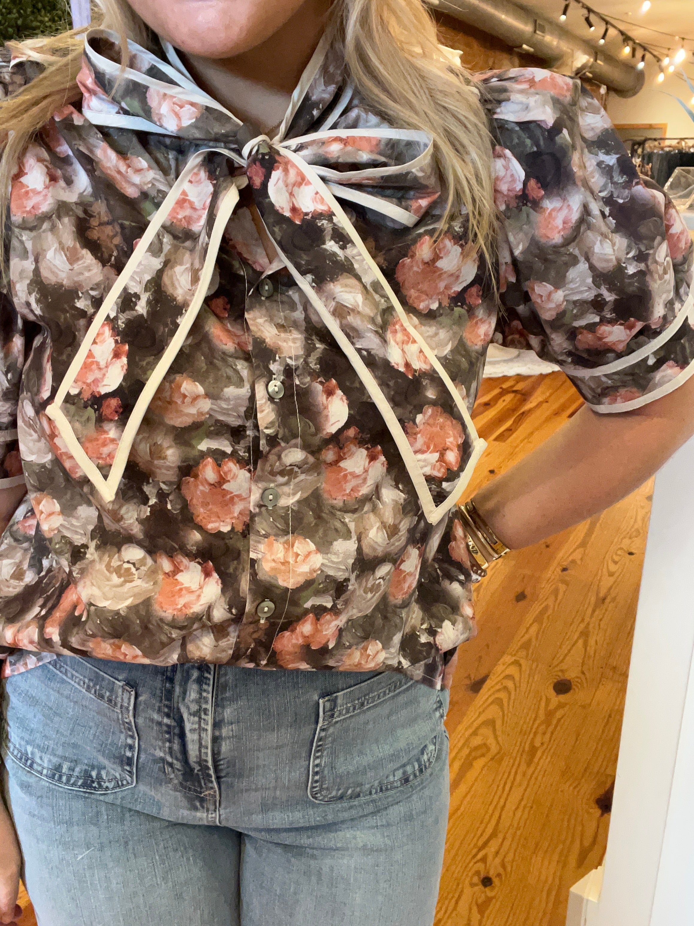 Floral print shoulder puff short sleeve button front closure top featuring bow tie neck with contrast accent binding details. Unlined. Woven. Non-sheer. Lightweight.