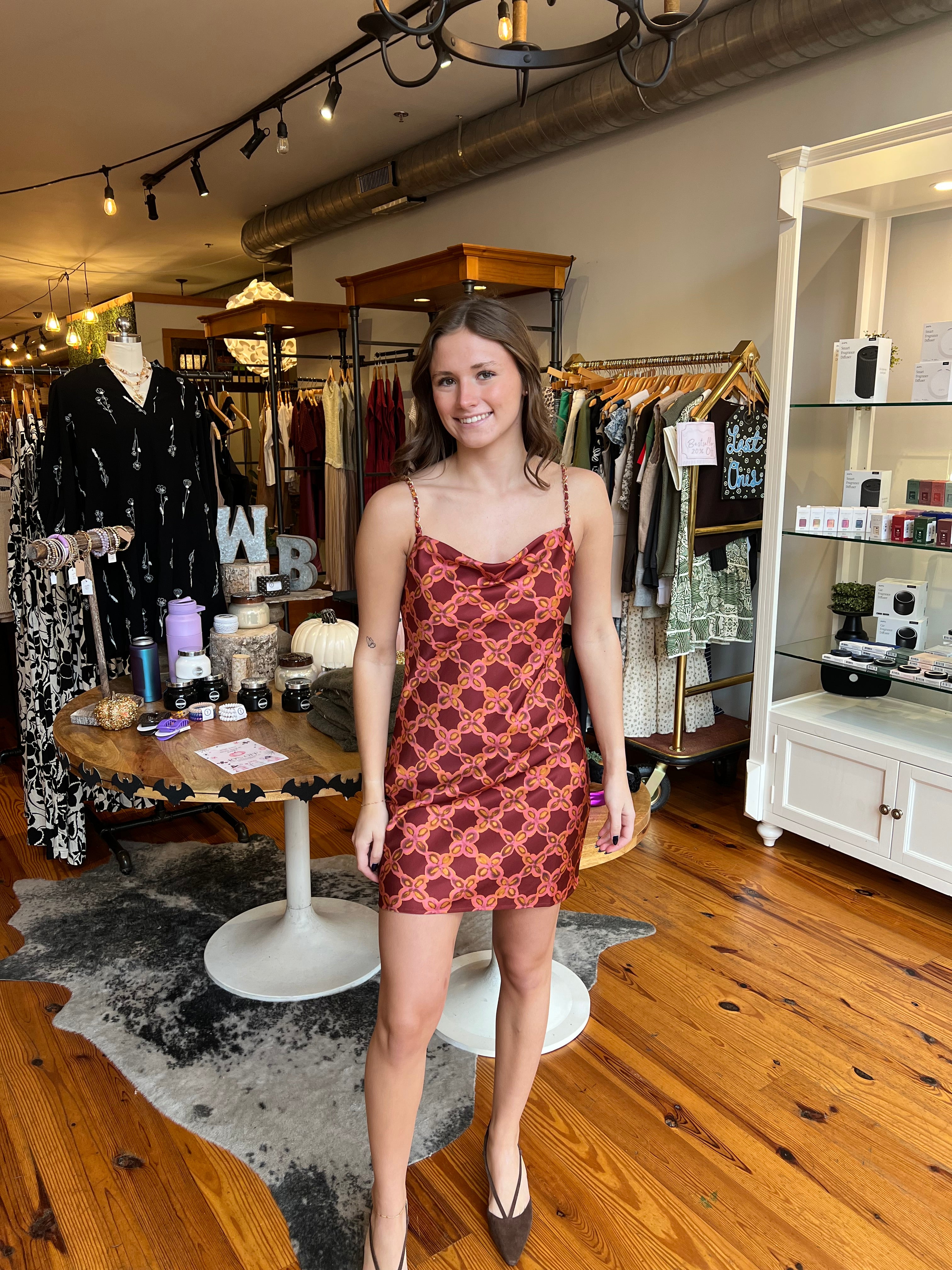 Chain strap cowl neck mini dress in an exclusive flower chain link checkered print on satin fabric This sleeveless mini slip dress features a cowl neck, adjustable strap with gold chain detail, and lining.