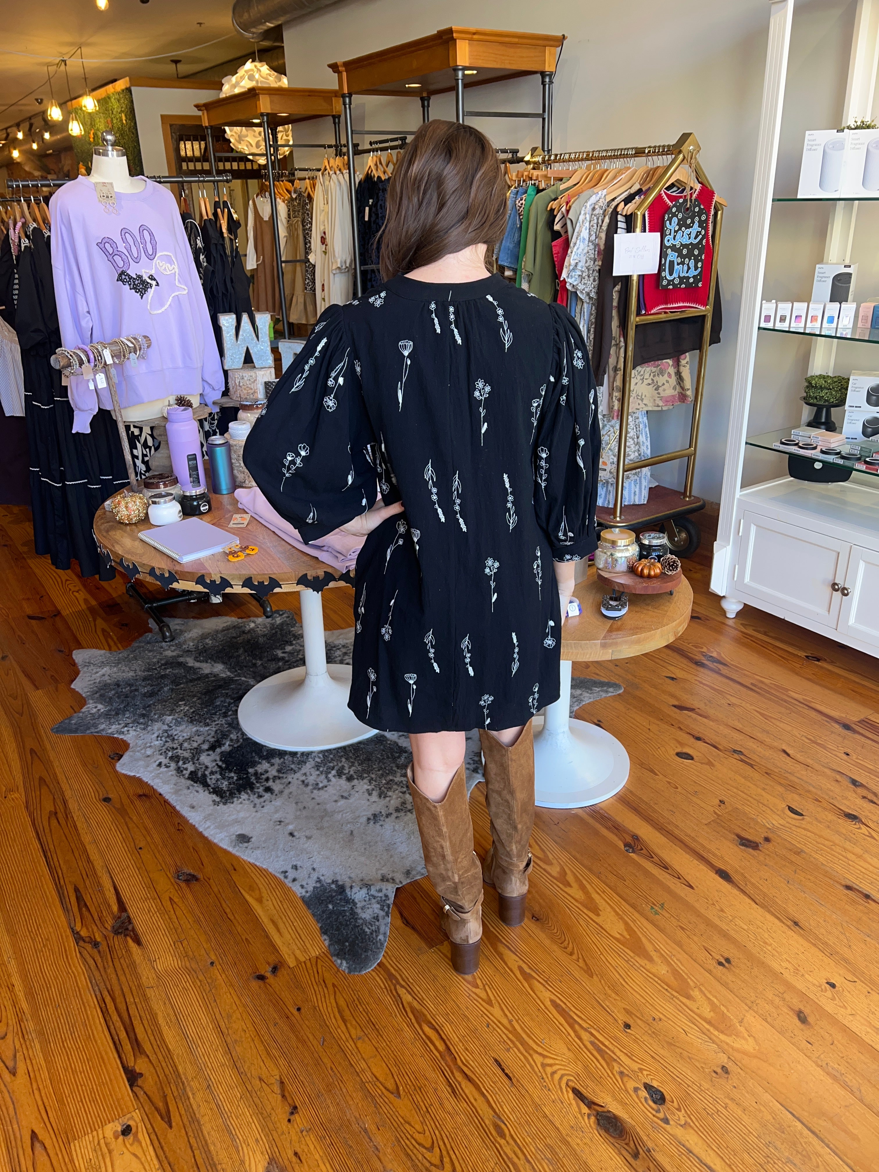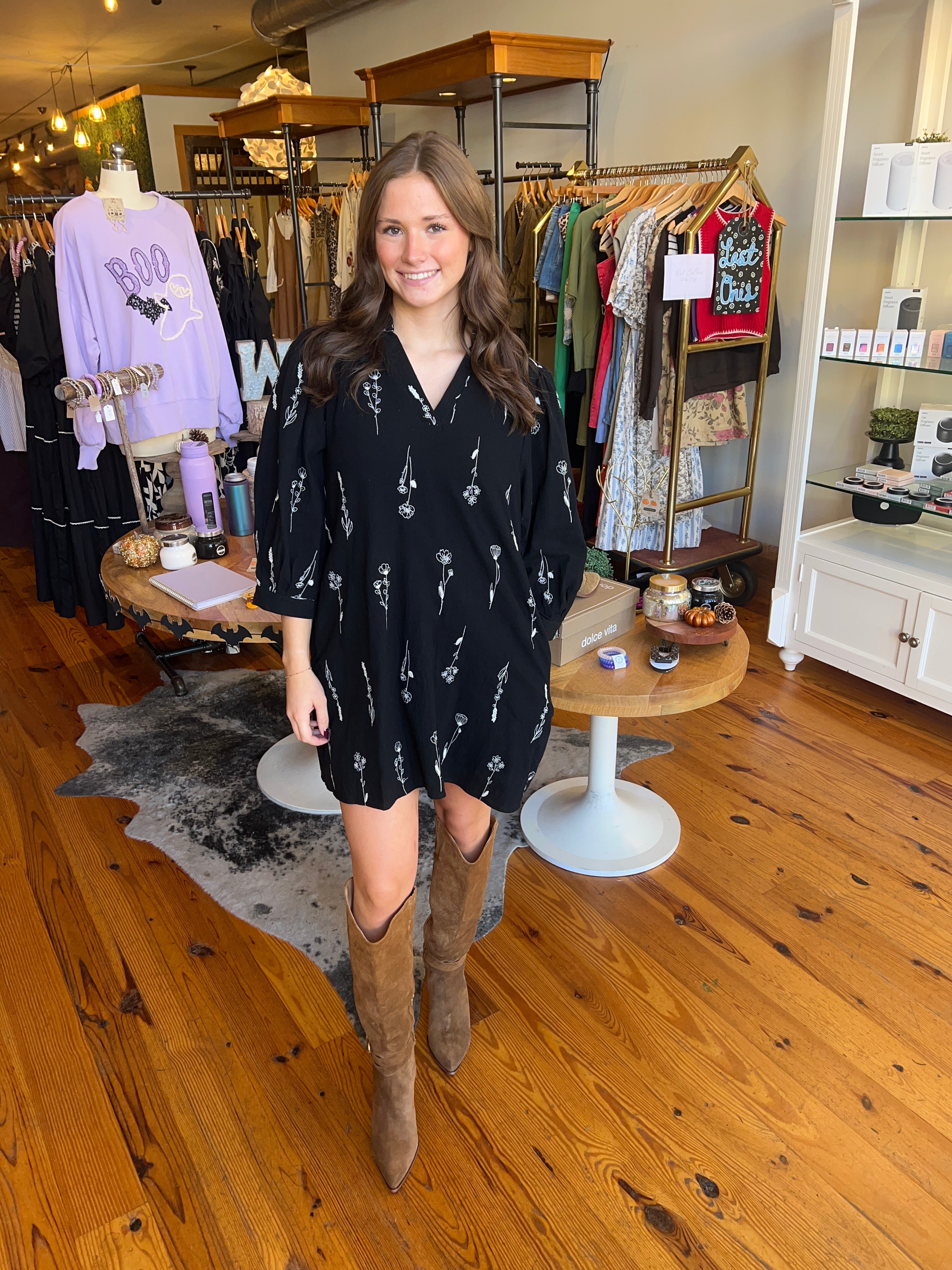 Embroidered balloon 3/4 sleeve mini dress featuring split neckline. Side pockets. Lined. Woven. Non-sheer. Lightweight.