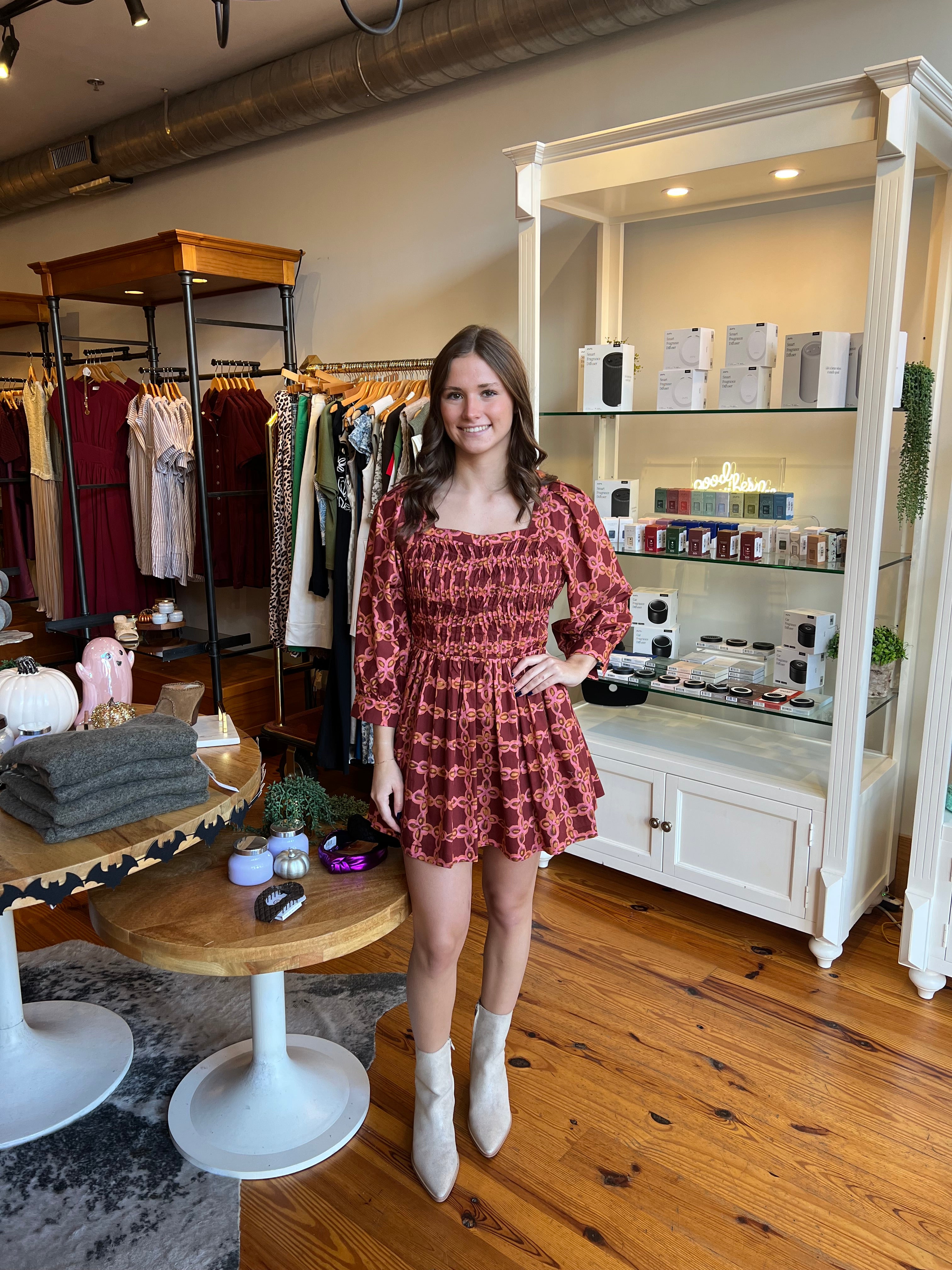 Studio Strut and Bolt Collection. Reverse pintuck babydoll mini dress in an exclusive flower chain link checkered print on poplin fabric. This baby doll style features reverse pin-tuck detail at bodice, a square neckline, puff long sleeves with buttoned cuff, pleated A-line mini skirt, side pockets, shirred shoulders, a relaxed fit, and lining.