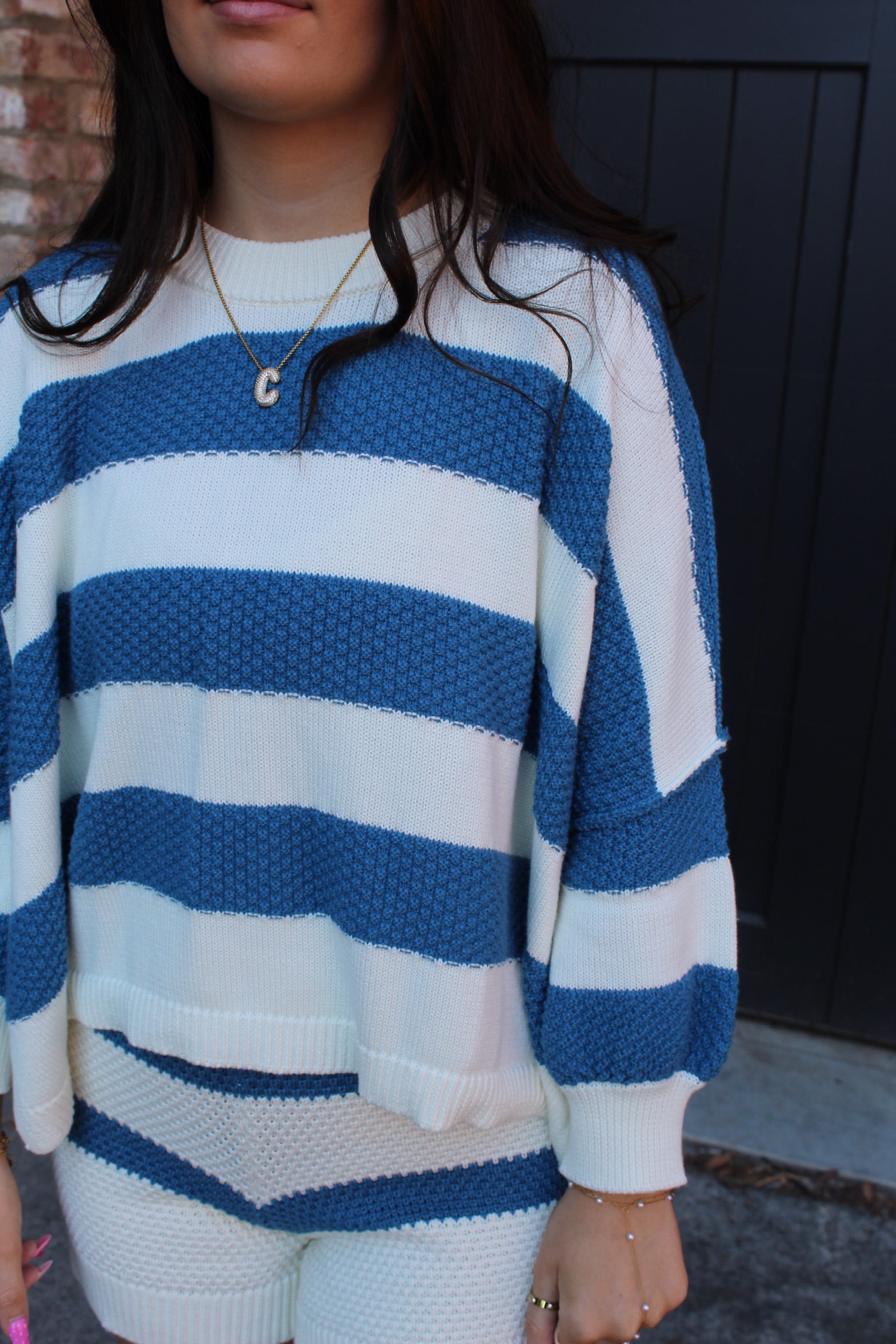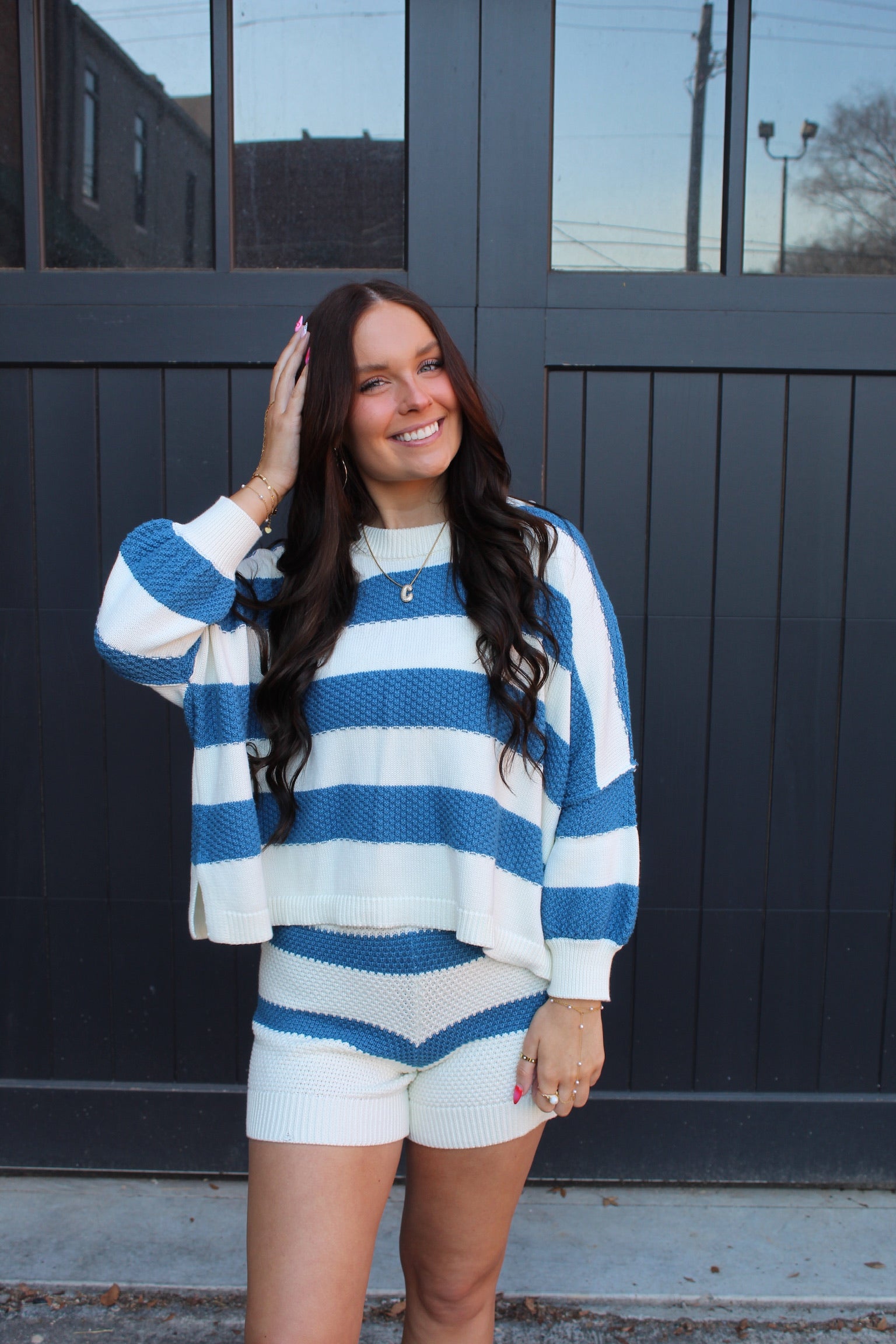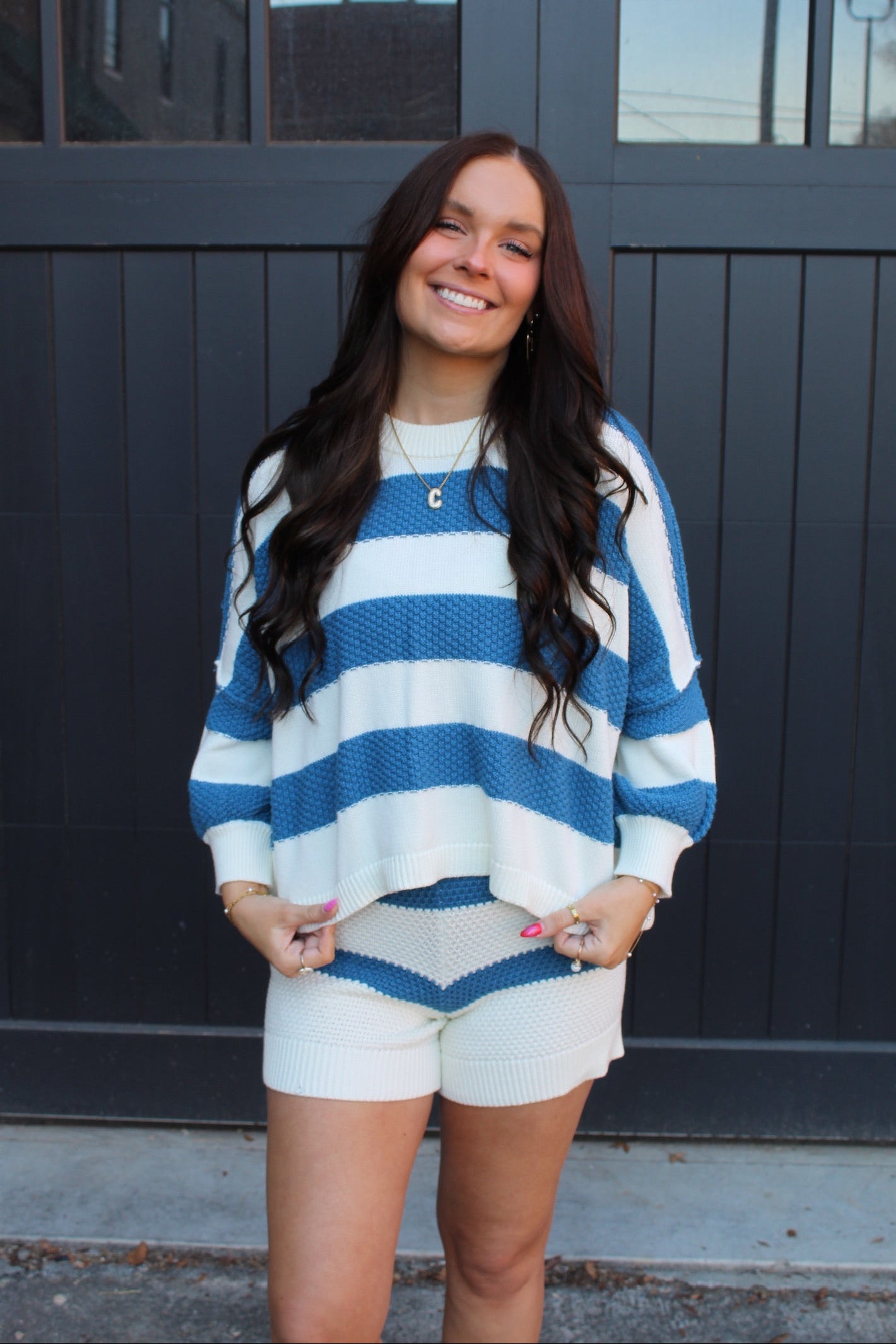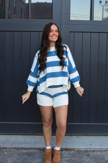 3/4 cuff sleeve oversized chunky boxy knit sweater and striped short