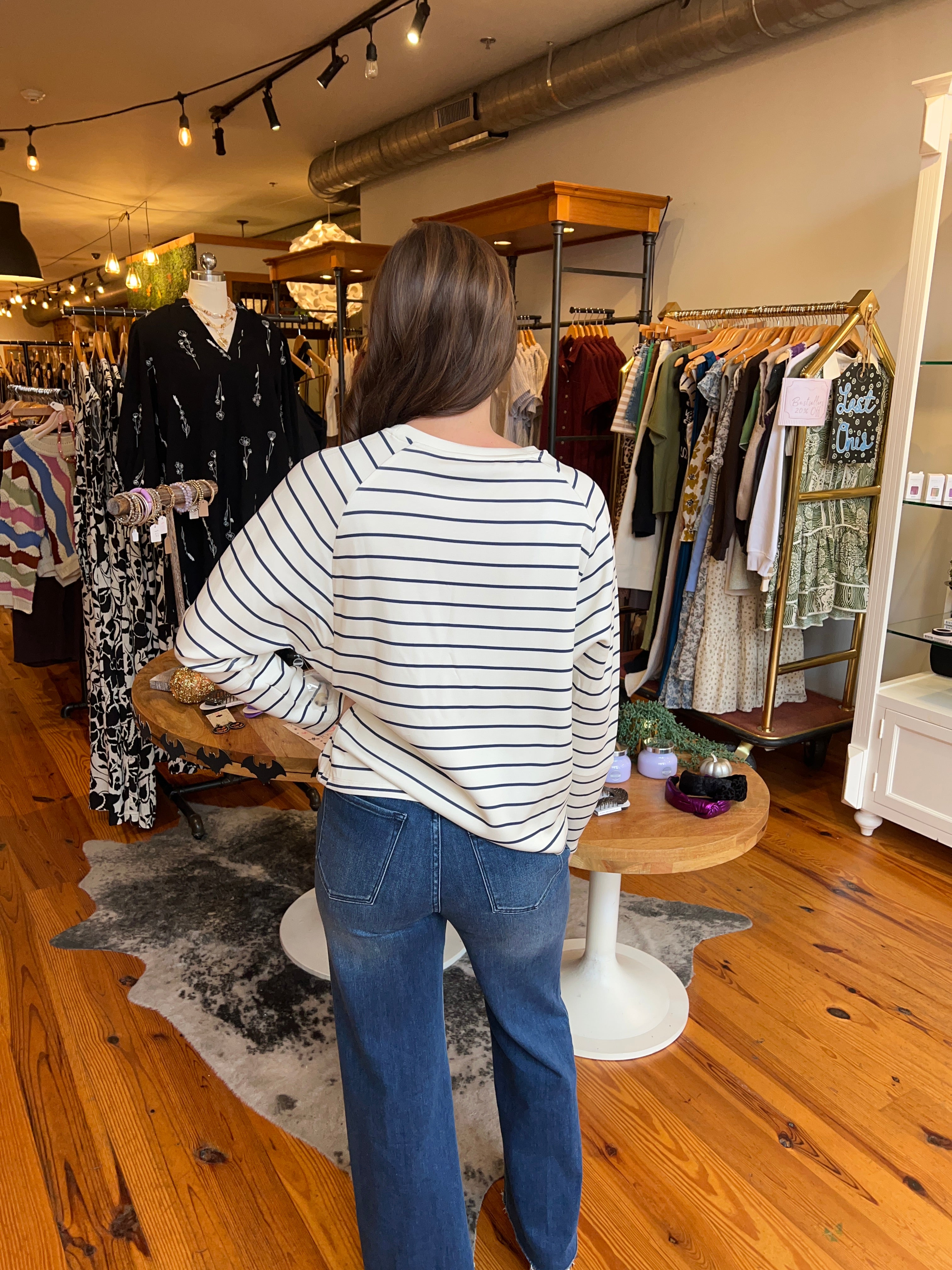 Elevate your everyday look with this long-sleeve top, featuring an eye-catching printed stripe pattern. Button accents at the cuffs add a refined touch, while the scuba knit fabric ensures lasting comfort and effortless style.