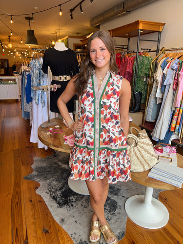 Multicolor floral pattern sleeveless ruffle hem mini dress featuring contrast spread collar button closure. Pockets at sides. Lined. Woven. Non-sheer. Lightweight.