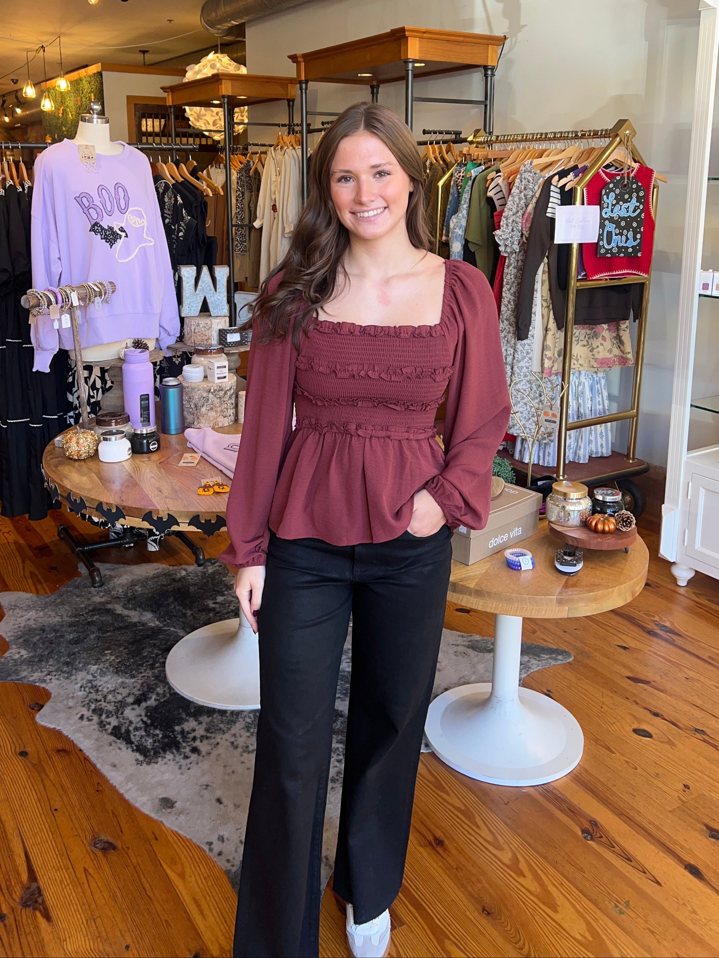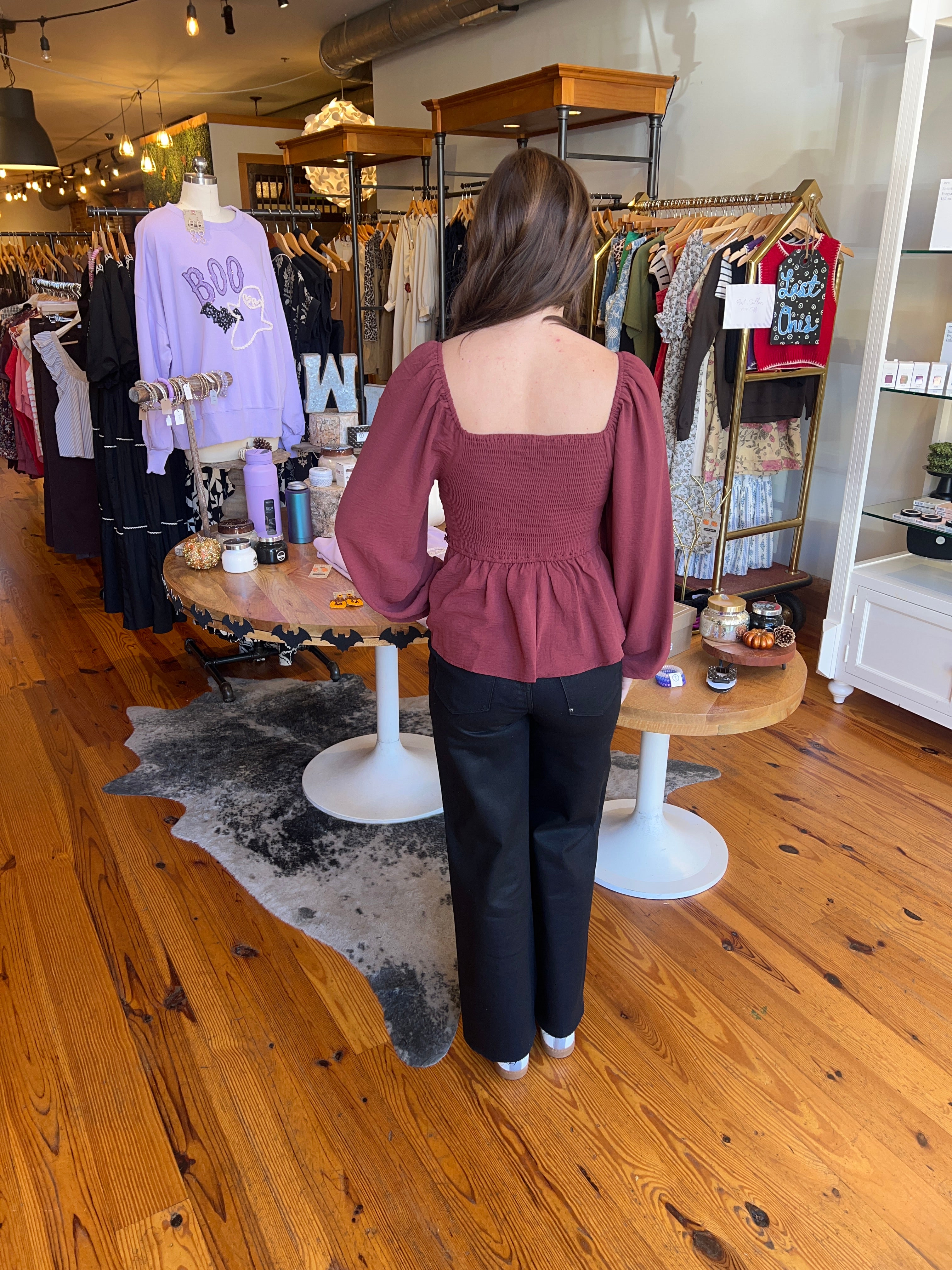 Convertible smocked babydoll blouse with square neck or off-the-shoulder styling. Features crinkled woven fabric, mini ruffle detail at bust, and long balloon sleeves. Versatile for work or weekend wear.