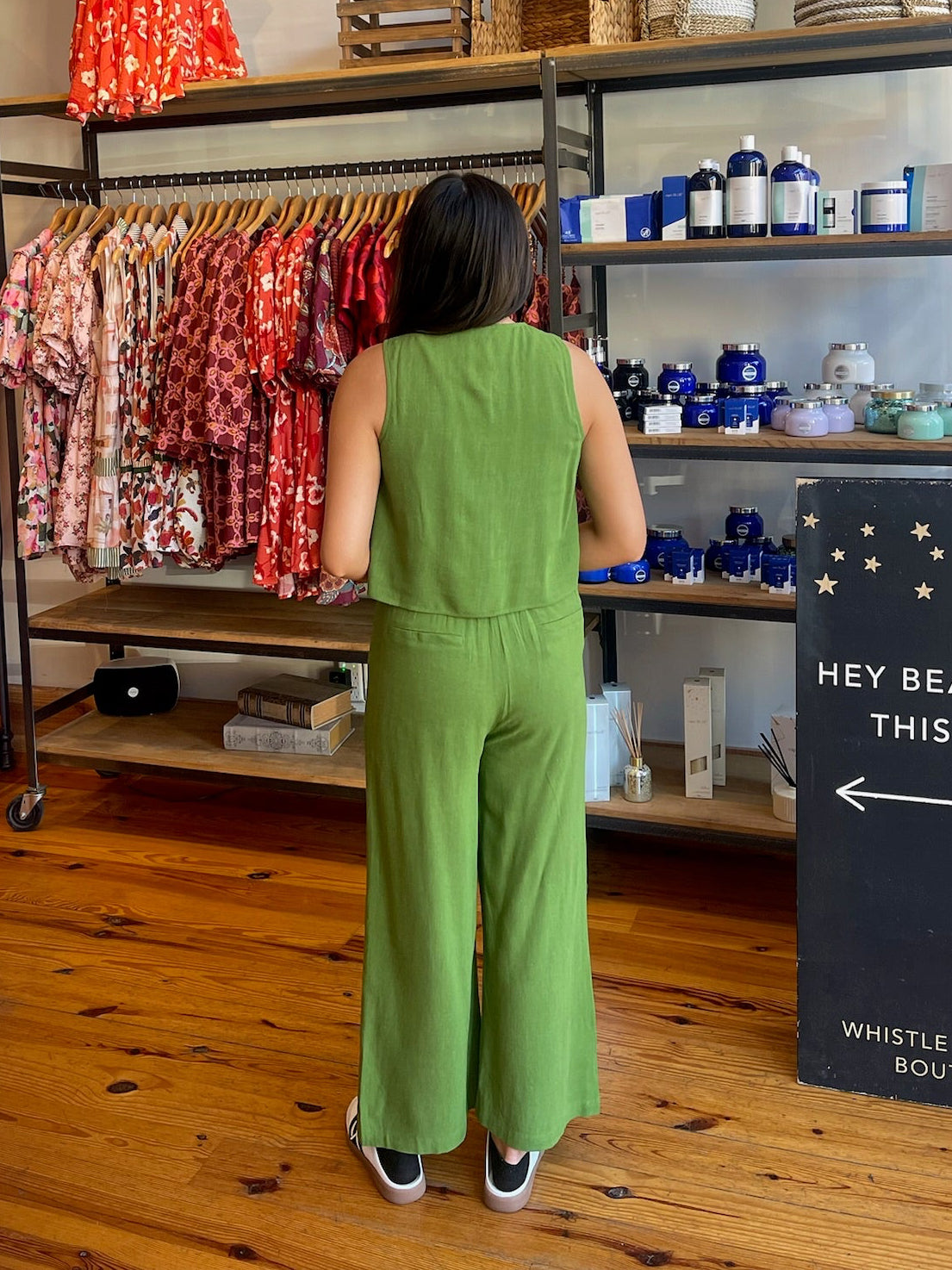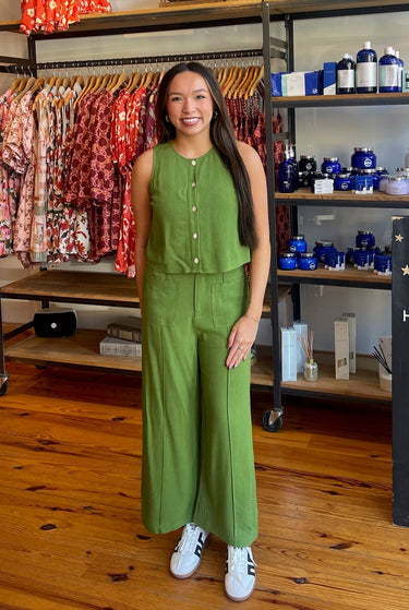 Solid sleeveless woven top featuring button closure at front. Lined. Woven. Non-sheer. Lightweight.