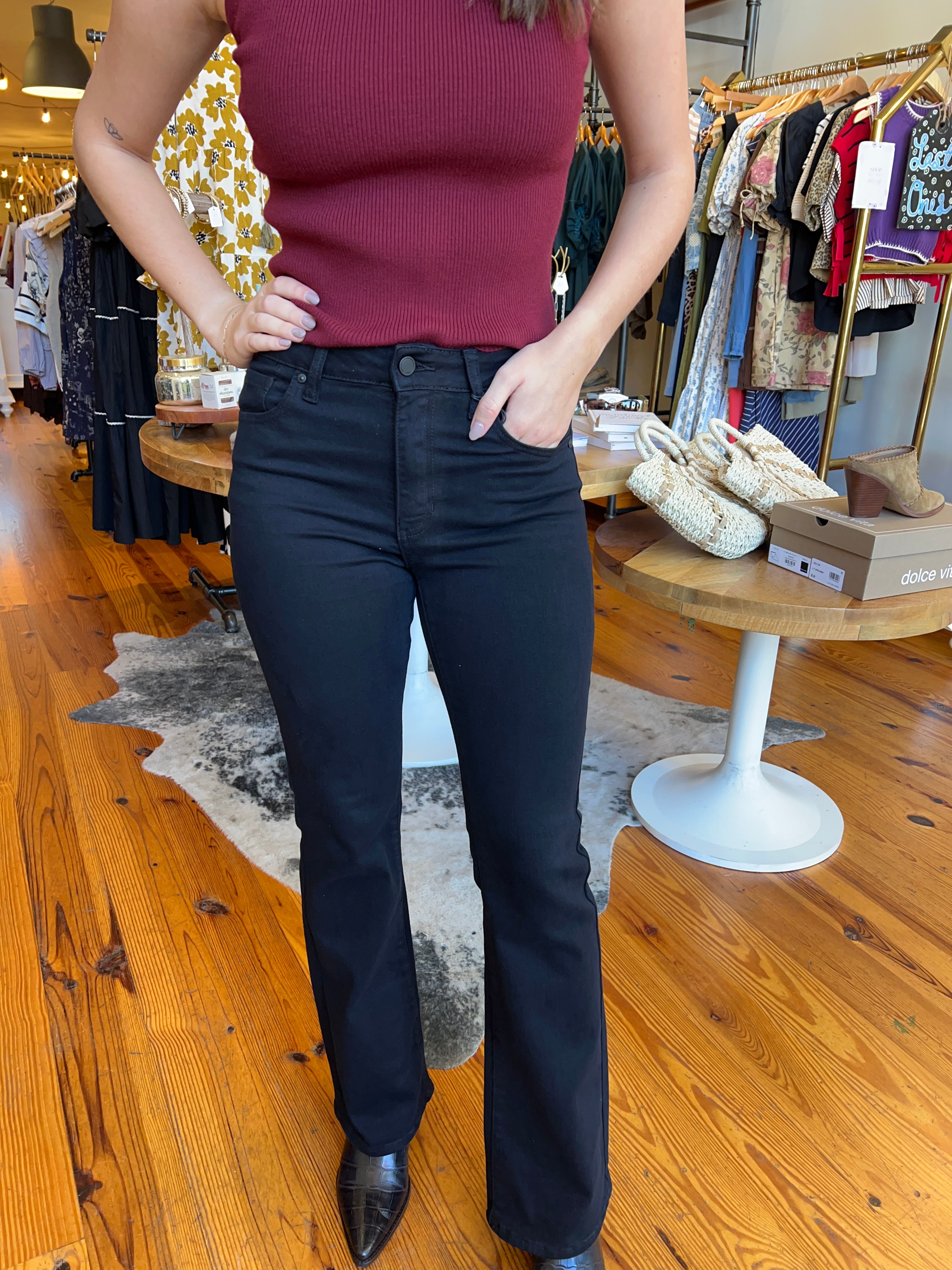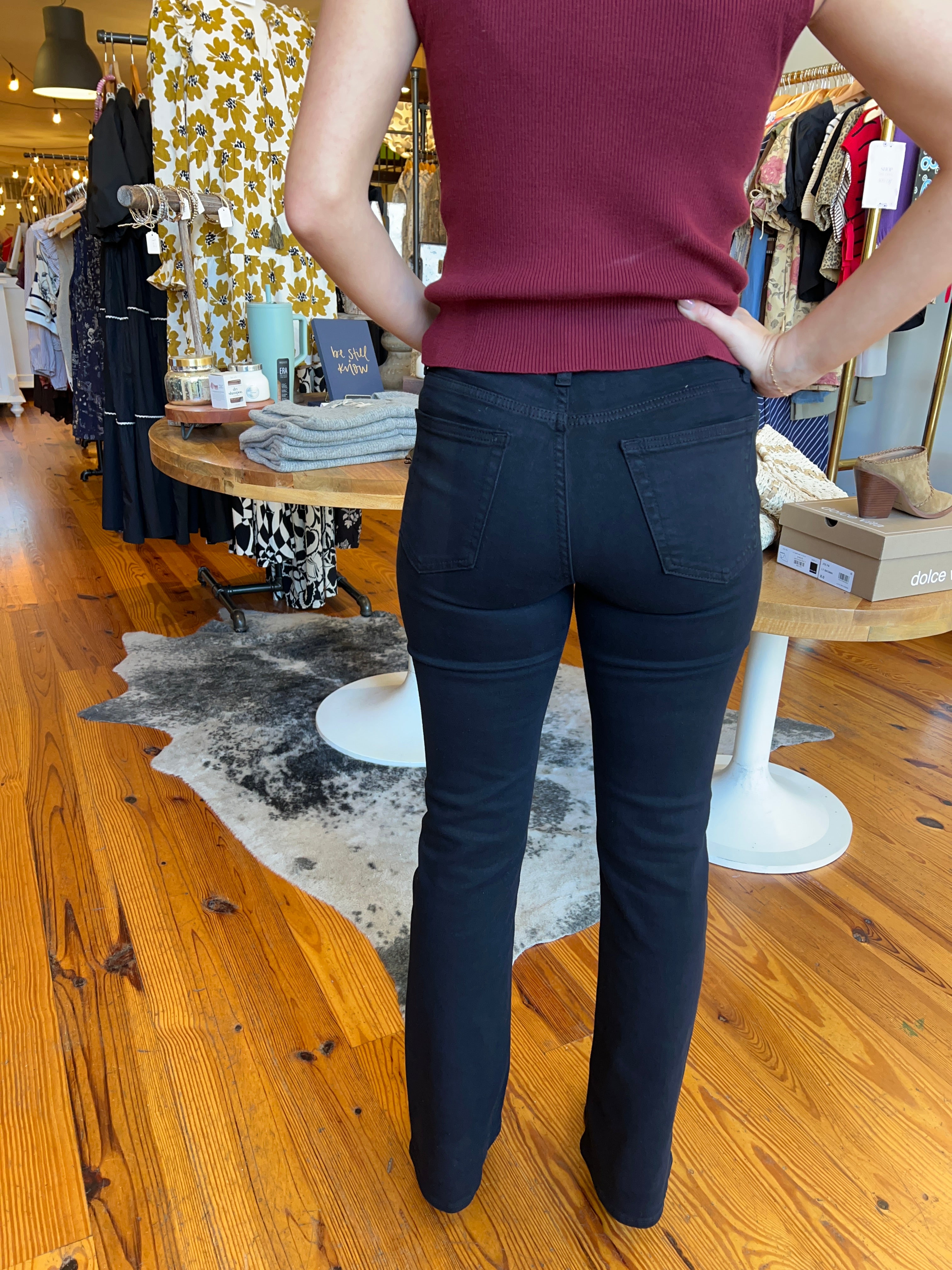 Designed with a flattering mid-rise waist and a clean, elongated bootcut silhouette, this jean effortlessly balances comfort and polish. They hug the hips and thighs before a subtle flare at the ankle, finished with a clean regular hem for versatile styling.