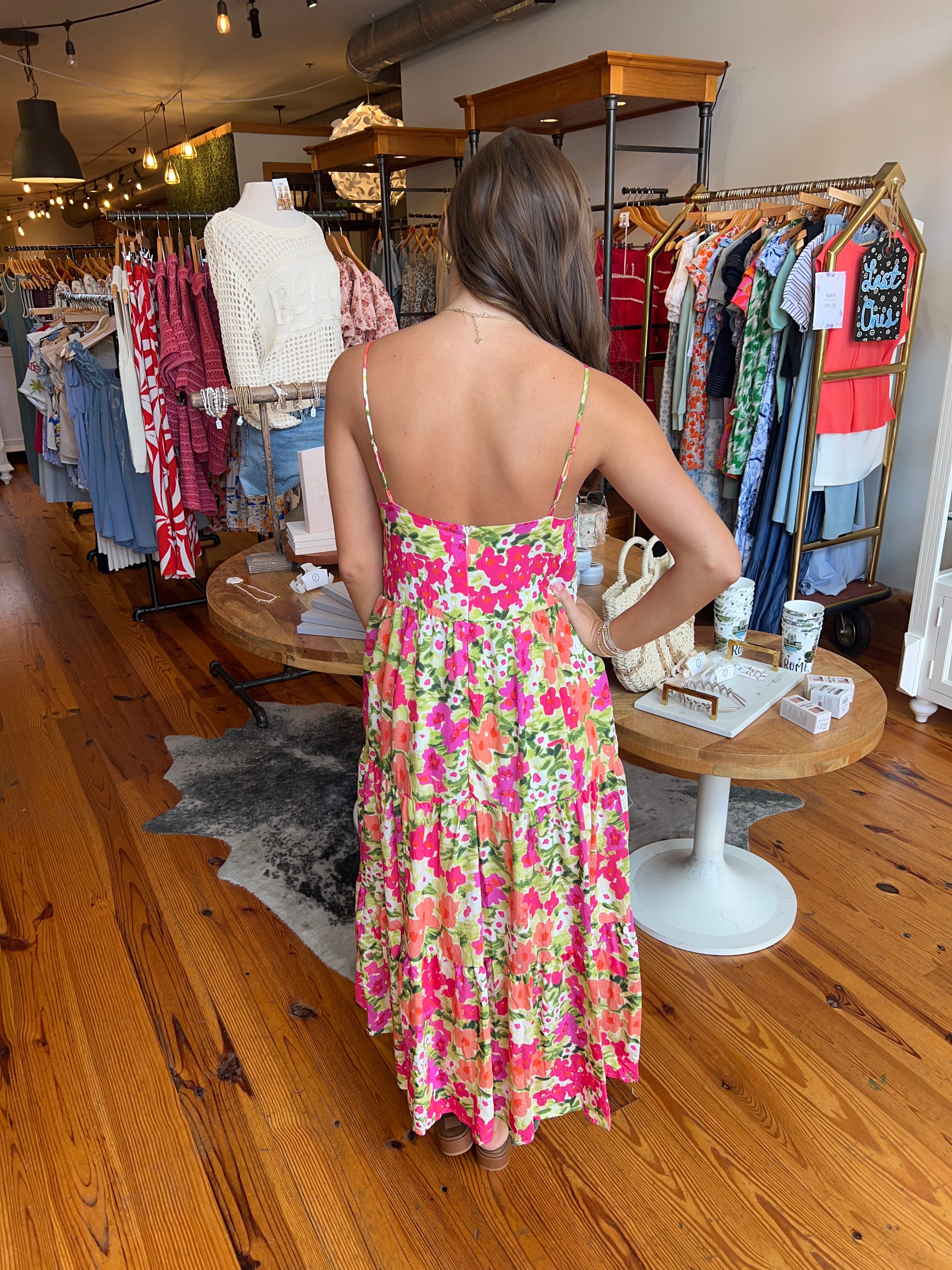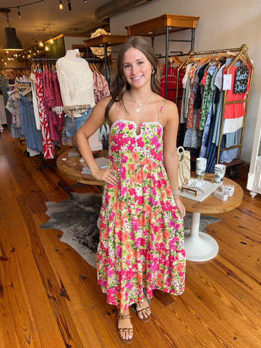 Floral print adjustable spaghetti strap midi dress with contrasting stitch detailing along the neckline and a hidden back zipper.
