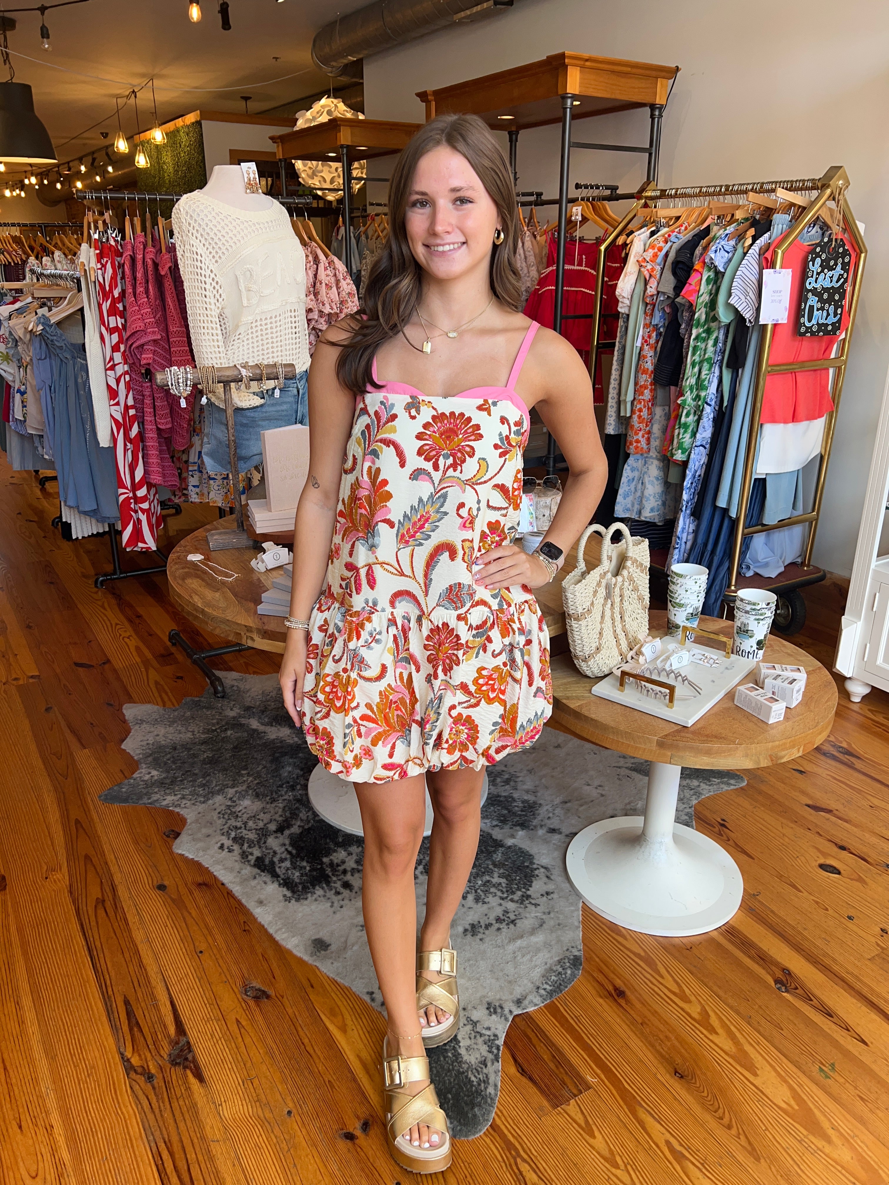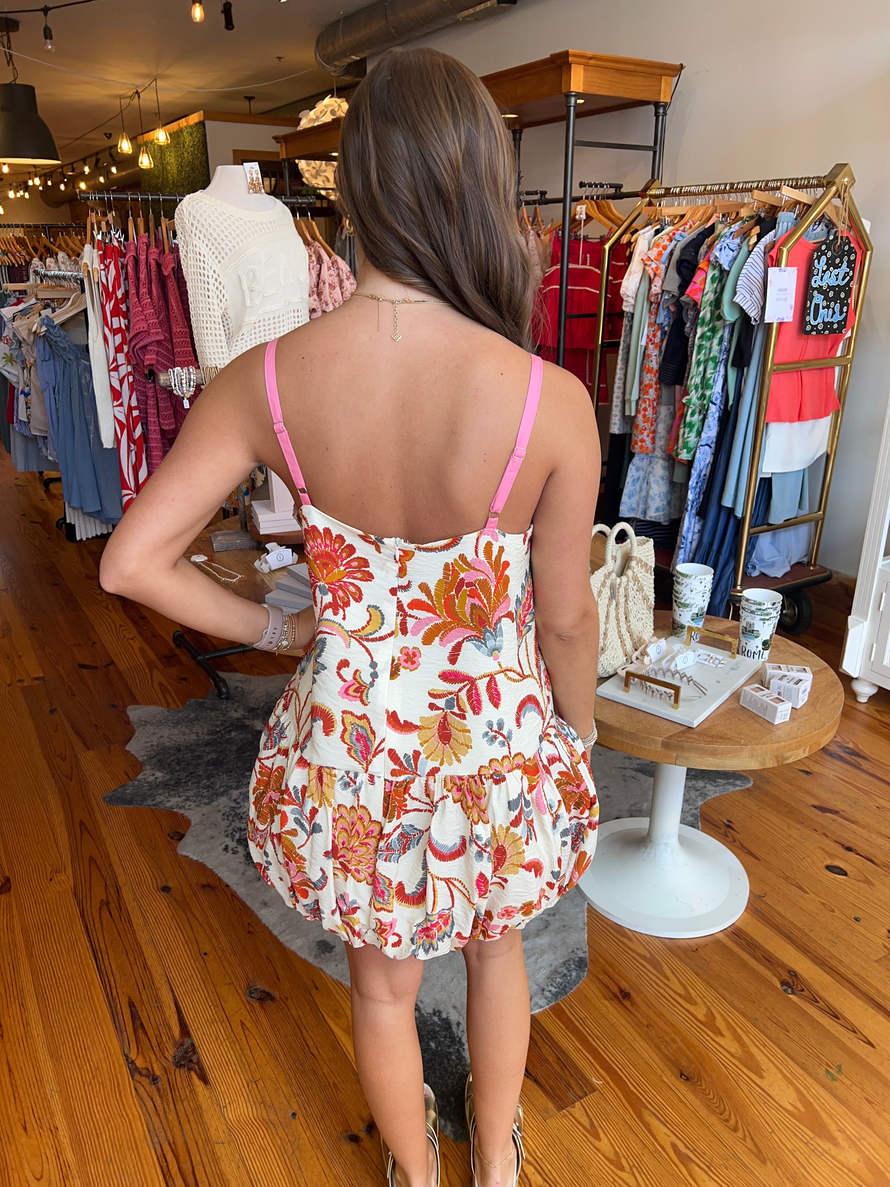 This floral mini dress features a soft bubble hem, vibrant vintage-inspired blooms, back hidden zipper, and adjustable pink straps for a playful contrast.