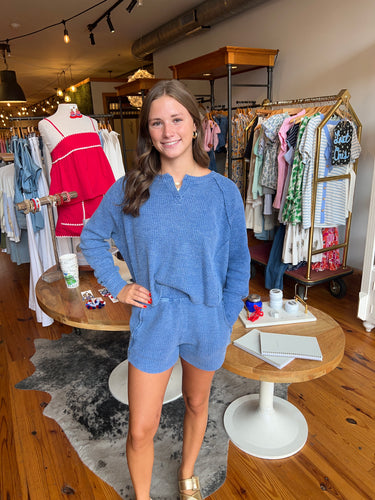 Made from mineral washed cotton waffle fabric, this cozy set includes a long sleeve pullover and matching shorts. Featuring raw edge details, this set offers a stylish, laid-back look that's perfect for relaxing at home or casual outings.