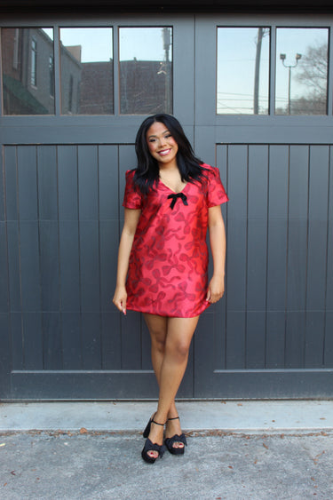 Step into the spotlight this holiday season with the Jeanette Dress! Featuring short sleeves, a festive bow print, and a flattering mini length, it’s the perfect mix of classy and fun. Just slip on some heels, and you’re all set to steal the show!