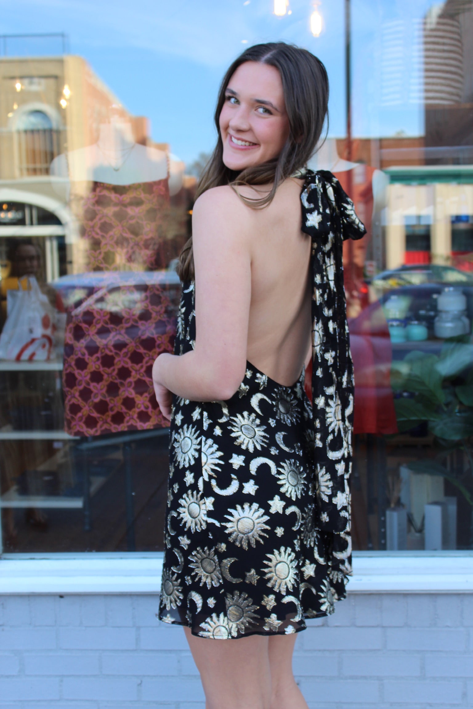 She's here! Our bestselling maxi is now available in a mini length! The Lisa Mini stuns with a chic halter neckline, fluttery scarf tie, and dramatic open back, all finished with an eye catching celestial print. It’s the new must-have for every special event on your calendar!