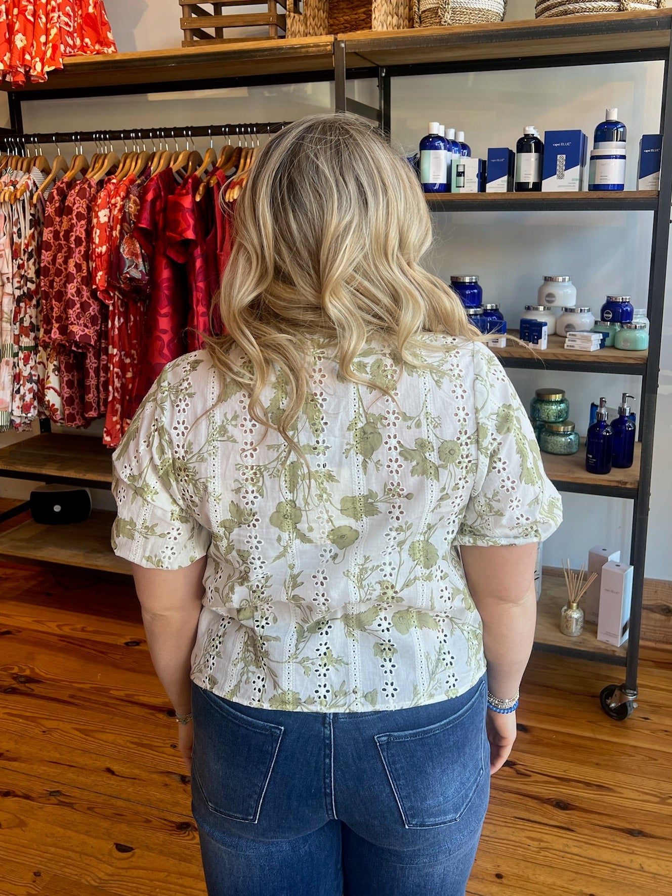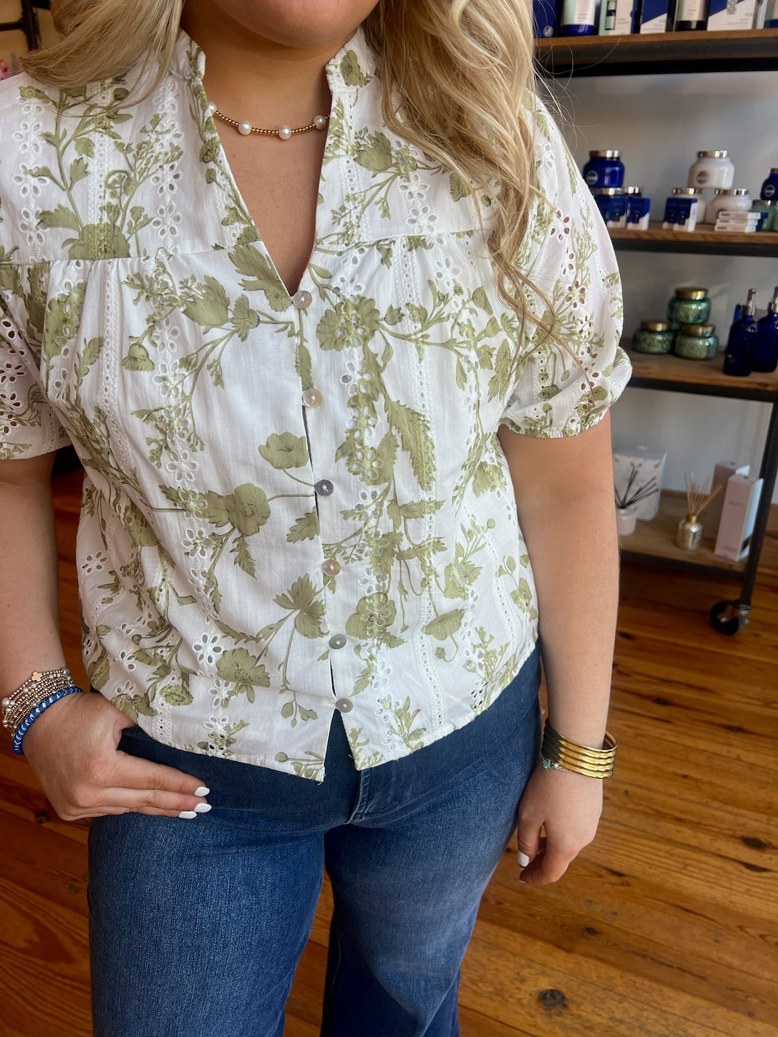 Floral eyelet puff sleeve top featuring V-neck yoke and front button closure. Elasticated cuffs. Lined. Woven. Semi-sheer. Lightweight. 100% Cotton