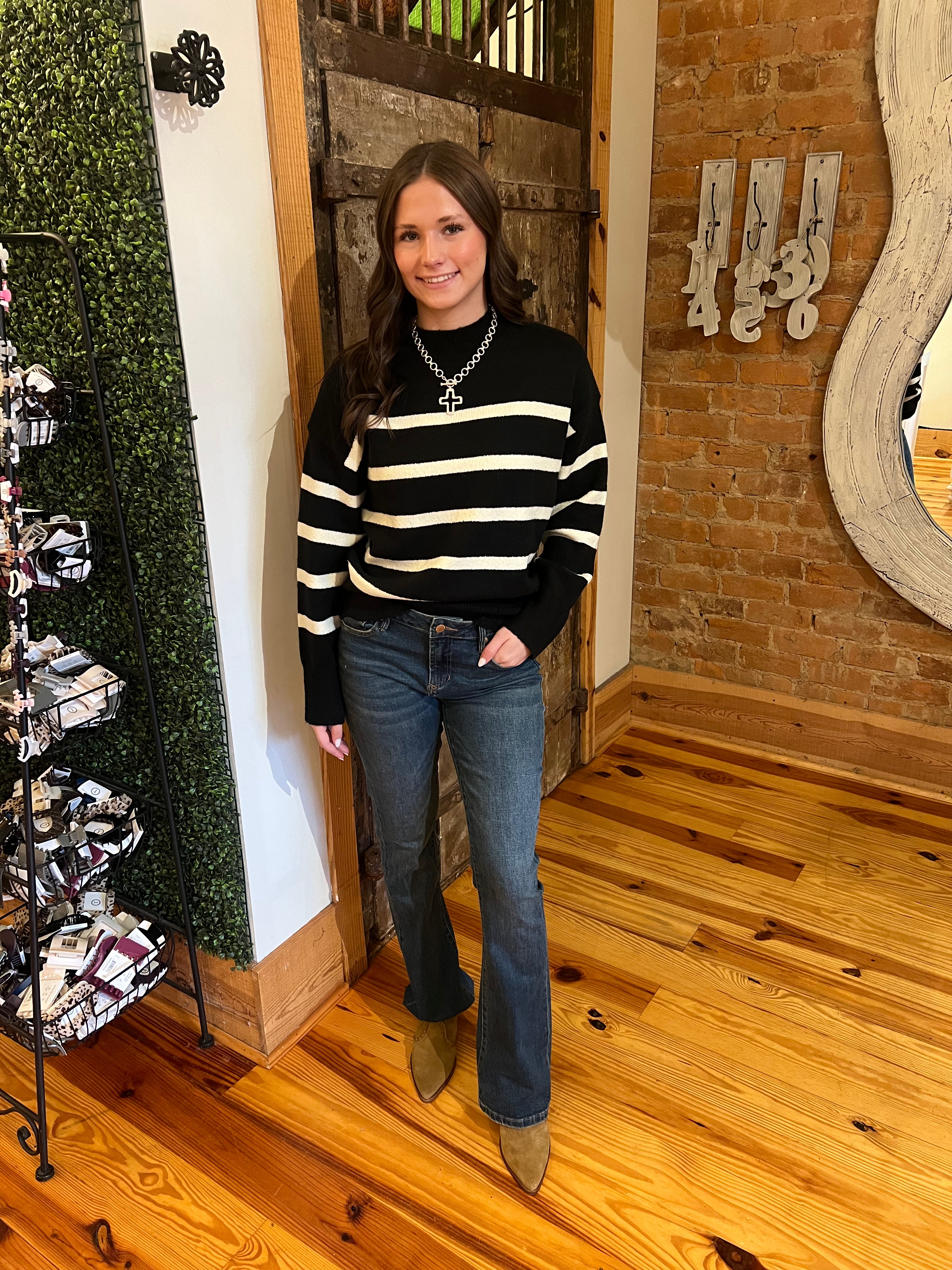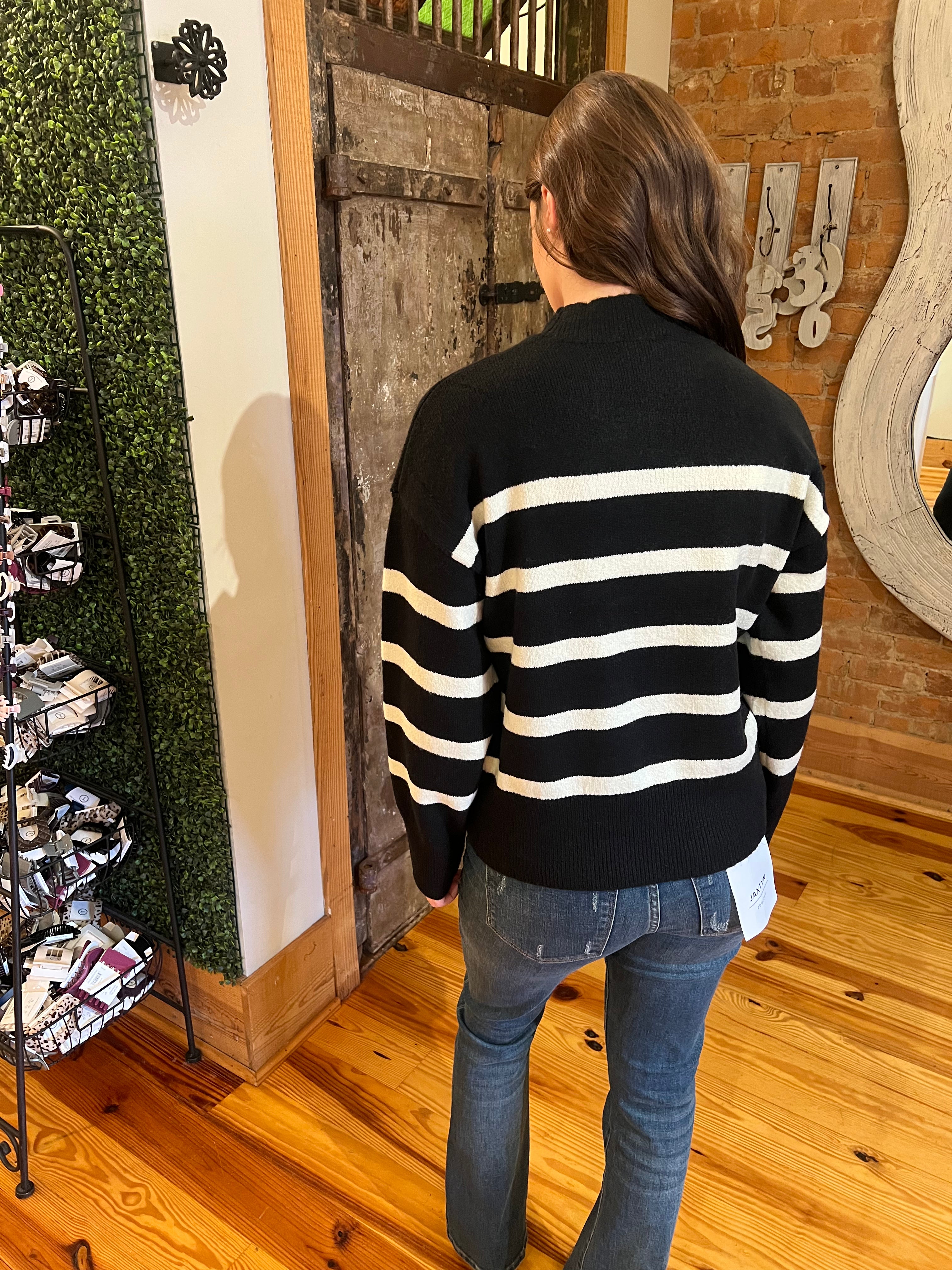 This Sweater Is A Perfect Pick When The Temperature Starts To Drop. A Timeless Stripe Pattern Gives This Otherwise Classic Piece A Cool And Contemporary Feel. It Features A High Neck, Long Sleeves, Drop Shoulders, And A Flattering Fit.
