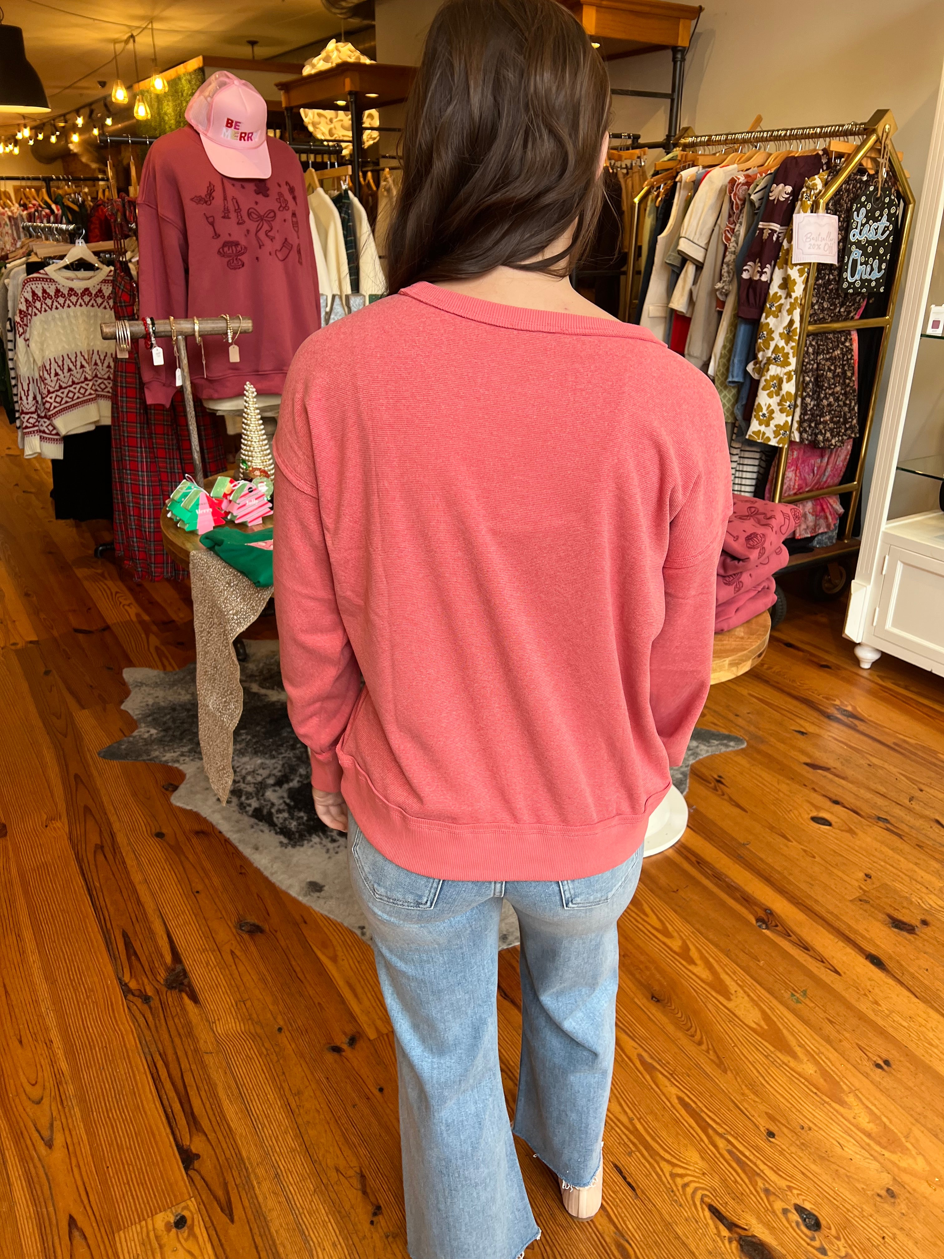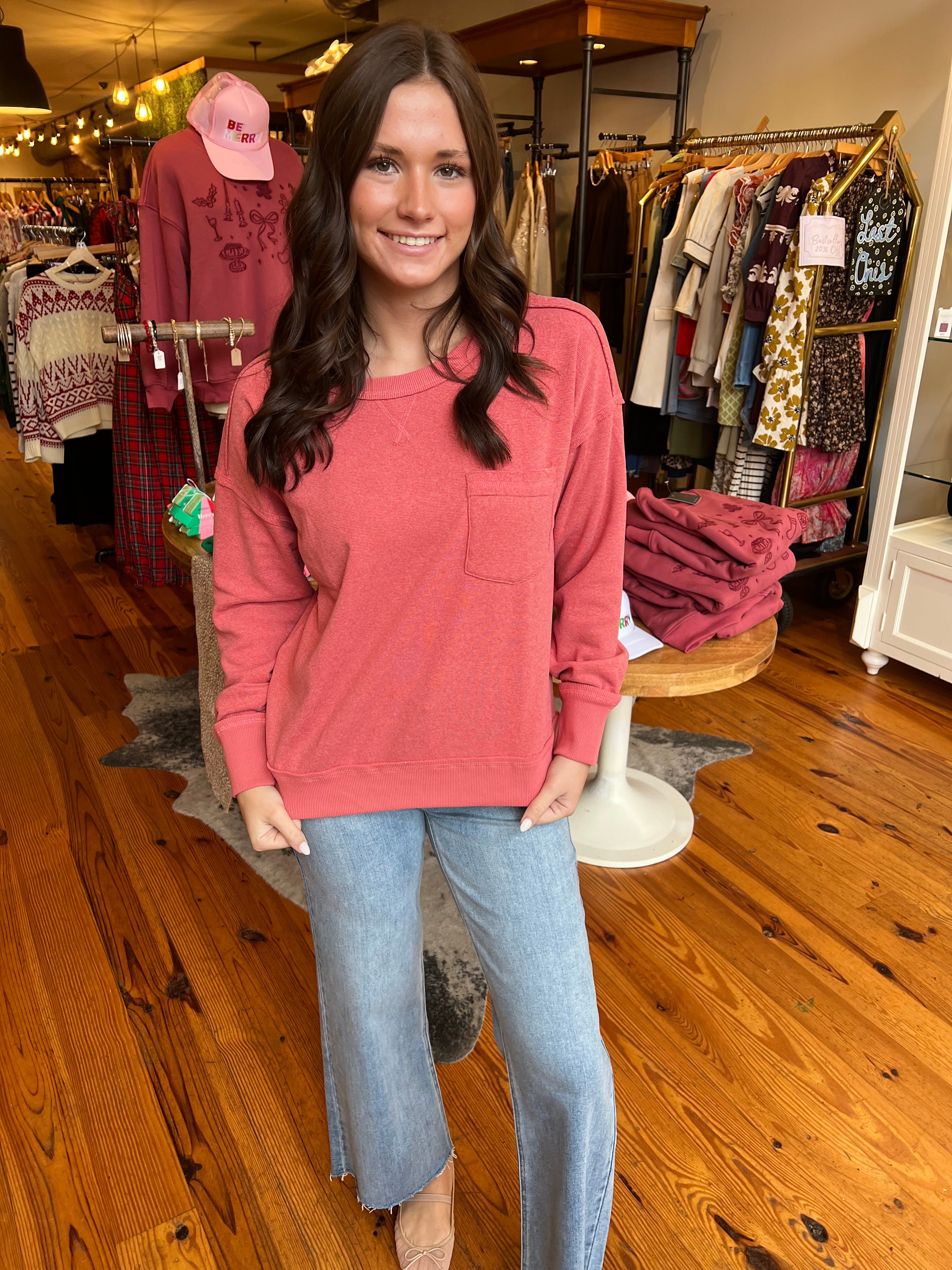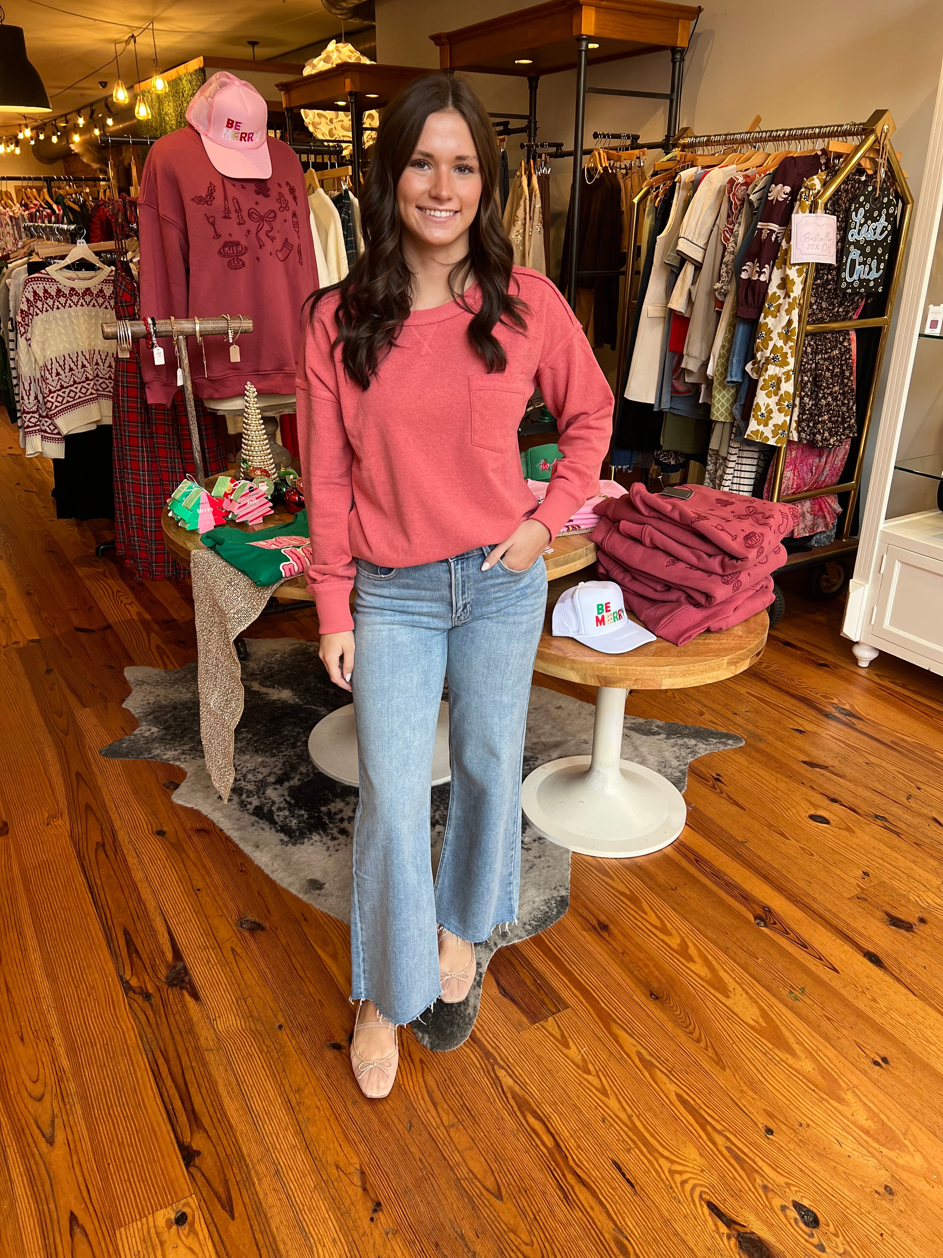 WIDE CREW NECK, EXPOSED STITCHING, LONG SLEEVE, SUPER COZY PULLOVER KNIT TOP