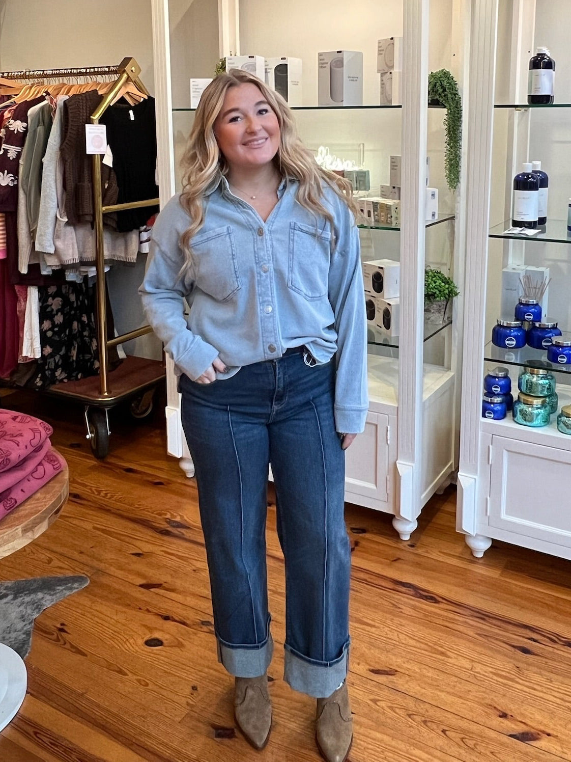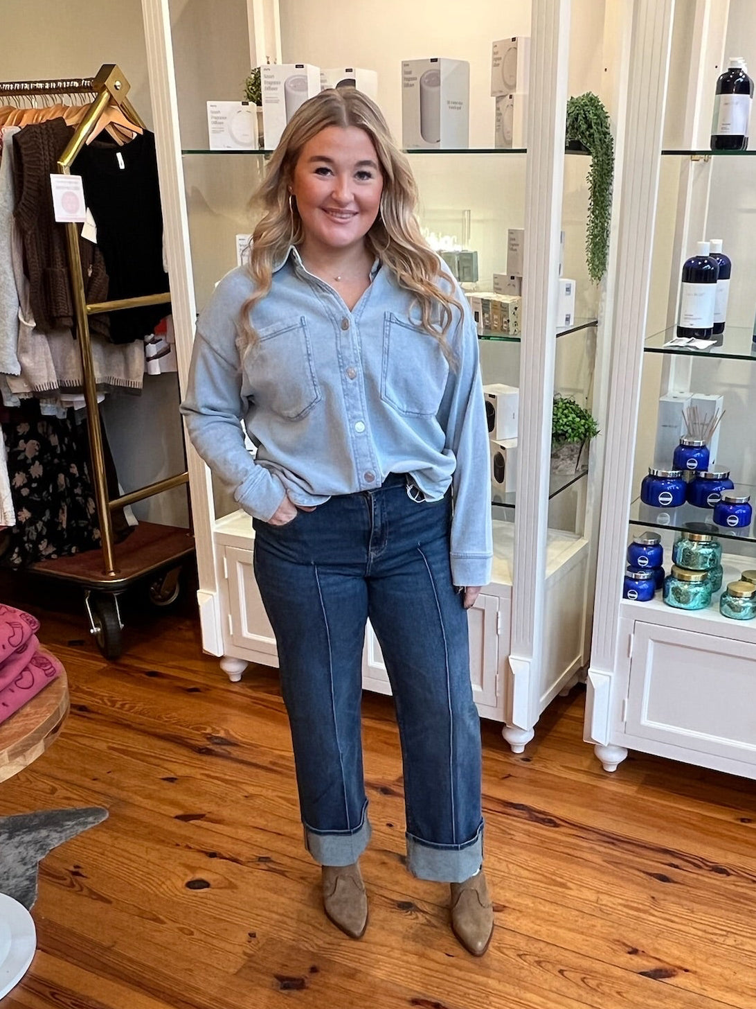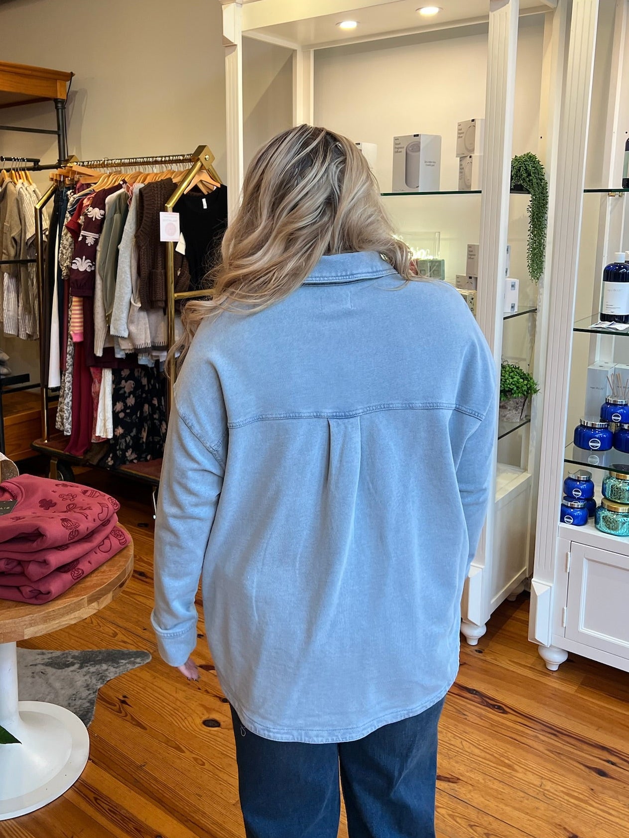 Our All Day jacket is a best seller, especially in our knit denim french terry fabric. This relaxed shirt jacket can be worn open or buttoned for a versatile layer you'll want to live in all year.