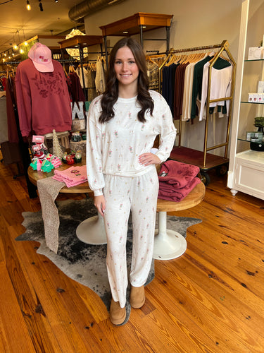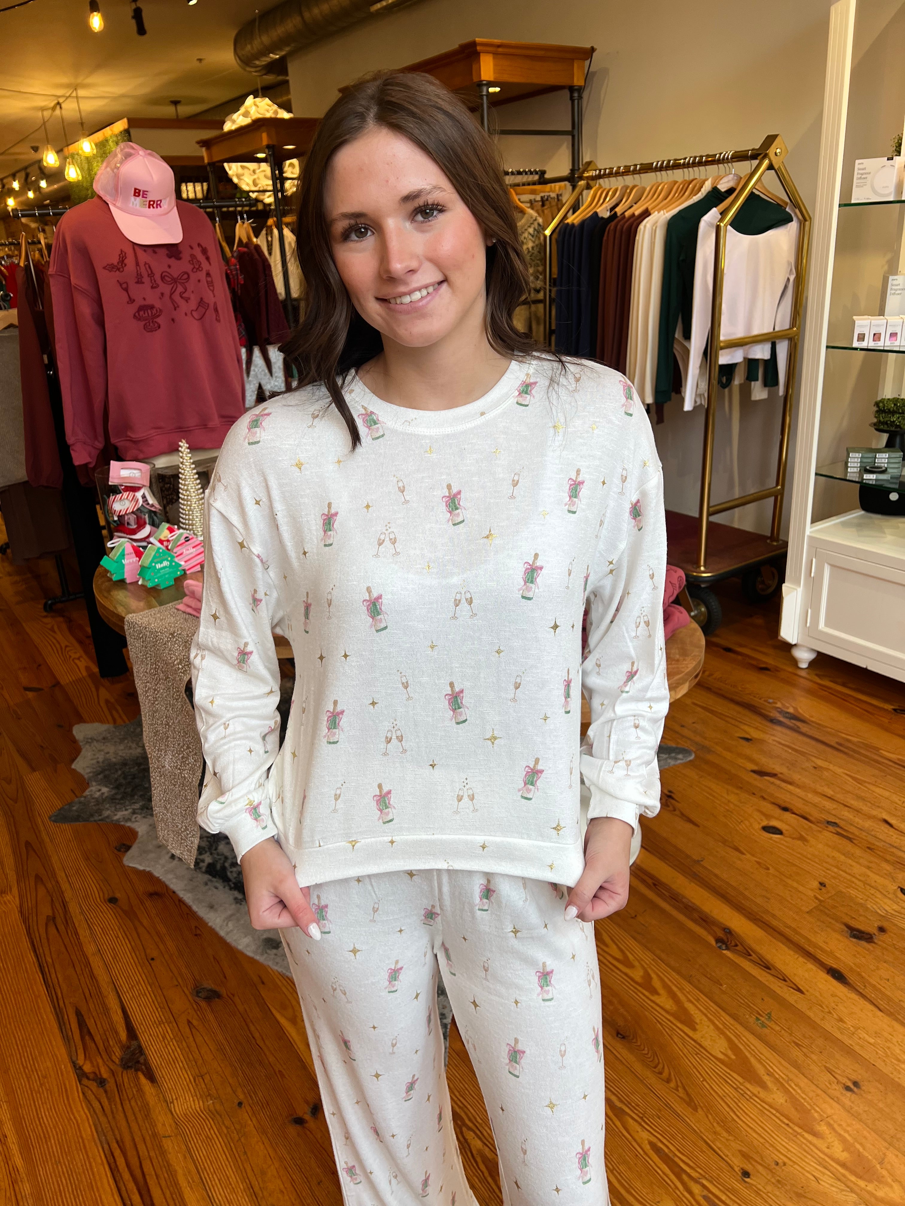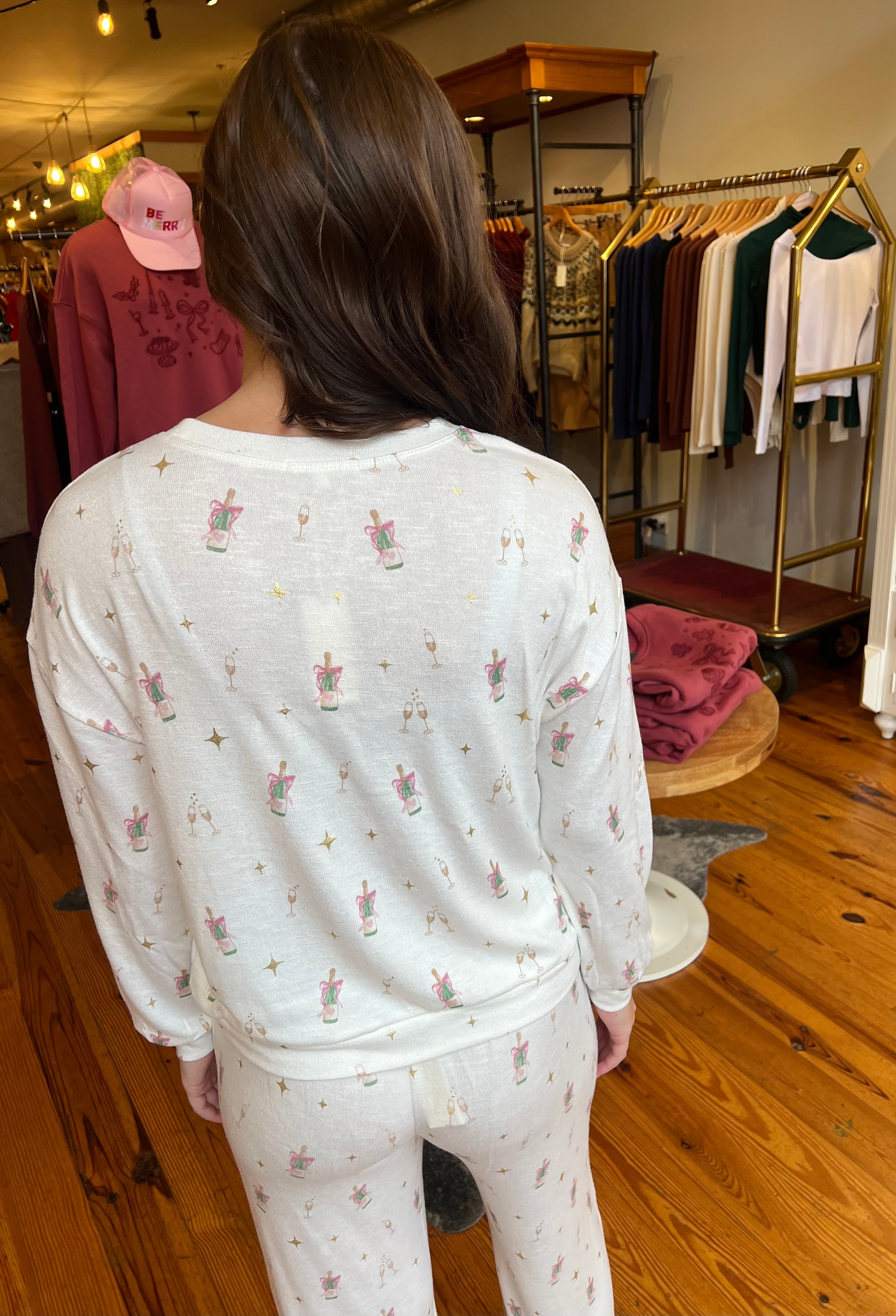 Printed with an allover champagne toast motif, this soft slub knit top blends fun and function. Relaxed and comfy, it’s made for sleep-ins, couch hangs, and slow holiday mornings.
