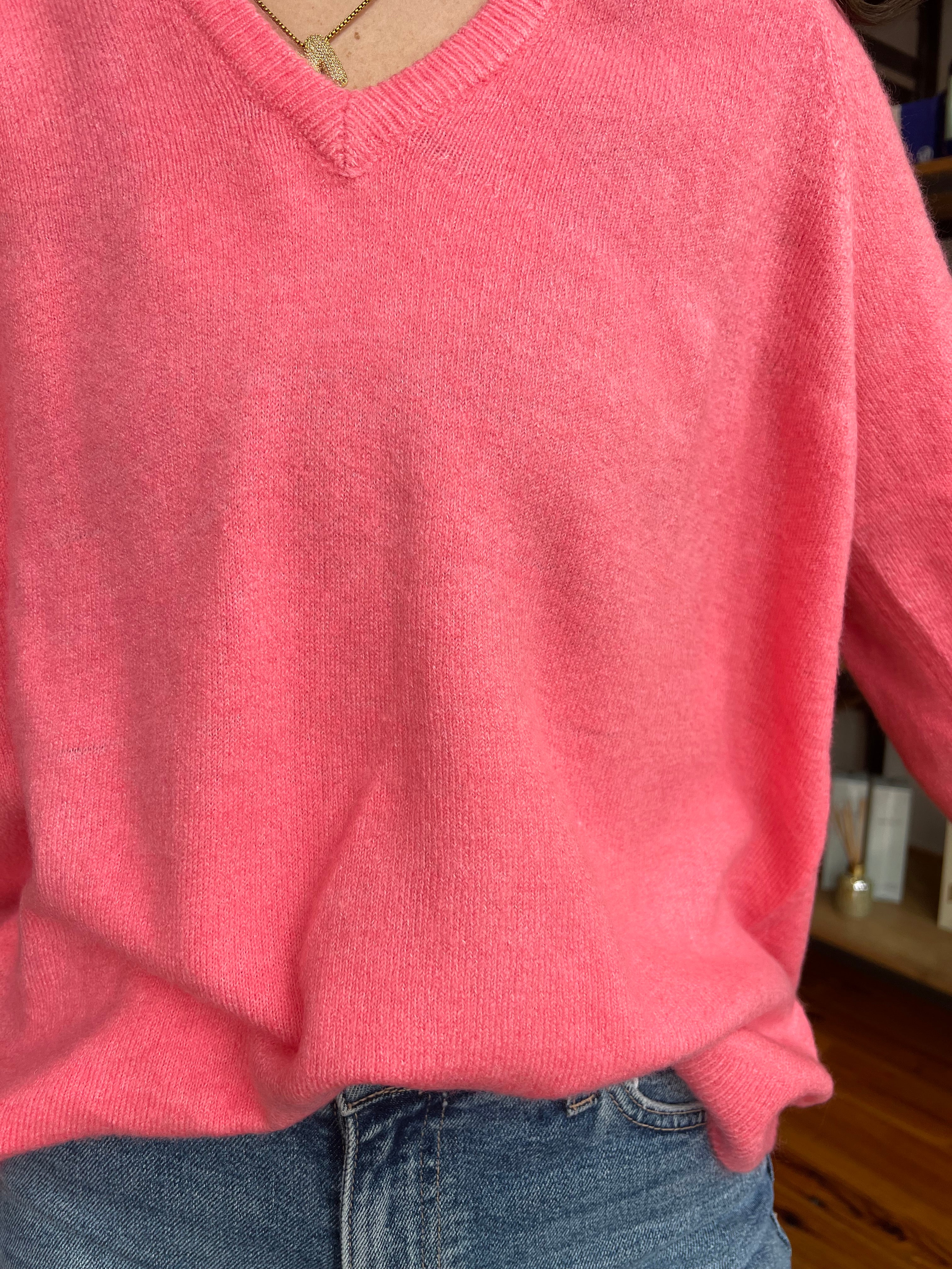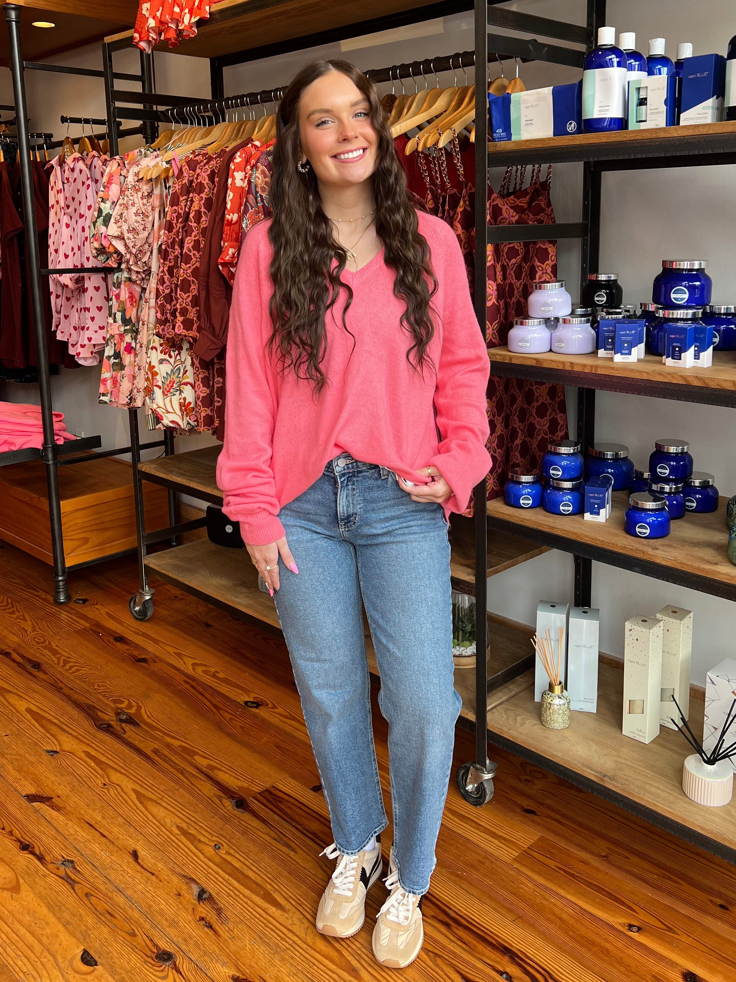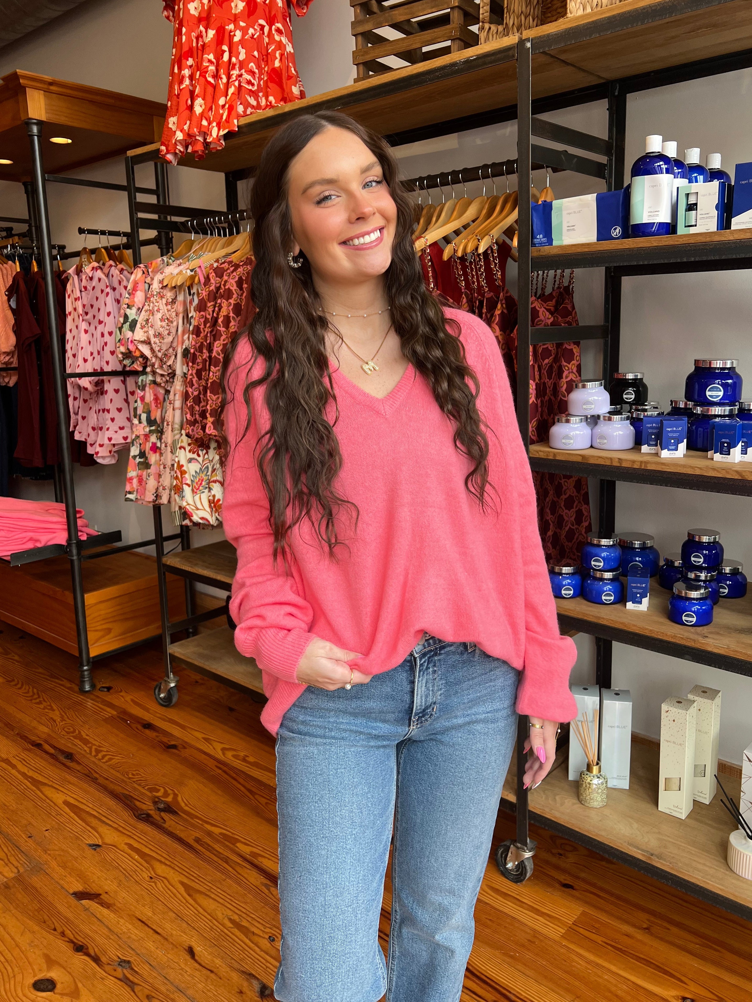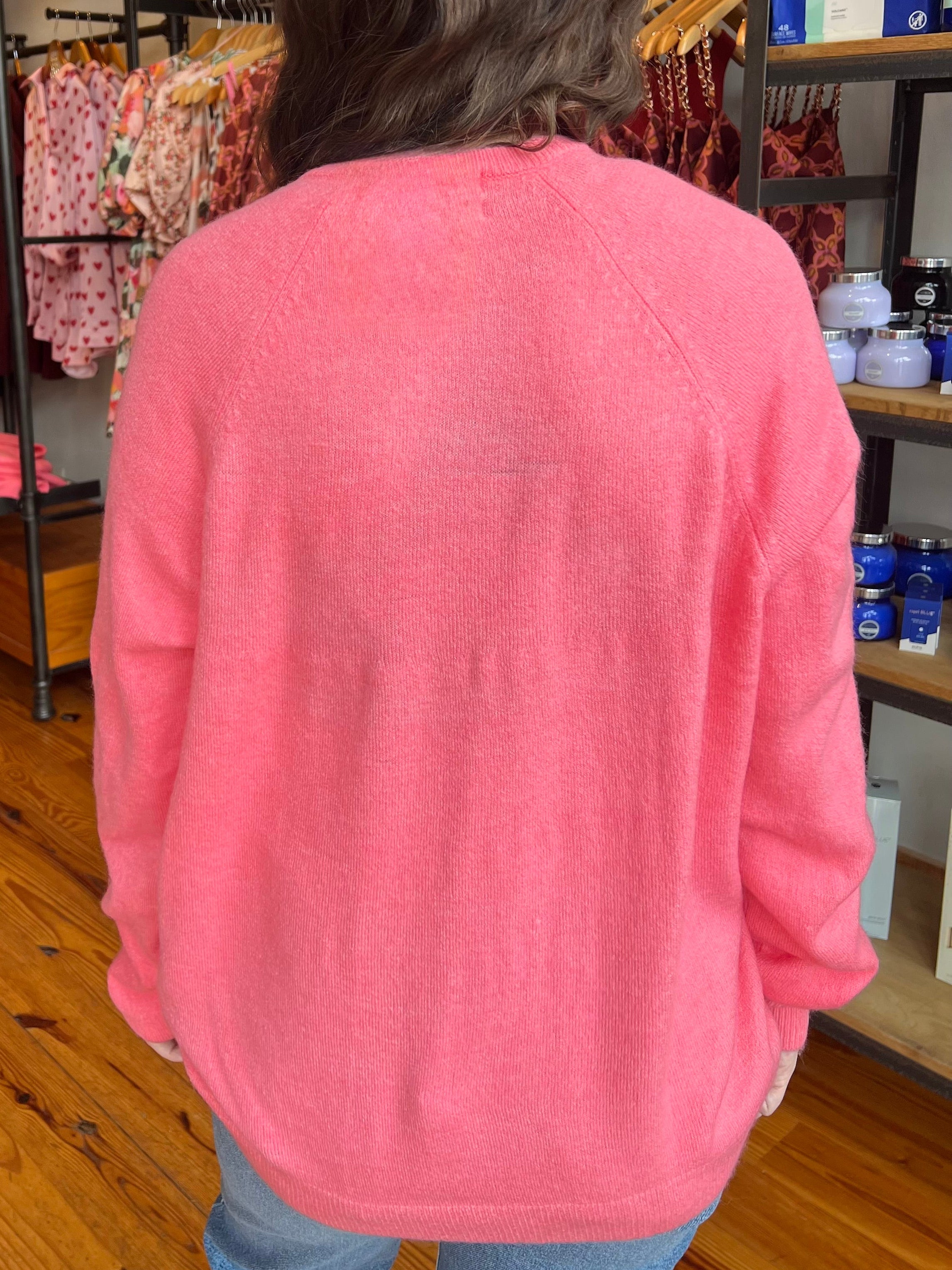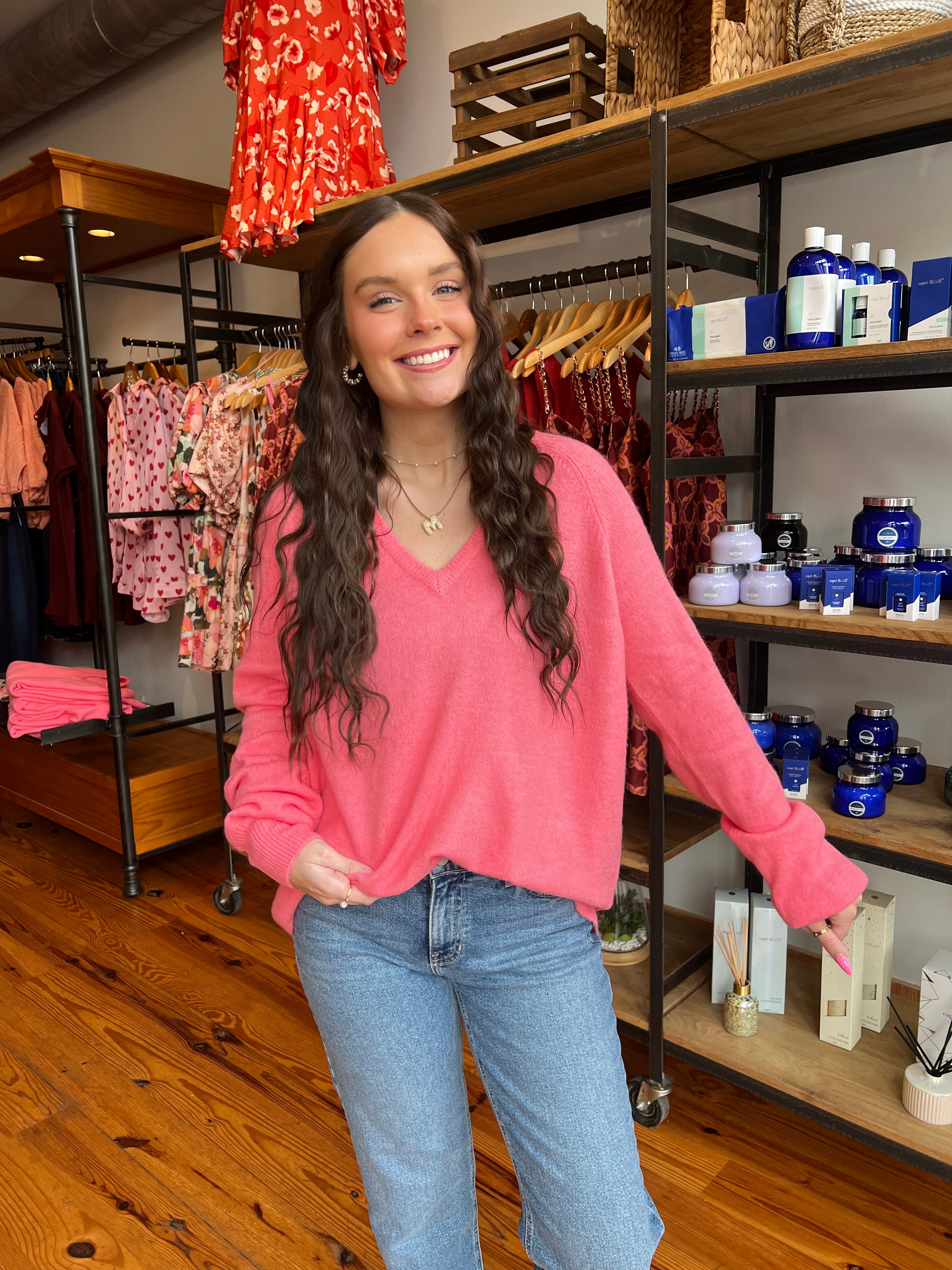 The ultimate cozy companion for chilly nights and crisp mornings! This coral sweater features an oversized fit and a flattering v-neckline. Tuck her into some denim or wear over a cute mini.