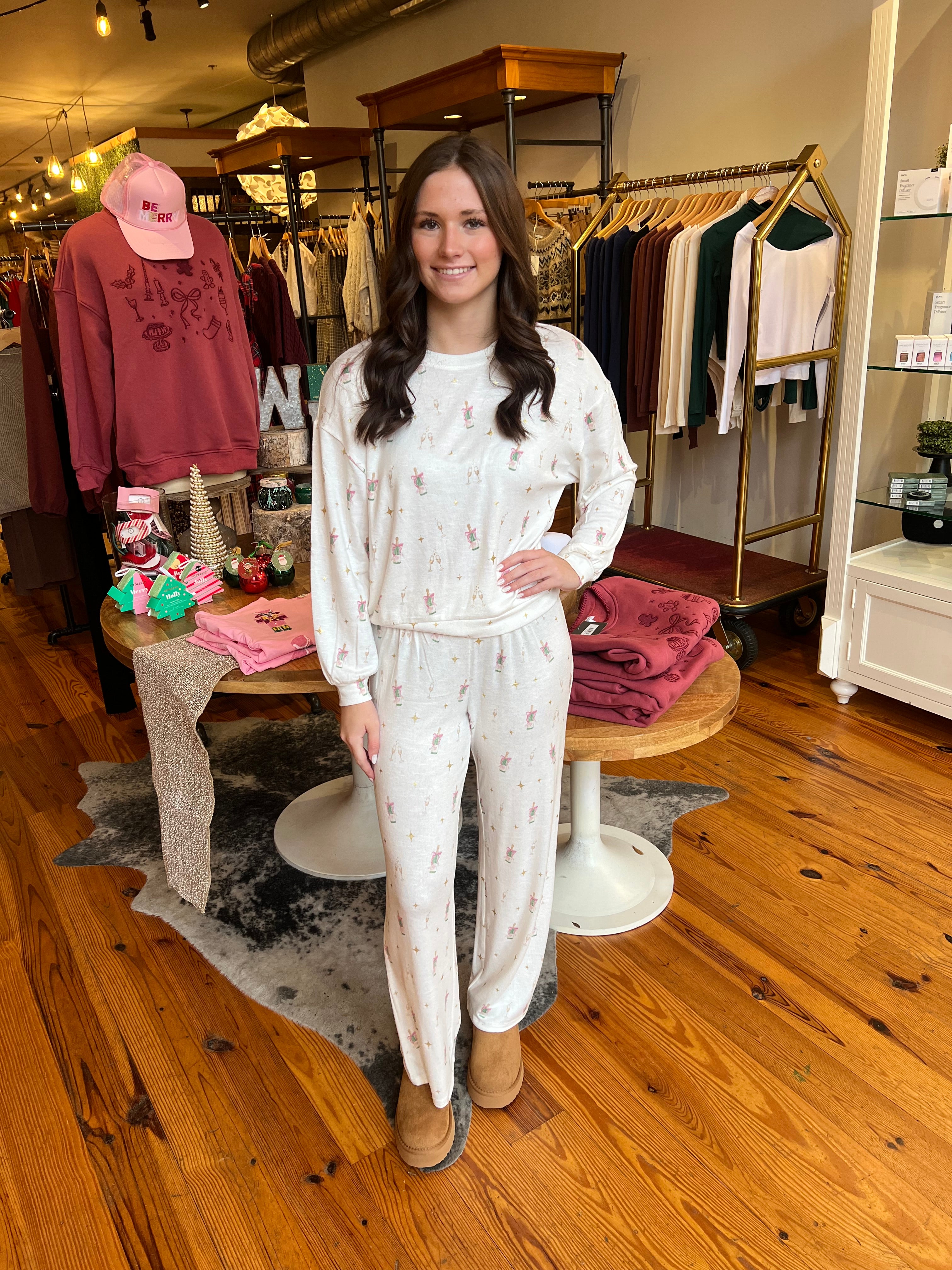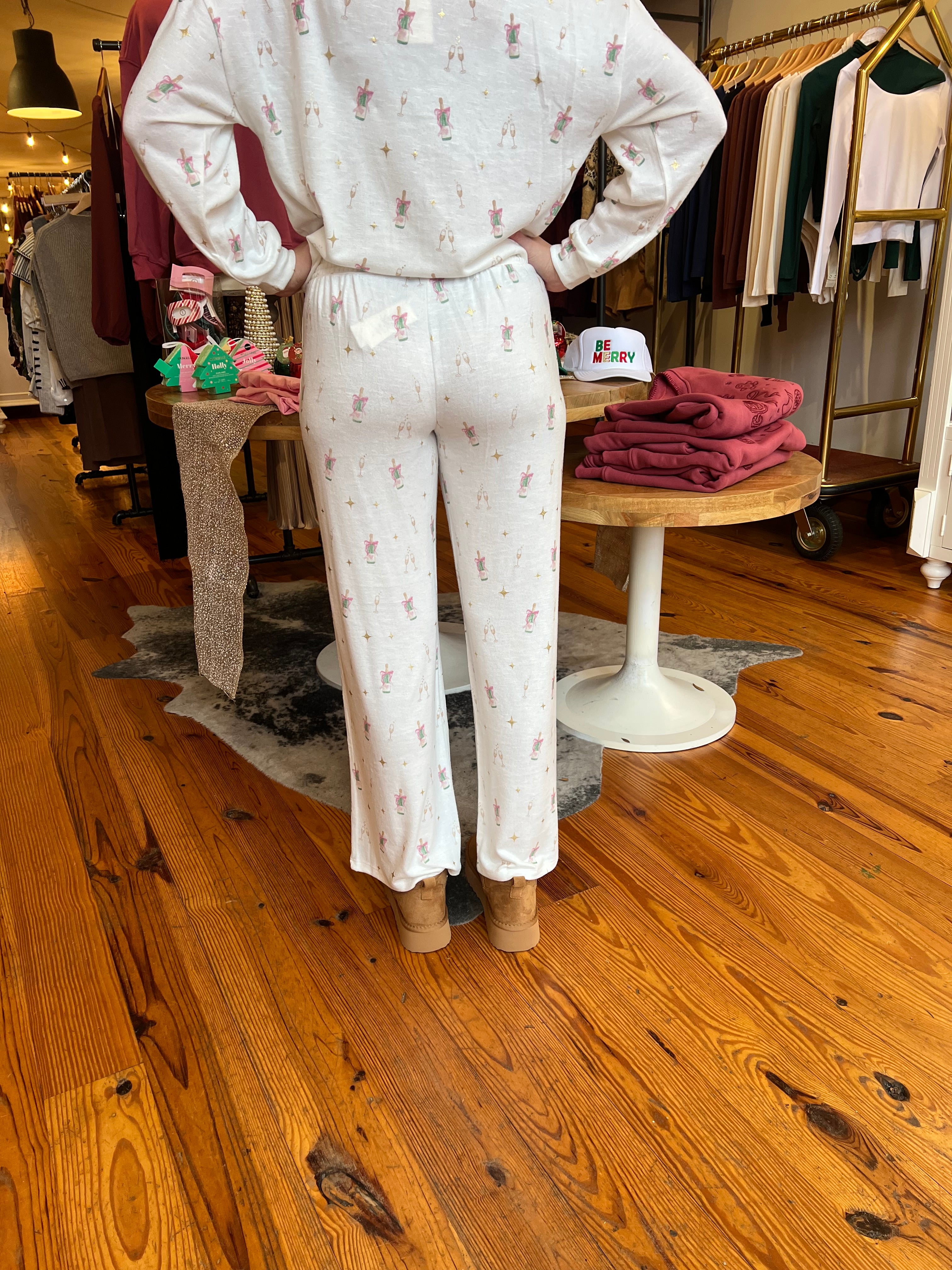 These wide-leg pants are printed with mini champagne bottles and finished with a comfy smocked waistband. The slub knit fabric brings softness with a hint of stretch for relaxing in style.