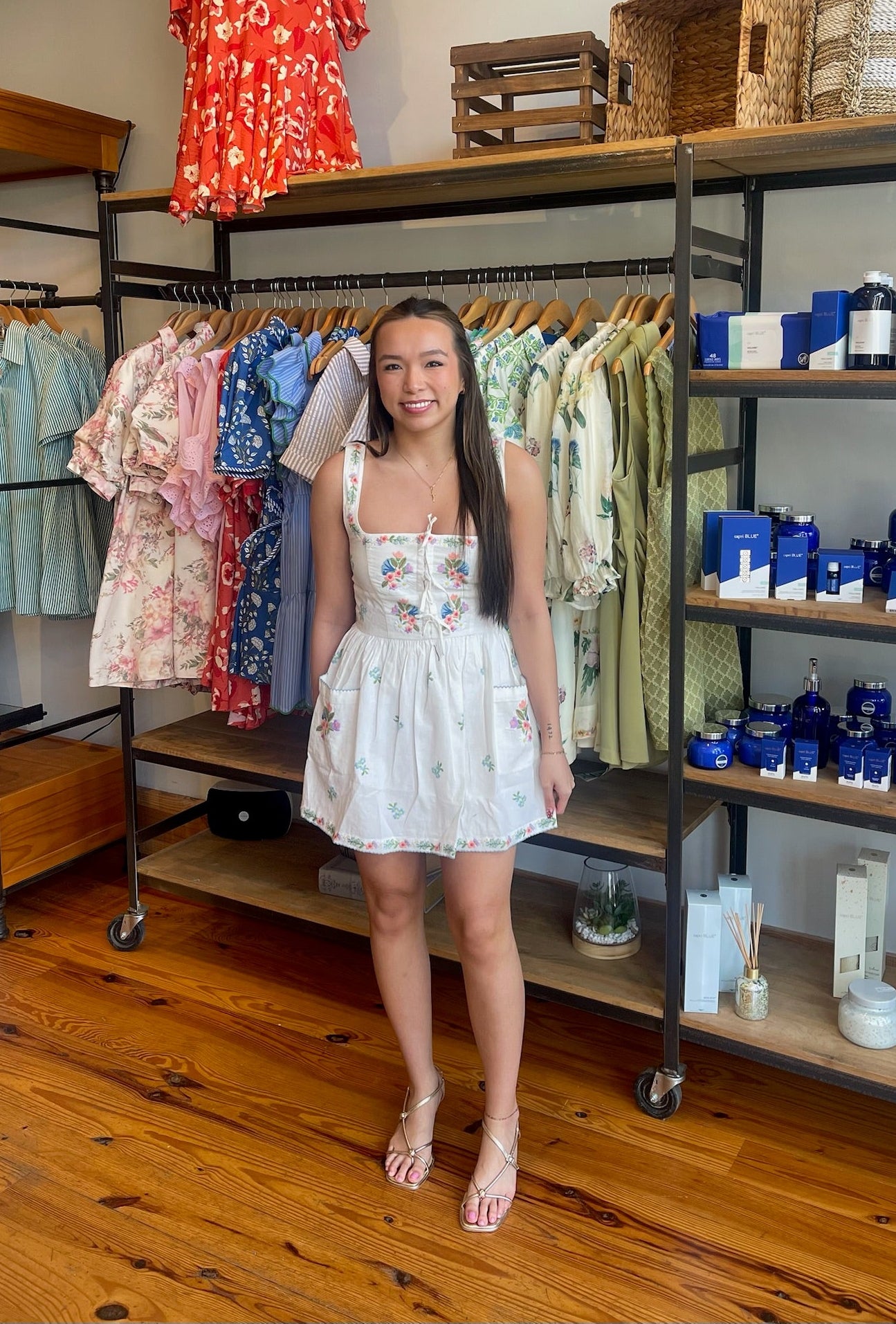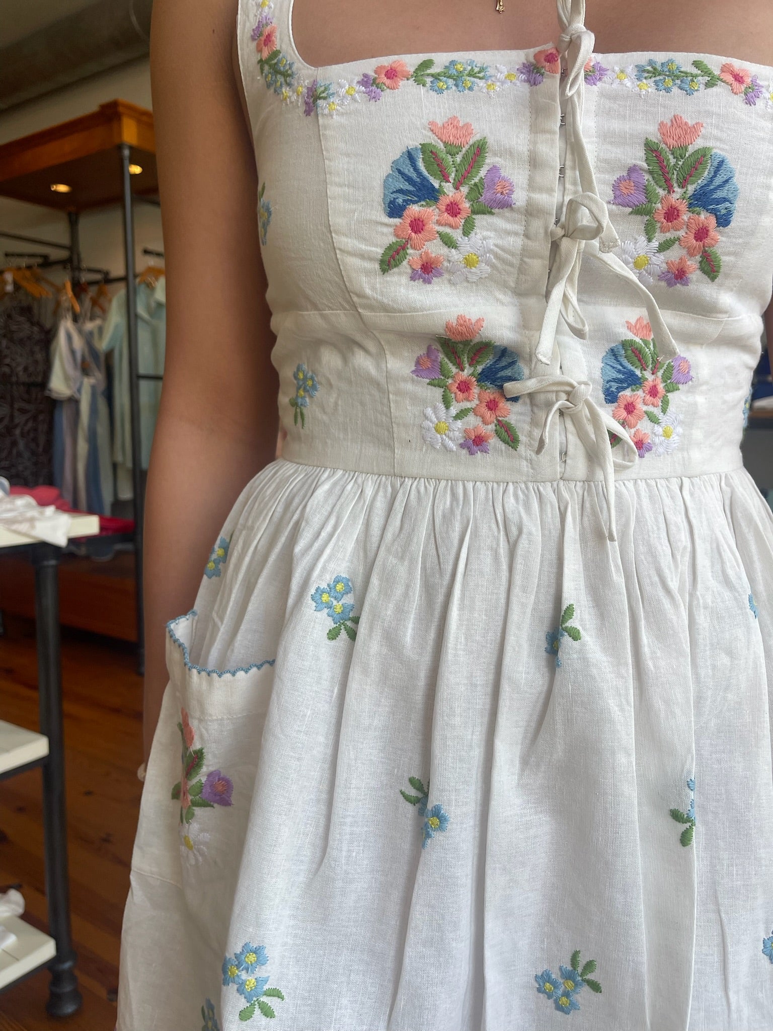 Decorative floral embroidery takes center stage in the Demi Mini! Designed with a corset bodice that hugs comfortably and flatters the waist, plus dainty front ties and side pockets, this charming mini is as romantic as it gets. Perfect for a breezy afternoon, it pairs just as well with sleek heels as it does with simple flats.